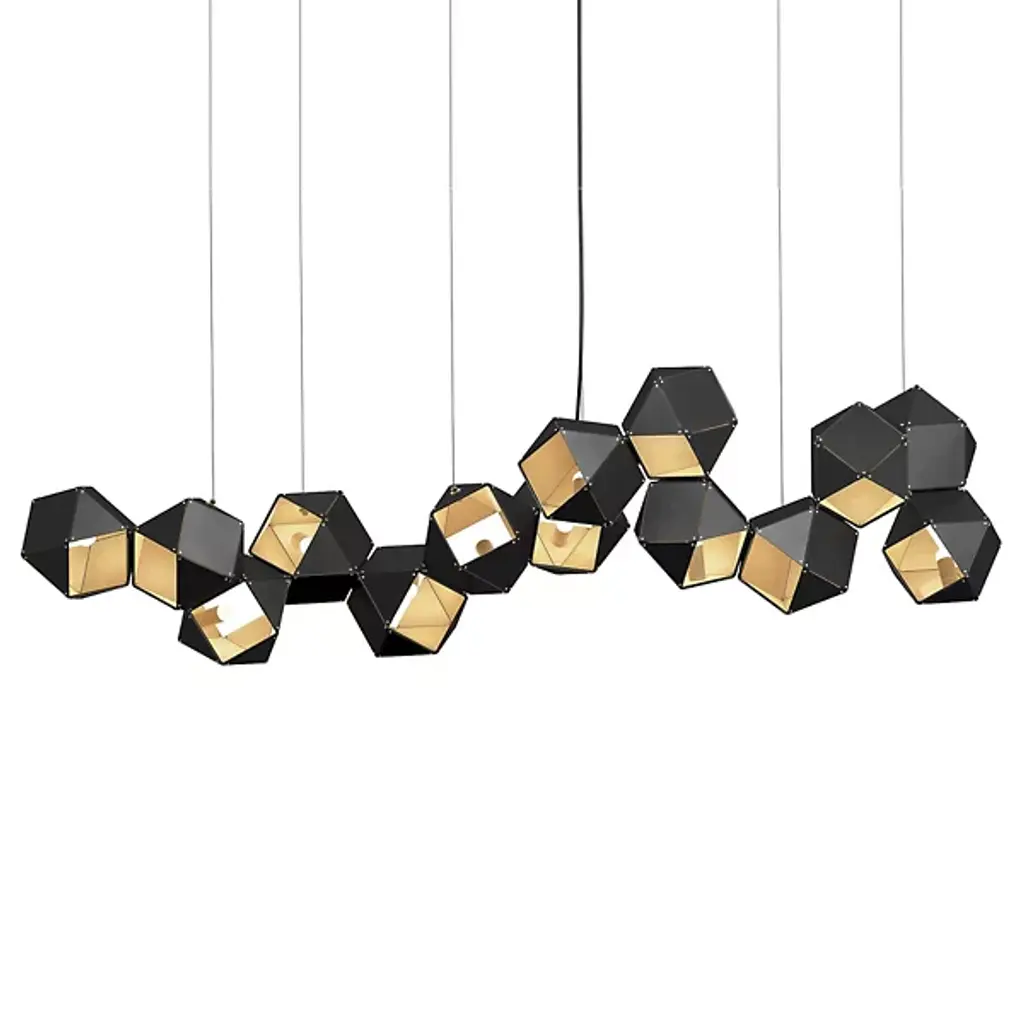 The Welles 18/20/22 Steel Long Chandelier by Gabriel Scott is a dynamic, expansive addition to spaces that is sure to capture the eye. A modern display of expert artistry, this piece features an array of hollowed metallic polygons that interconnect for an effortless, airy, modular configuration. Simply suspended for a lightweight look, these geometric shades are finished with a bold, beautiful finish that highlights their multifaceted, dimensional shape as they provide a welcoming layer of illumination to surroundings.