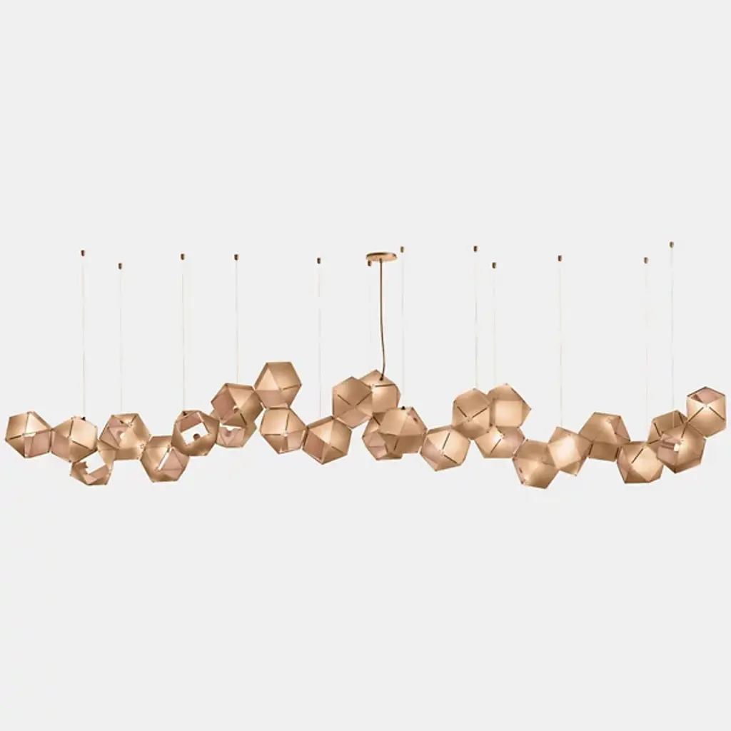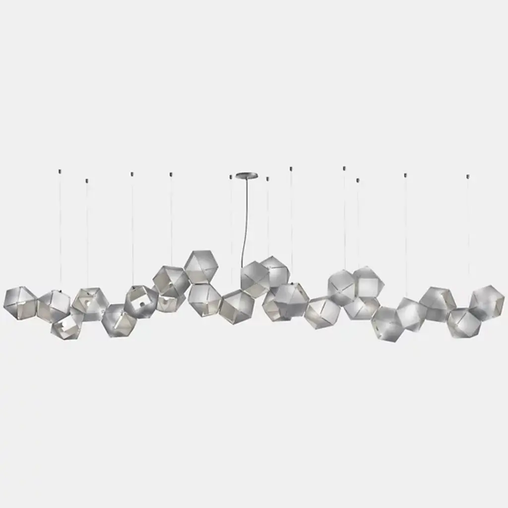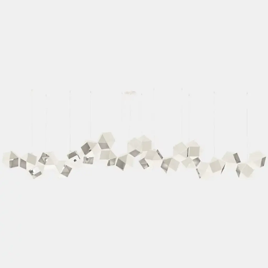 The WELLES Steel Long Chandelier by Gabriel Scott is a striking, structured addition to spaces. Featuring hollowed metallic polygons that interconnect for a modular composition, this piece expands across spaces, showcasing its handcrafted artistry. Each geometric shade emits an even, soft layer of illumination from its form, which, when combined with its companion shades, creates a bright, beautiful, and sculptural installation that makes a statement in the room it is suspended in.