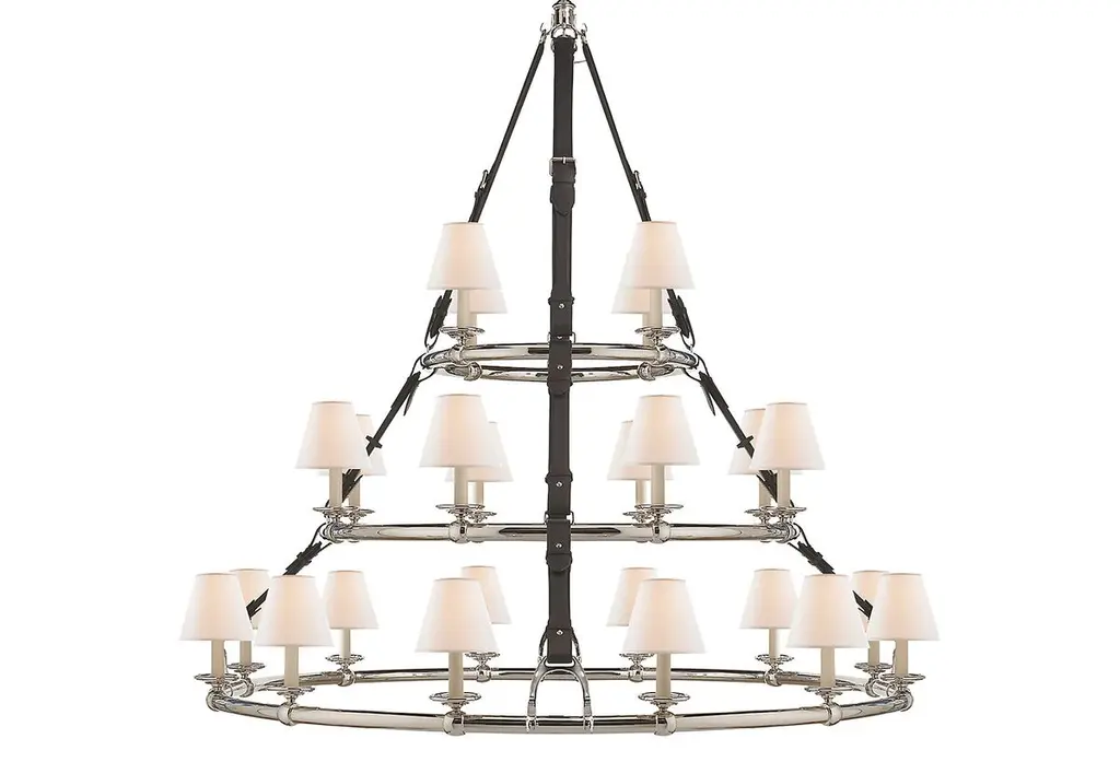 This statement-making chandelier shows off three circular tiers of brass reinforced with leather straps for a hint of equestrian flair. Hardwired.