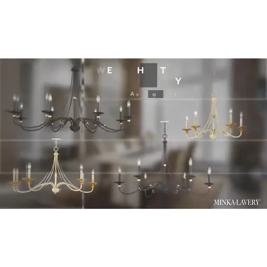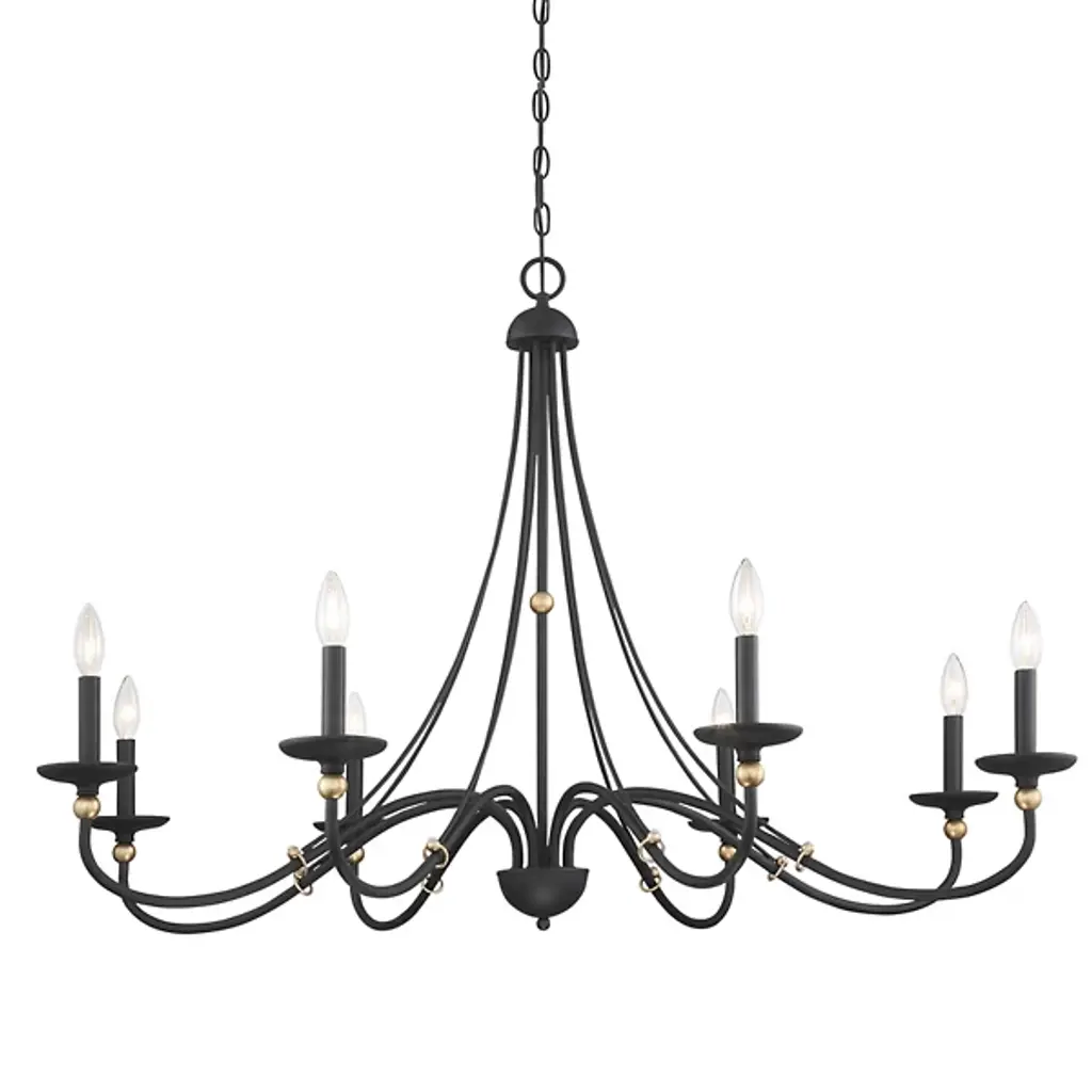 Tasteful, swooping, and sophisticated. The Westchester County Chandelier from Minka-Lavery descends from a disc canopy along a medium-weight chain, ending in a dome accent suspended from a ring finial. Slender steel bracers sweep down and out to curving arms, each one ending in open candelabra lamping blooming upward from a disc bobeche and casting a generous glow.