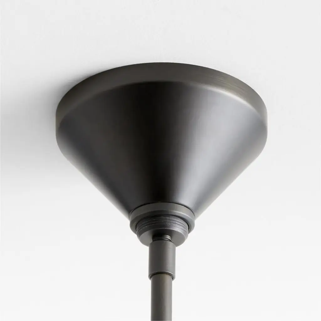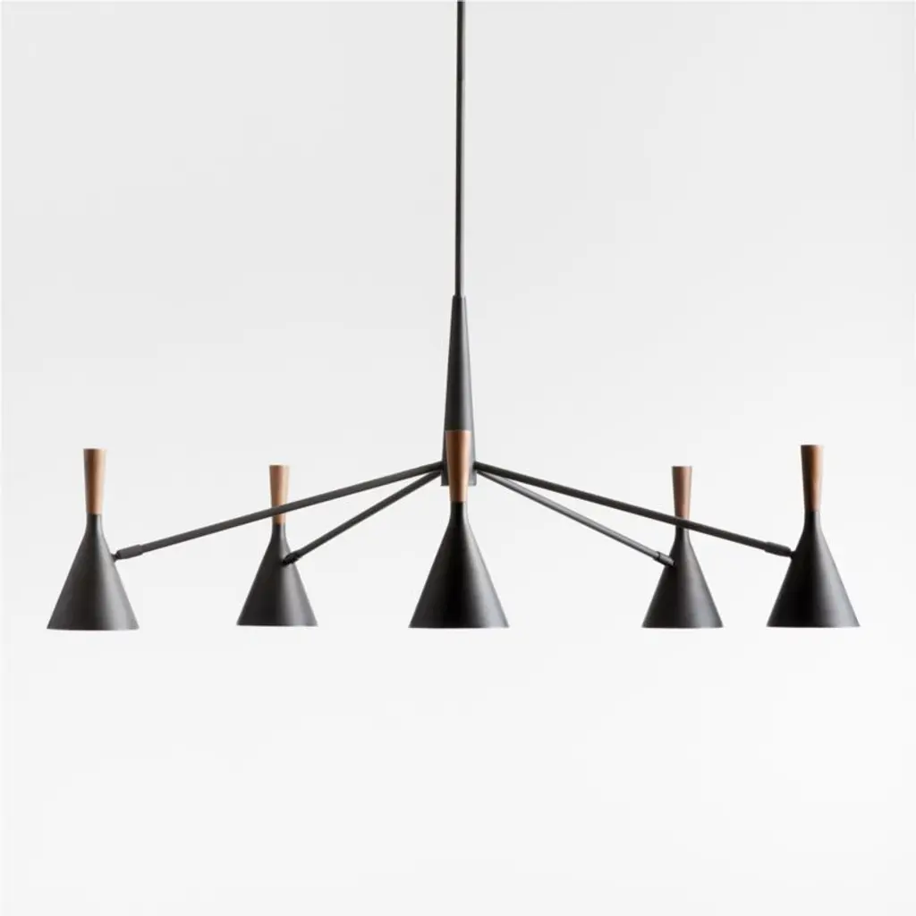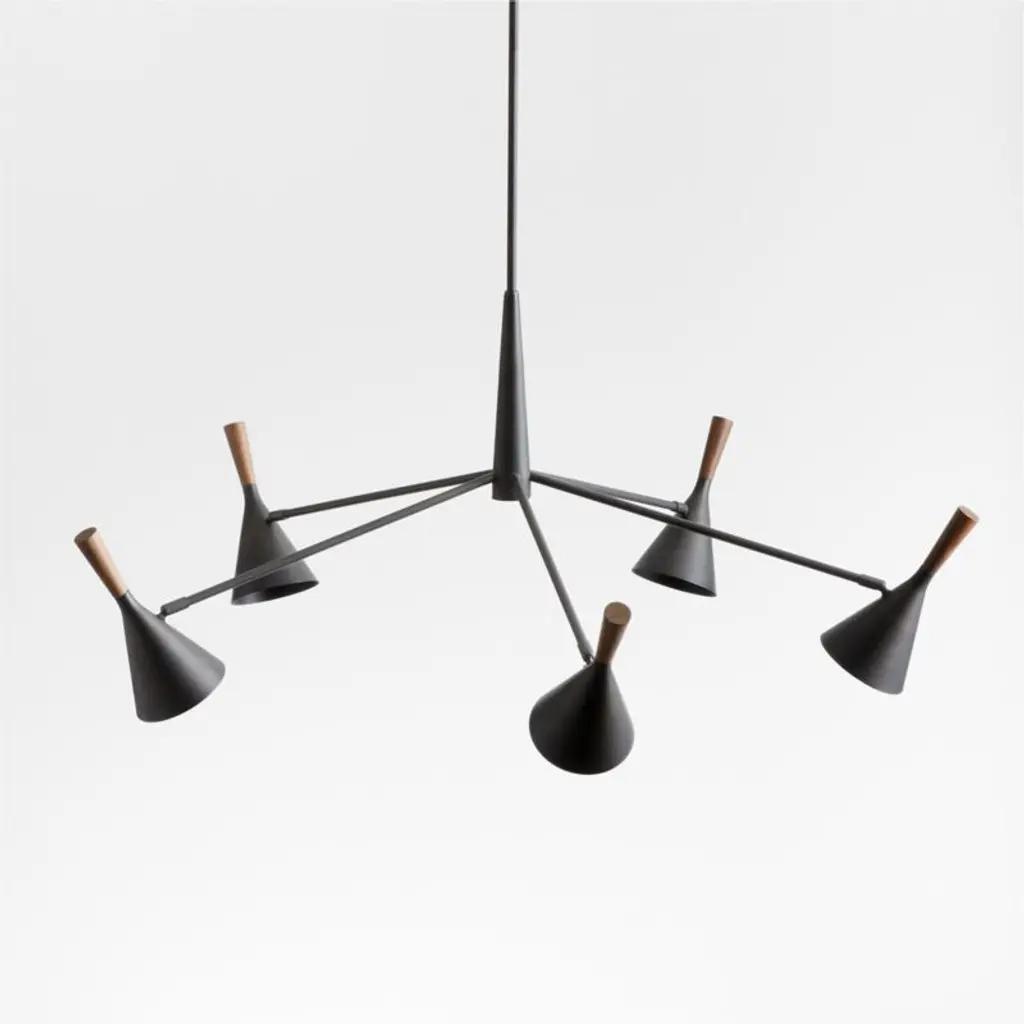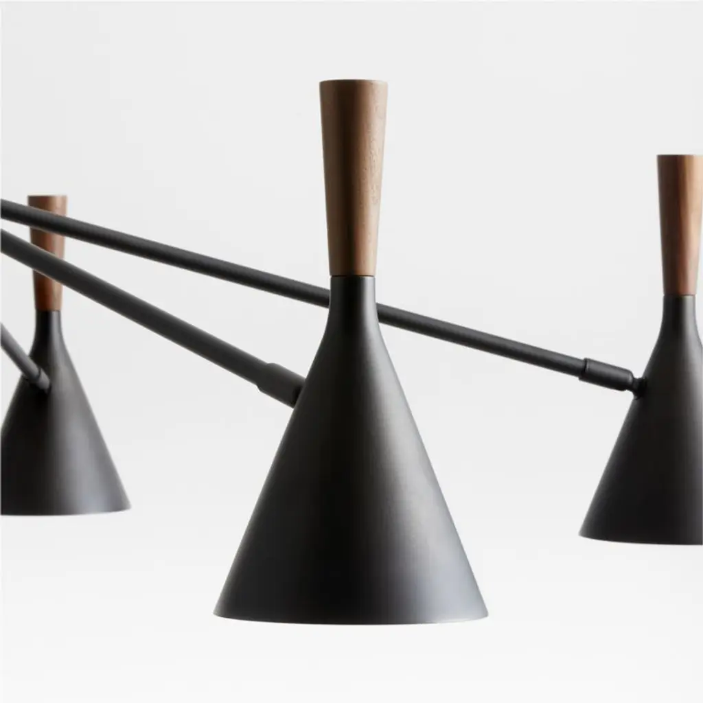 Inspired by mid-century modern design, our Weston chandelier captures the design movement's impeccable pairing of clean lines and organic materials. Turned solid walnut tops each of the eight conical shades, echoing their flared silhouettes and bringing warmth to the blackened steel fixture. The adjustable swivel shades hang from slender radiating arms and a tapered ceiling plate that continues the rounded-angle theme. Weston feels right at home in an entryway or above one of our pedestal base dining tables.