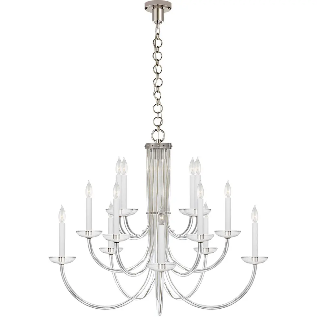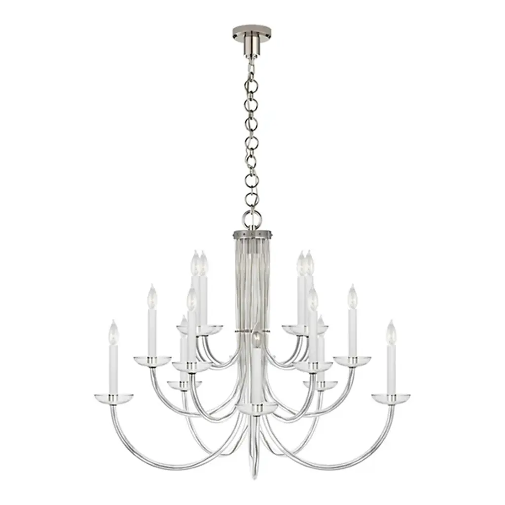 The Wharton Large Chandelier from Visual Comfort Signature, formerly known as Visual Comfort, twists a classic and traditional design with modern style. Each pronged arm swoops upward in a tiered formation to end in a translucent cupped candelabra base. Embellished with minimal metallic fixtures and trim, the entirety of the structure hangs from a circular chain link and attaches to a minimal canopy above. It’s a piece of design that offers practical, ambient illumination while elevating the overall aesthetic of a space with ease.