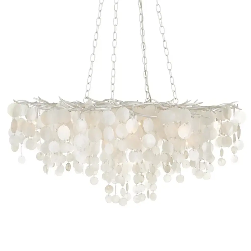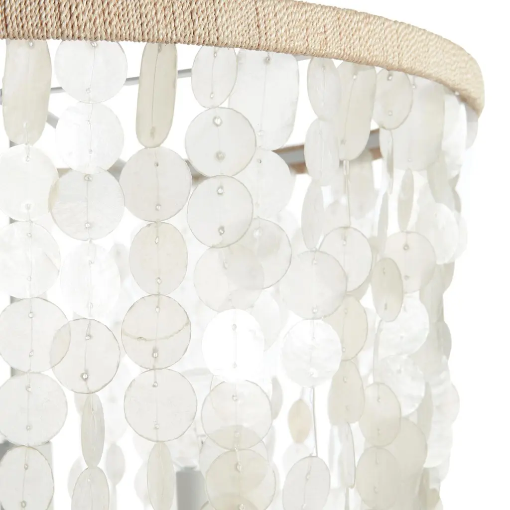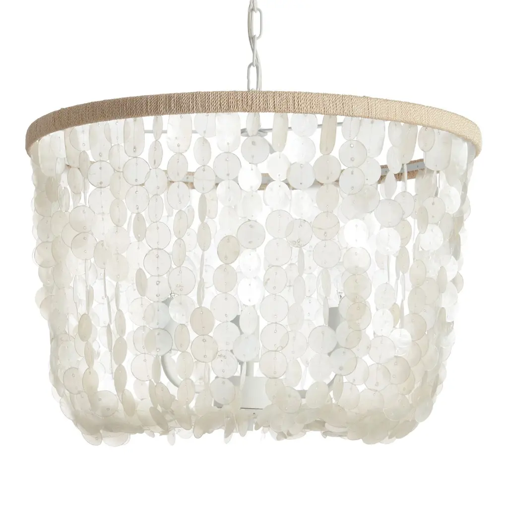 Our luminous 3-light chandelier features layers of iridescent white capiz discs cascading from a jute-wrapped frame. Artisans in the Philippines expertly hand-cut each capiz shell by hand, stringing them vertically to create a dome-shaped chandelier with flowing movement. Softly filtering warm light through lustrous seashells, this glowing statement piece adds natural beauty to the kitchen or dining room.
