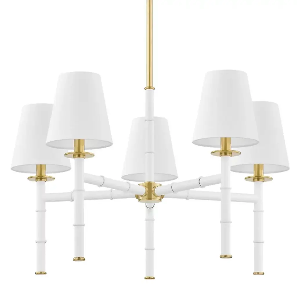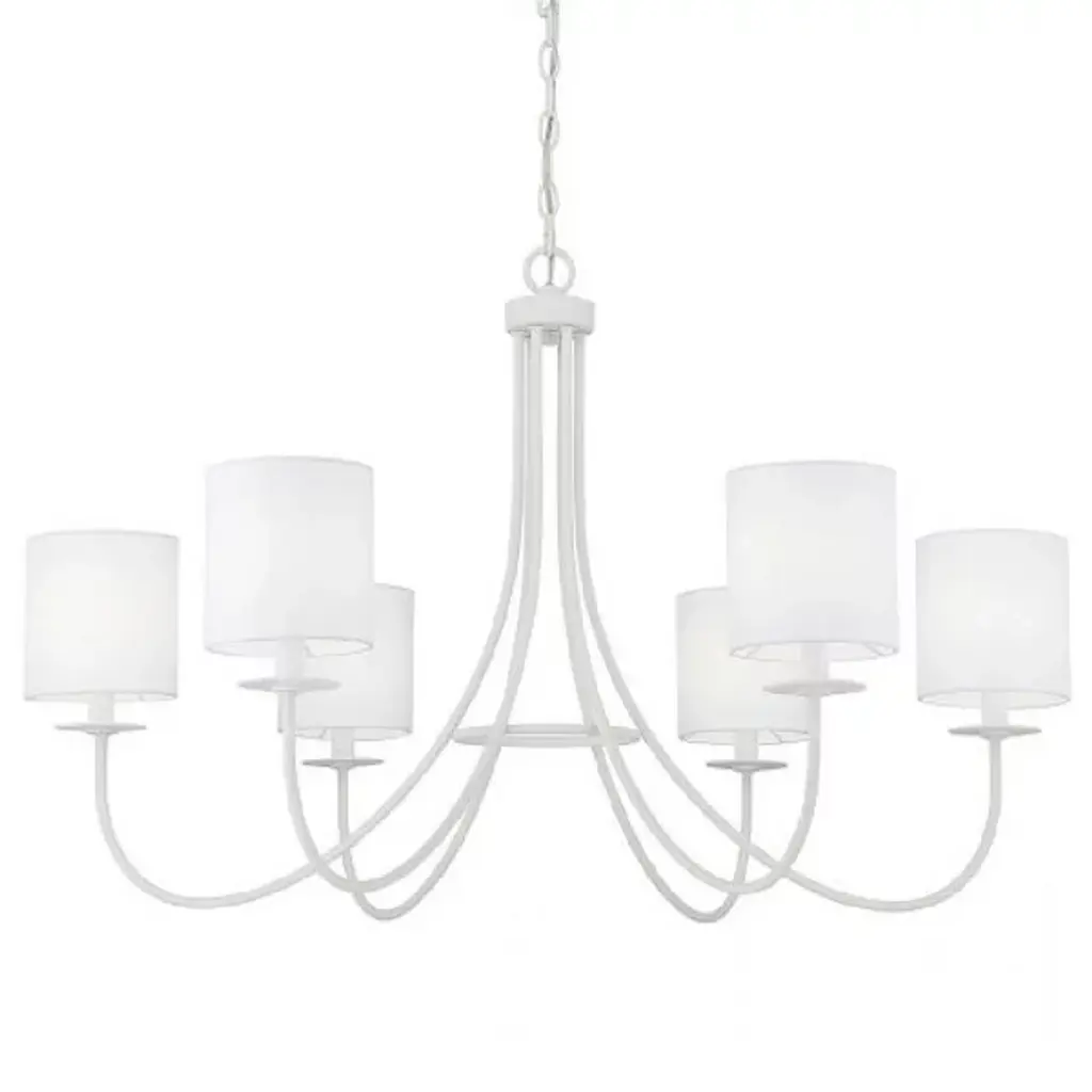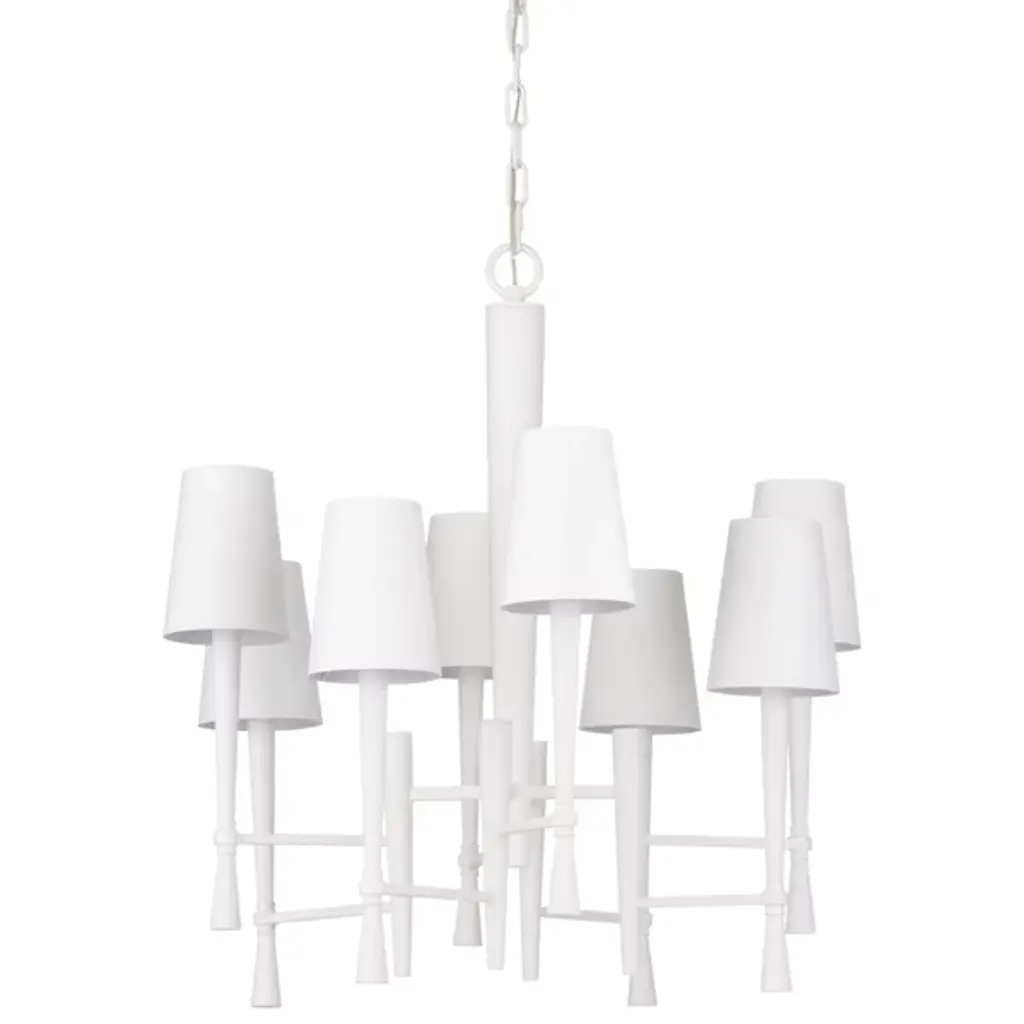 Elevate your lighting design with the White Ferrier Chandelier from Wildwood. This eight-light chandelier blends with various decor styles, crafted from durable steel and finished in matte white plaster. Tapered metal shades gently diffuse light, casting a warm, inviting glow perfect for entryways, breakfast nooks, or dining rooms. It includes six feet of chain and a matching 6.25" canopy, providing adjustable hanging options for a refined, elegant touch.