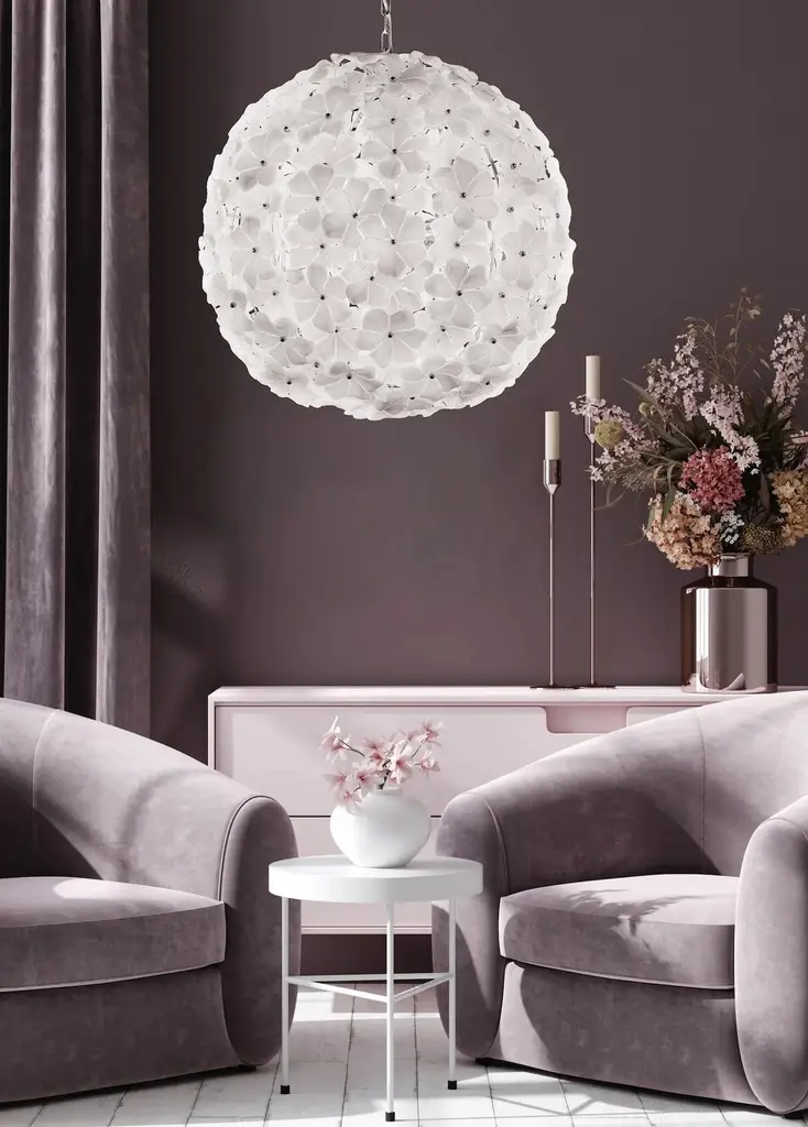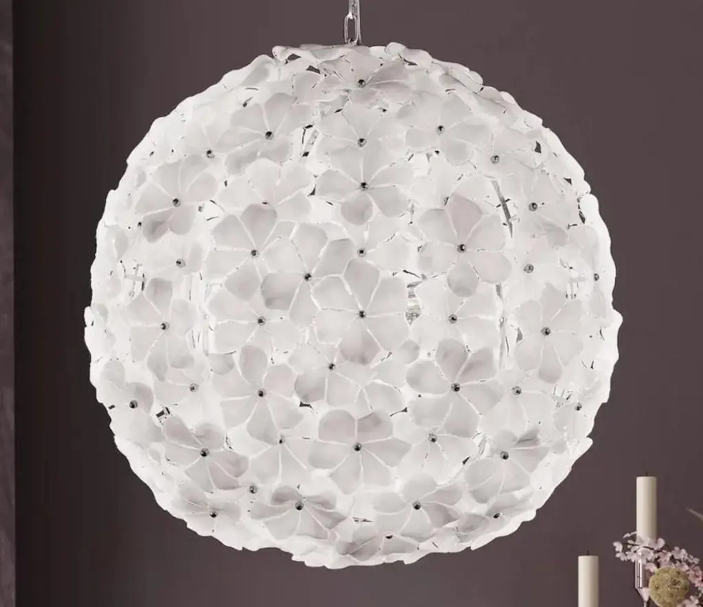 Italian chandelier with layered hand blown white Murano lotus flowers mounted chrome spherical structure / Made in Italy in the style of CenedeseMeasures: diameter 31.5 inches, height 31.5 inches plus chain and canopy12 lights / E26 or E27 type / max 60W eachOrder only / this item ships from ItalyOrder reference #: FABIOLTD C848