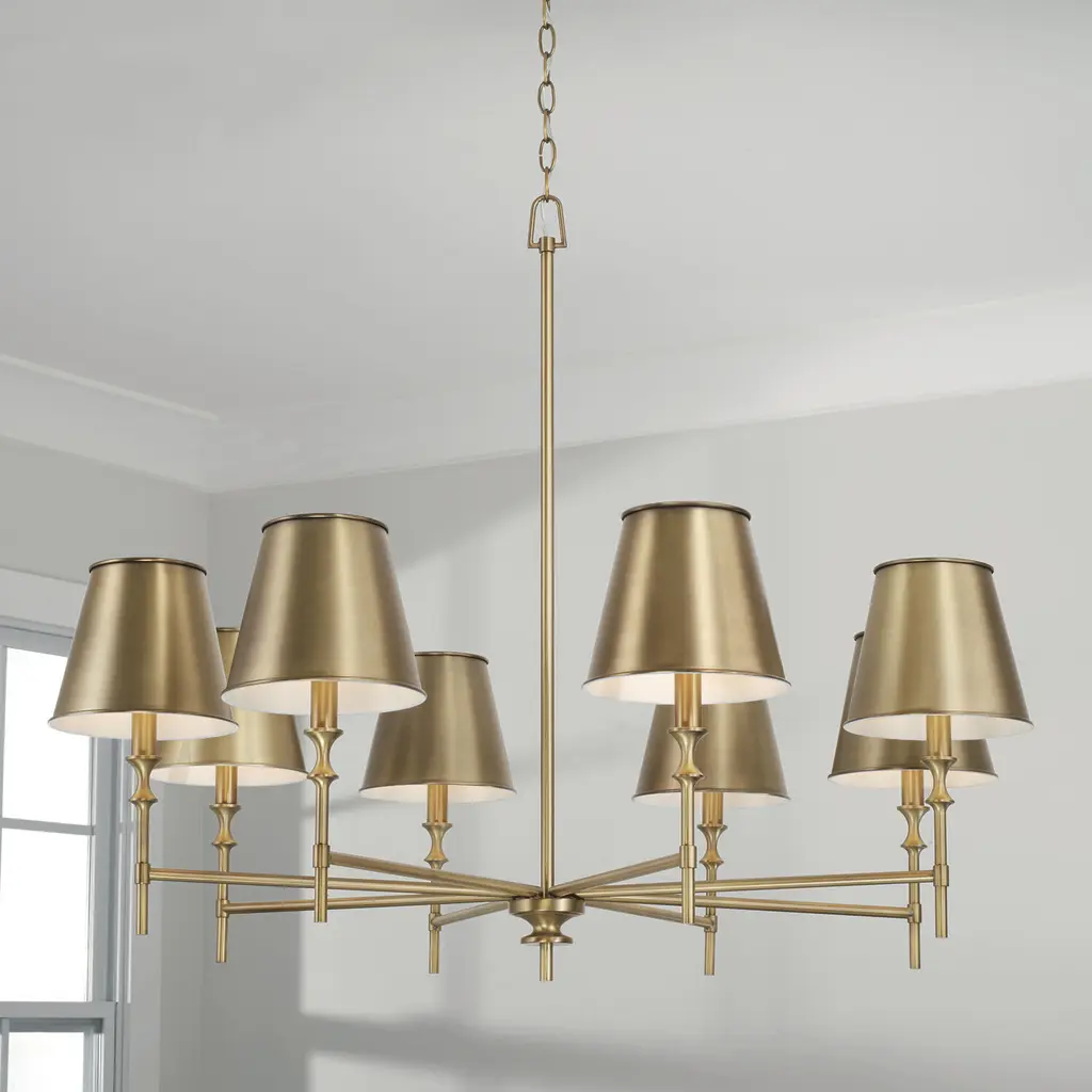 A refresh to the classic silhouette, the Whitney Large Chandelier brings elevated glamour to traditional style. The Aged Brass metal shades with white interior create a modern look, while the designer details add intrigue.