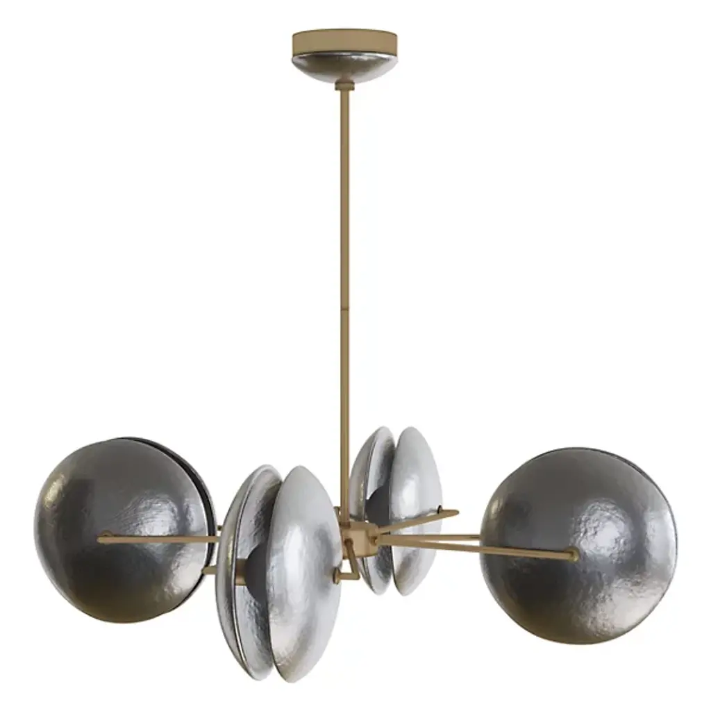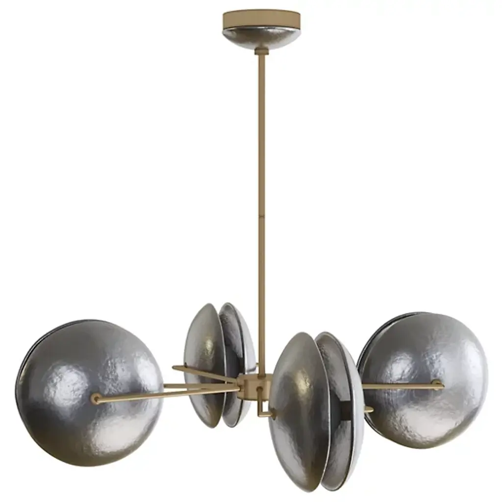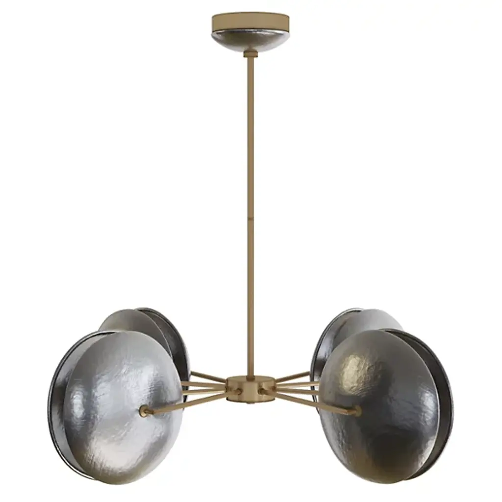 The Whitney LED Chandelier from Arteriors is a moody and sophisticated piece that can enhance the surrounding space. Its antique brass iron body is adorned with futuristic, smoky slump luster glass disc shapes that visually encase the frosted glass bulb inside. The fixture emits a diffused glow from each glass shade, creating a soft and inviting ambiance.