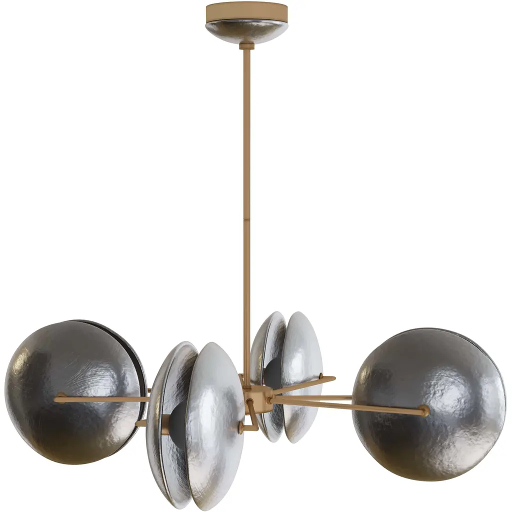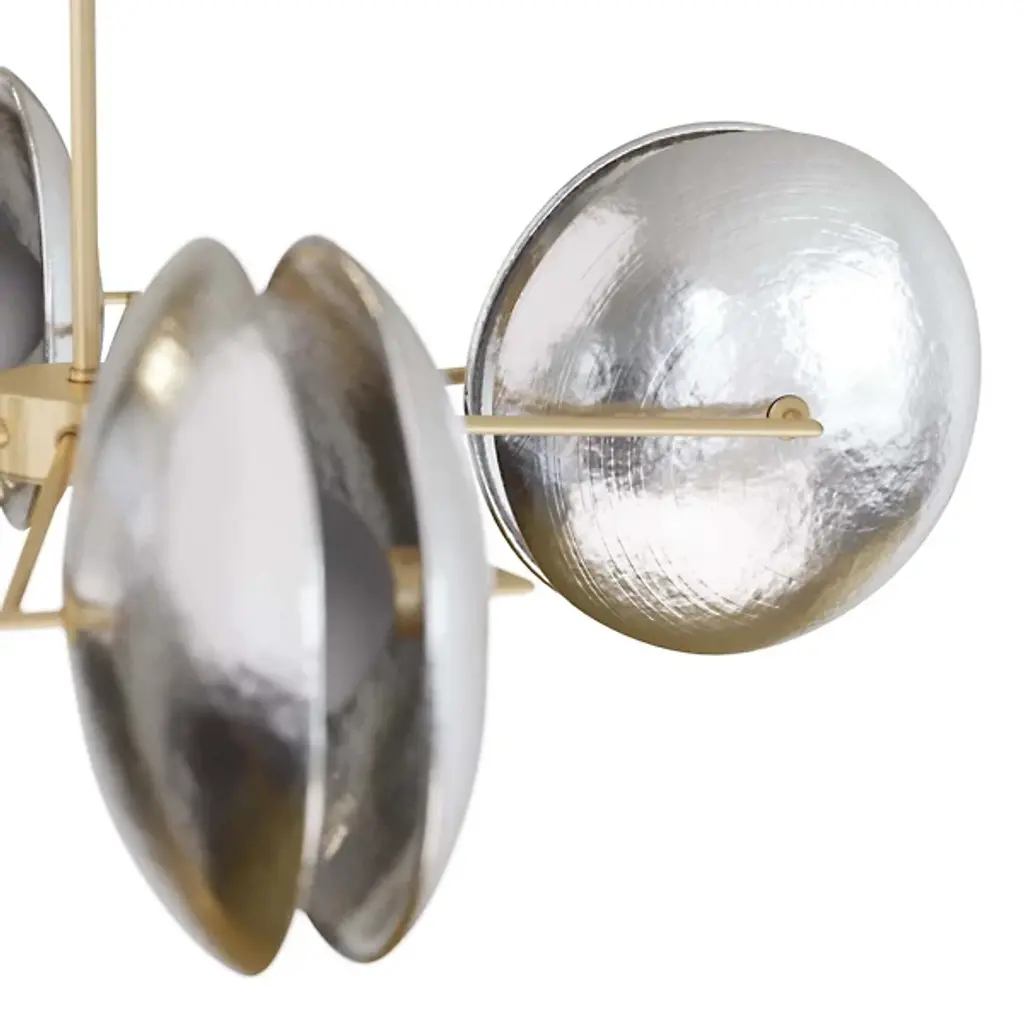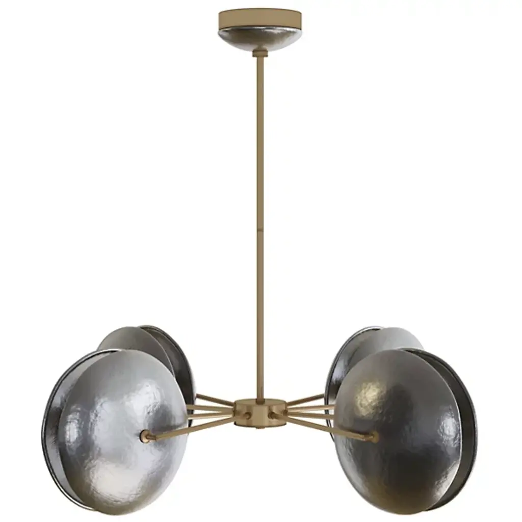 The Whitney LED Chandelier from Arteriors is a moody and sophisticated piece that can enhance the surrounding space. Its antique brass iron body is adorned with futuristic, smoky slump luster glass disc shapes that visually encase the frosted glass bulb inside. The fixture emits a diffused glow from each glass shade, creating a soft and inviting ambiance.