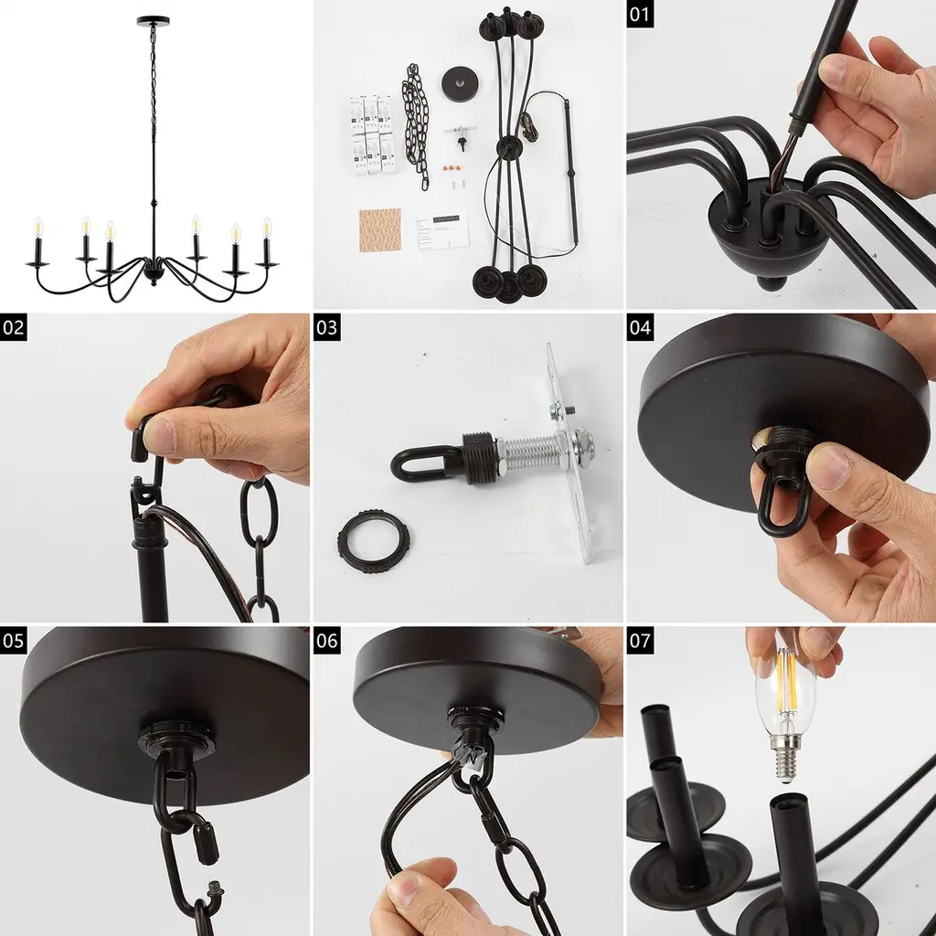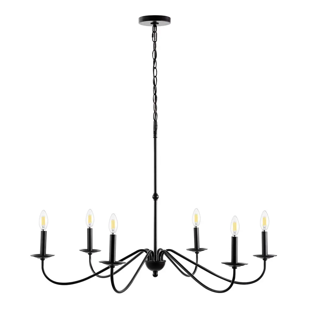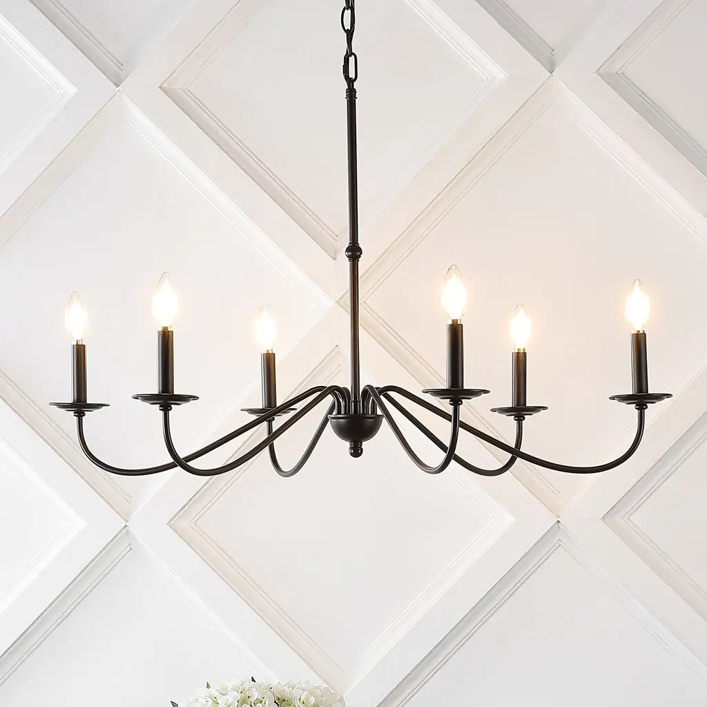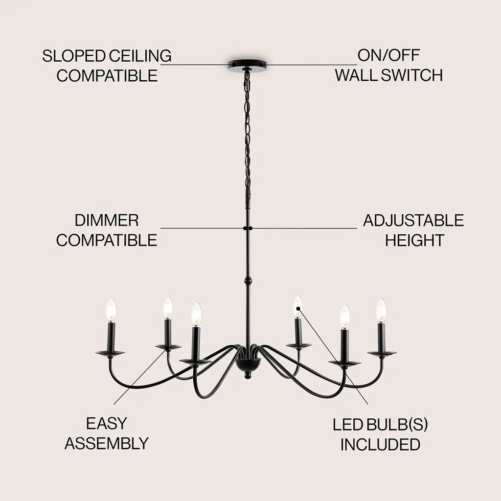 Based on historic wrought iron chandeliers, our rustic 6-light design features a quality finish. Perfectly sized for a farmhouse dining room, tall entry, or great room with high ceilings, our chandelier is just under 35" wide and features tall candles with LED candle bulbs. Use this versatile chandelier in a modern farmhouse, French country or Tuscan style home, or to add character to a rustic, industrial space.