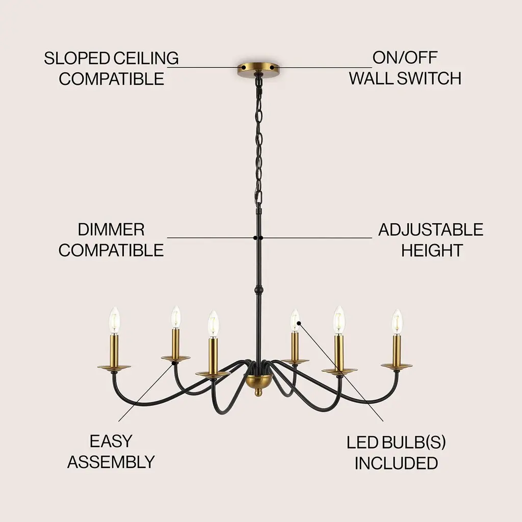Based on historic wrought iron chandeliers, our rustic 6-light design features a quality finish. Perfectly sized for a farmhouse dining room, tall entry, or great room with high ceilings, our chandelier is just under 35" wide and features tall candles with LED candle bulbs. Use this versatile chandelier in a modern farmhouse, French country or Tuscan style home, or to add character to a rustic, industrial space.