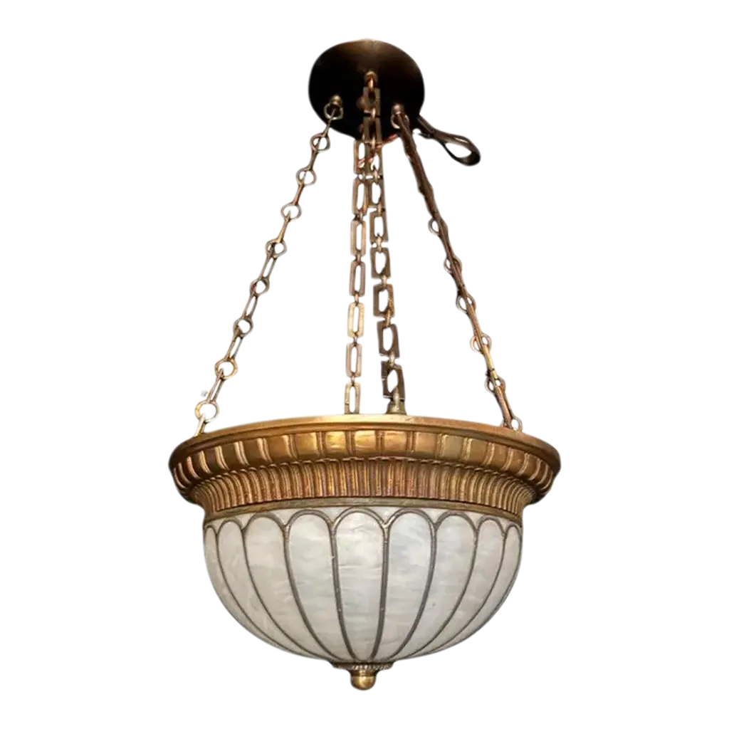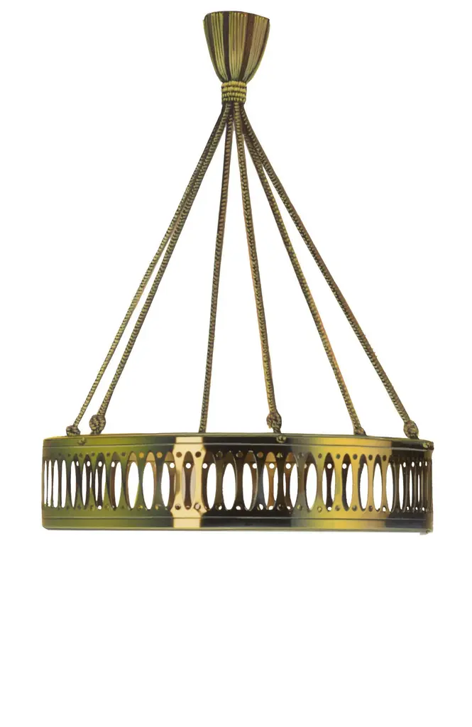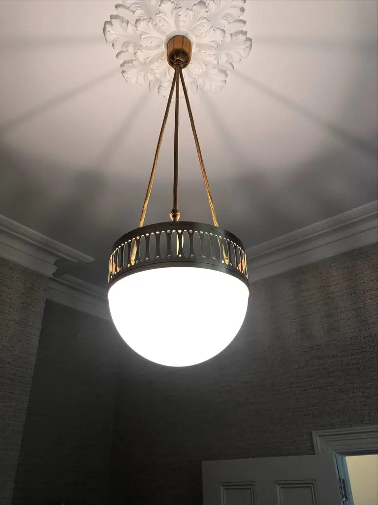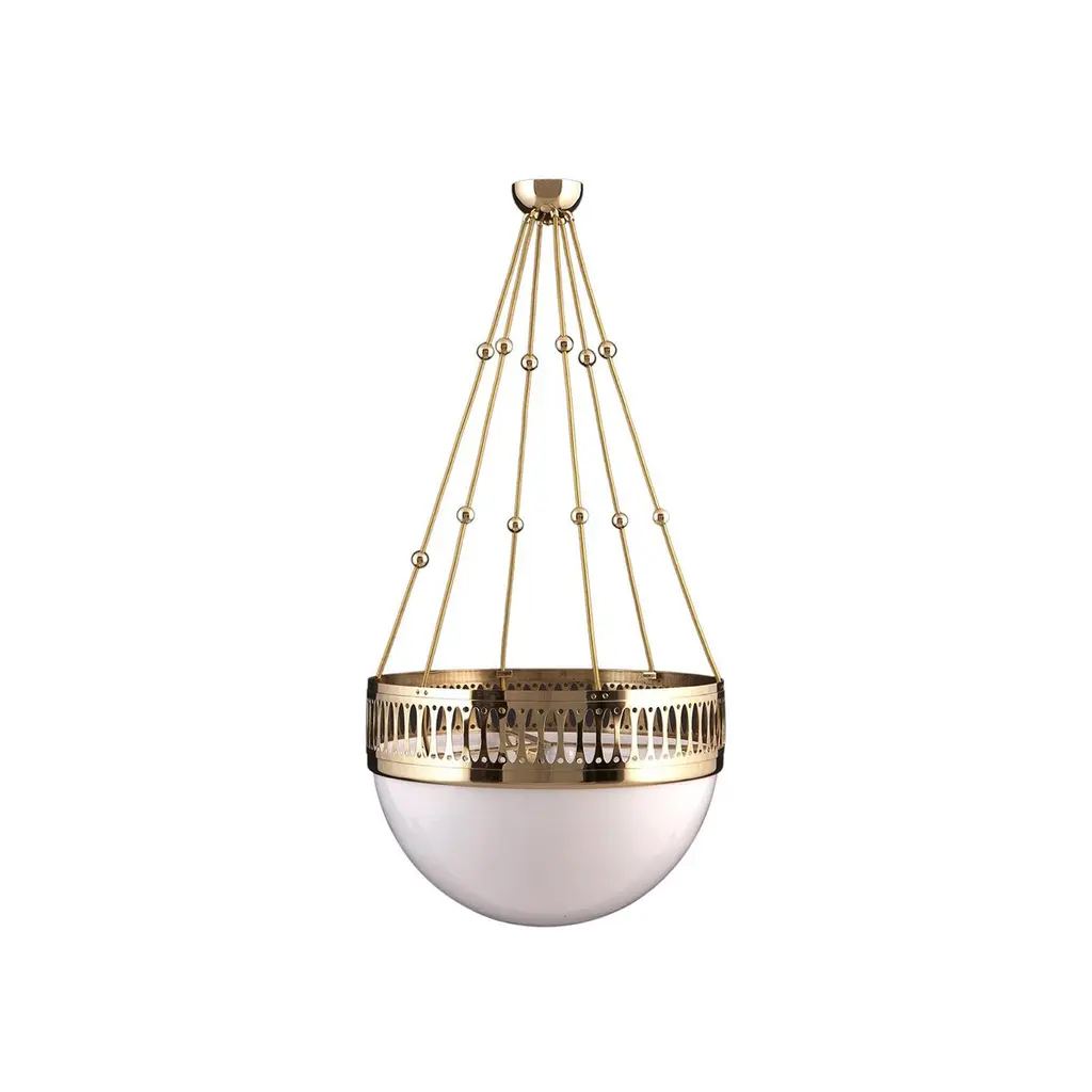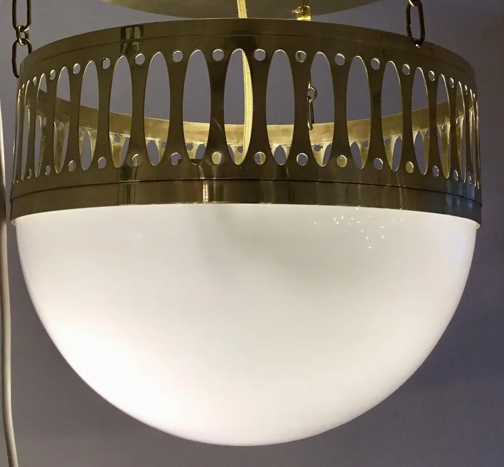 Punched brass-sheet, hand blown opaline glass 35cm or 50 cm in diameter, hanging on passementBrass, optionally varnished or nickel-plated, all other finishes on requestMost components according to the UL regulations, with an additional charge we will UL-list and label our fixtures.