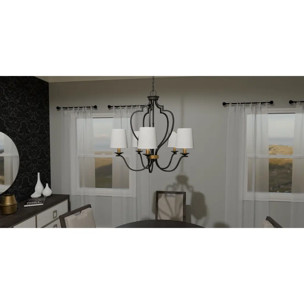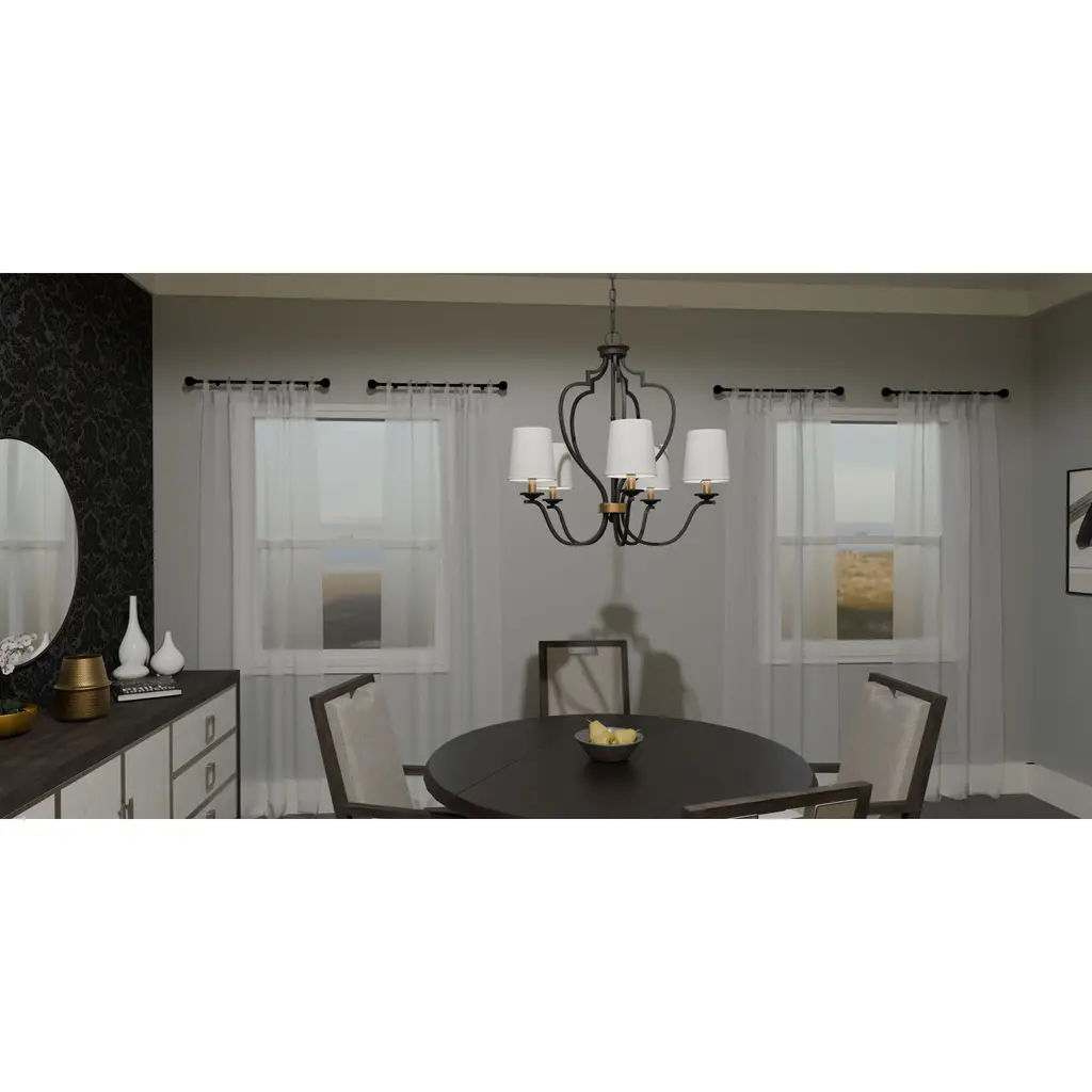 Wilkins takes a fresh, new approach to the classic chandelier silhouette. White linen shades rest atop gently curving arms, casting a soft ambient glow perfect for a bedroom, dining room, or living room. Choose brushed weathered brass for a classic elegance - or matte black with brass accents for a touch of industrial style.
