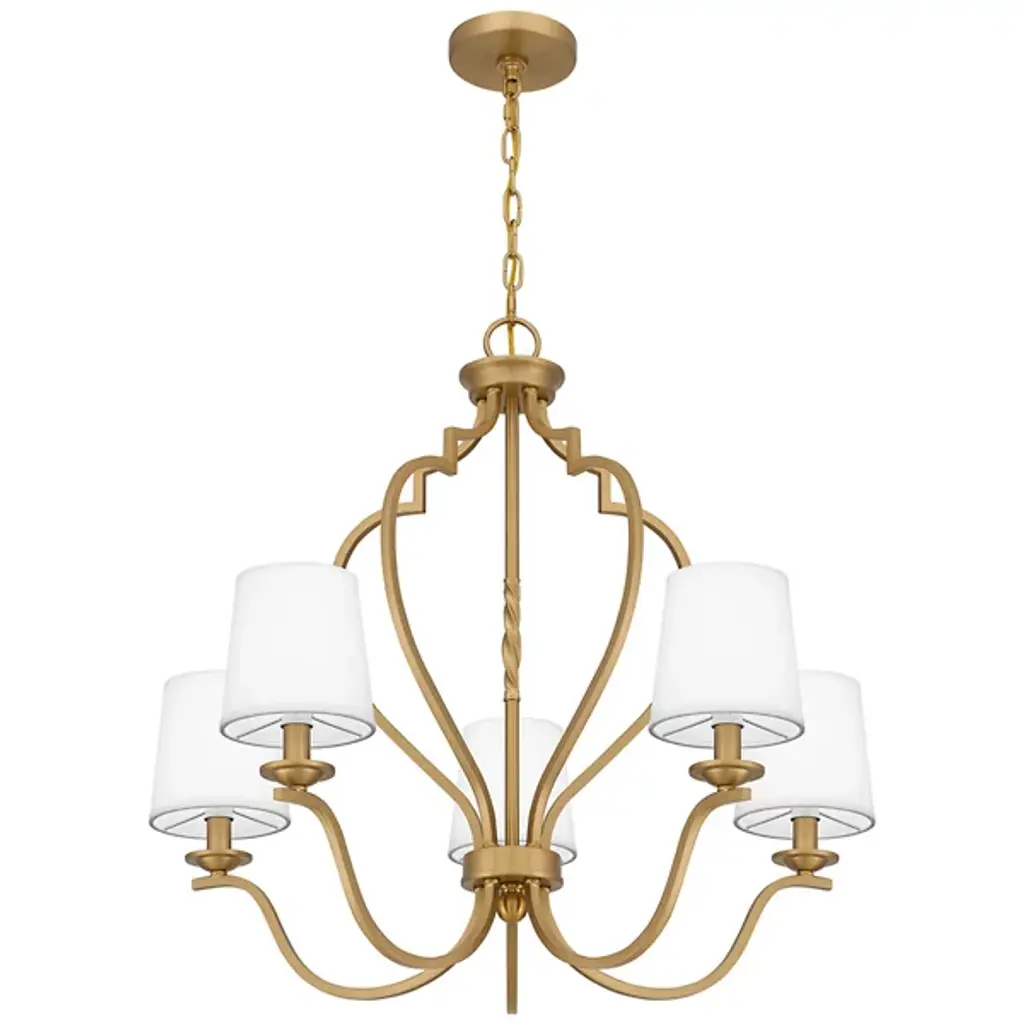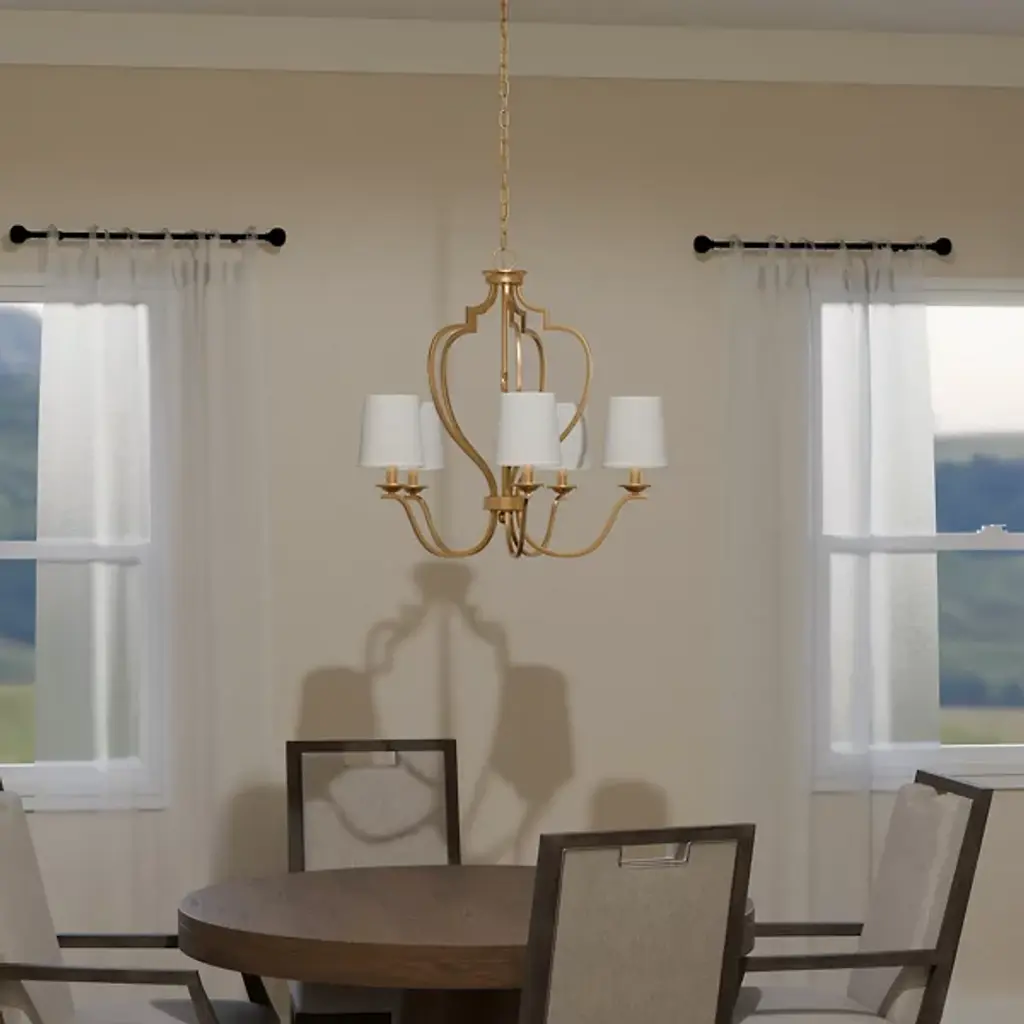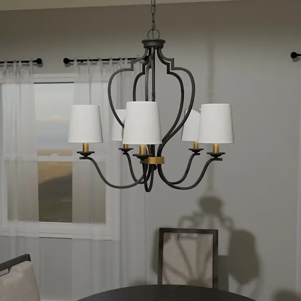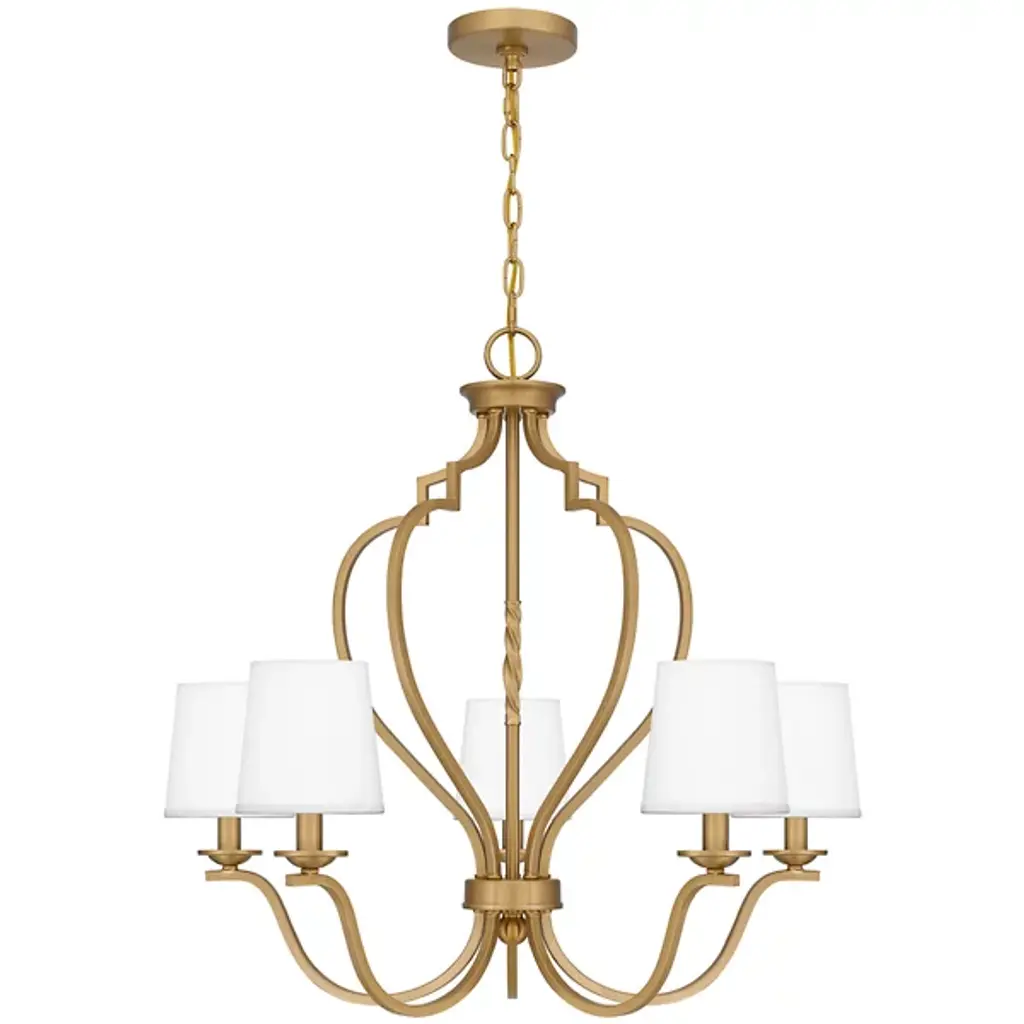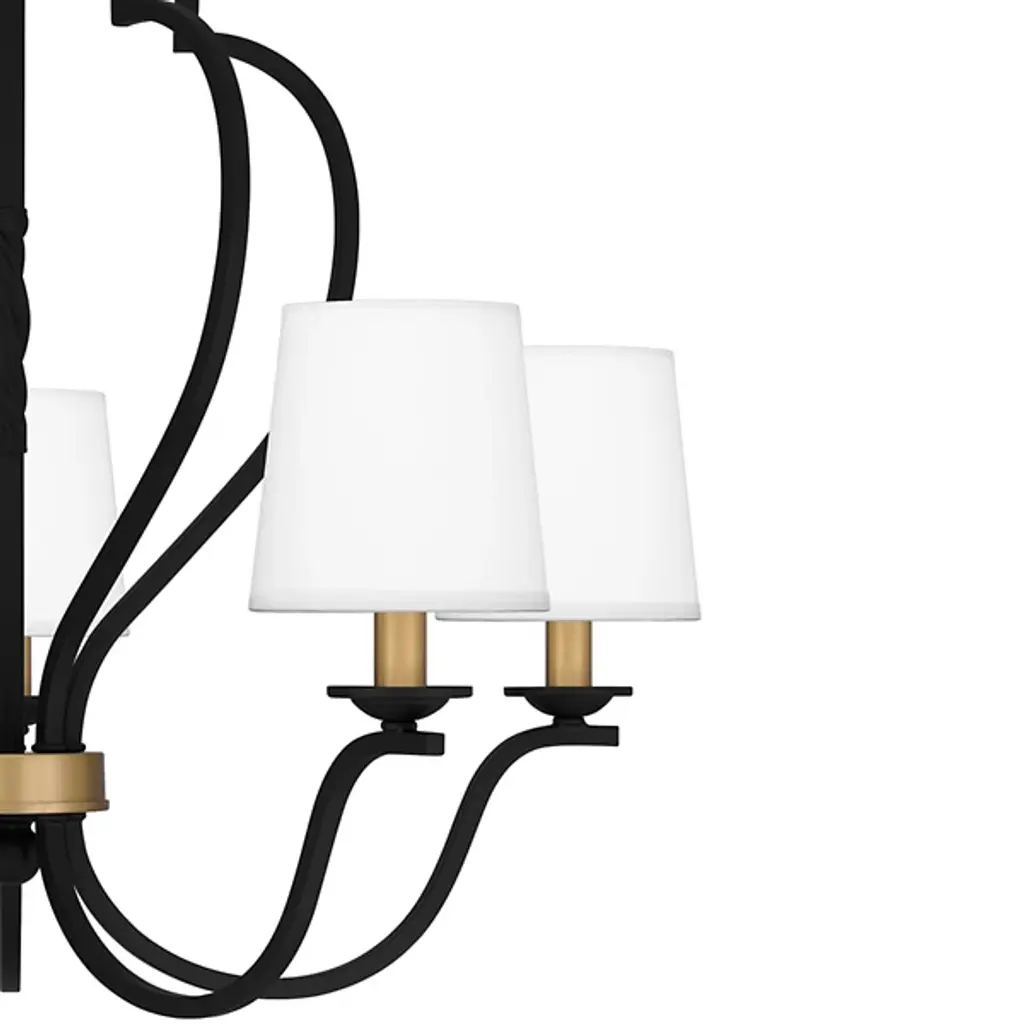 Add elegant impact to interiors with the Wilkins Chandelier from Quoizel. Descending from a circular canopy via a slim chain, it uses a swooping steel structure to support damp-rated candelabra lamping inside slightly flared shades of white linen. The smooth metal contrasts well with the slightly textured linen, transforming its interiors with enduring elegance, transmitting a mellow warmth accompanied by bold, burnished reflections from the lamping.