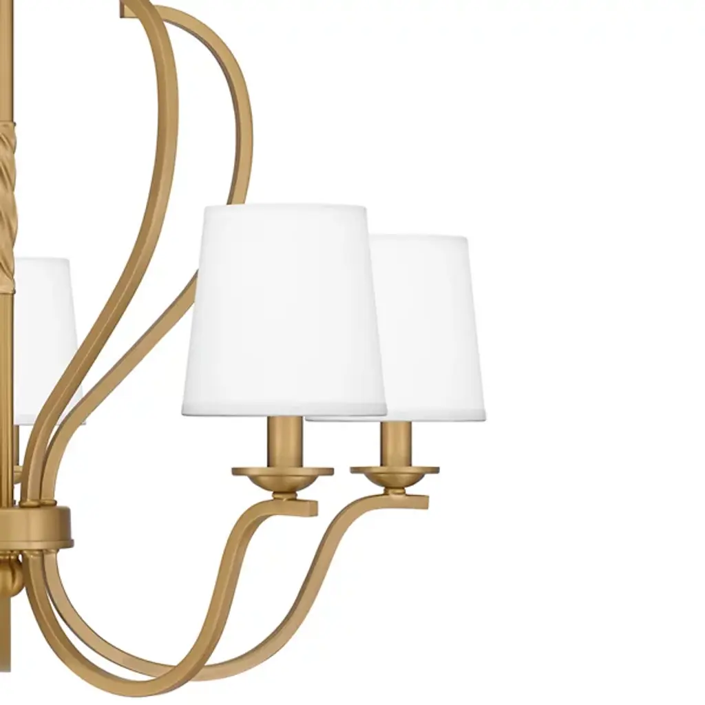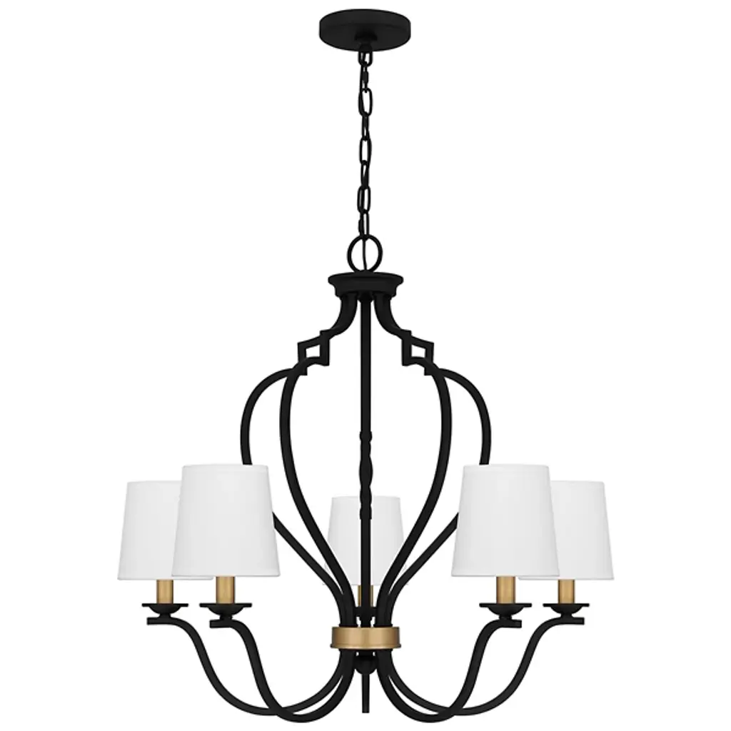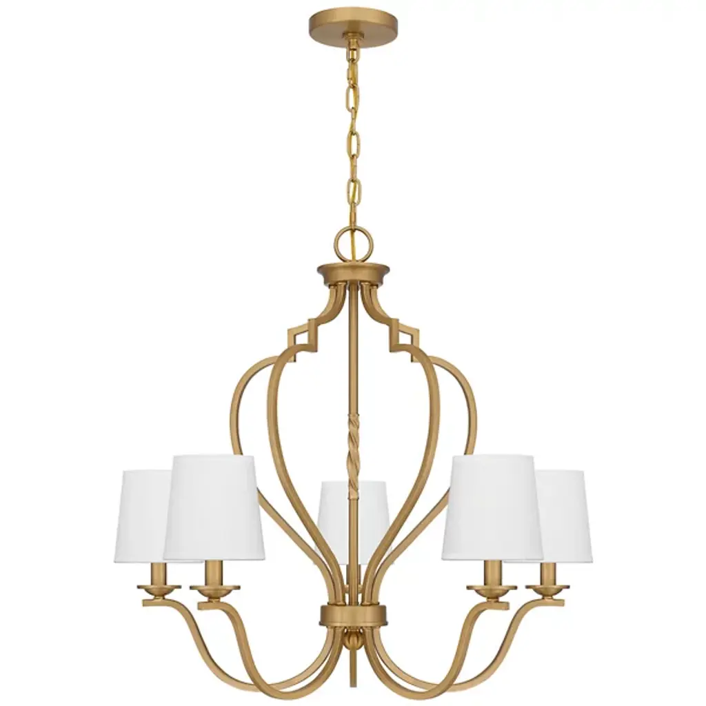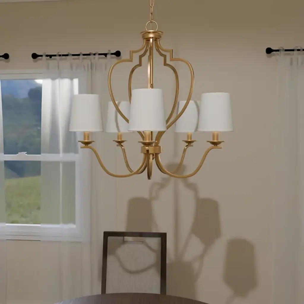 Add elegant impact to interiors with the Wilkins Chandelier from Quoizel. Descending from a circular canopy via a slim chain, it uses a swooping steel structure to support damp-rated candelabra lamping inside slightly flared shades of white linen. The smooth metal contrasts well with the slightly textured linen, transforming its interiors with enduring elegance, transmitting a mellow warmth accompanied by bold, burnished reflections from the lamping.