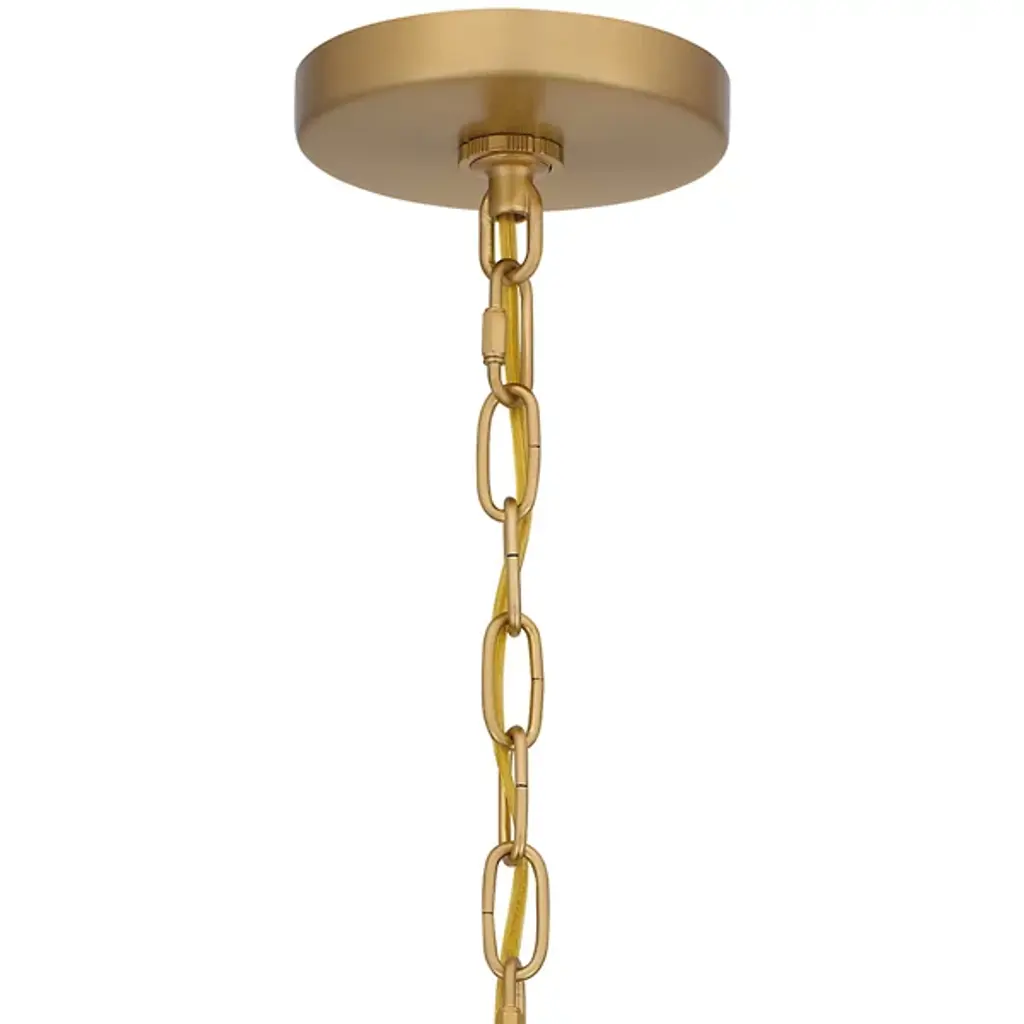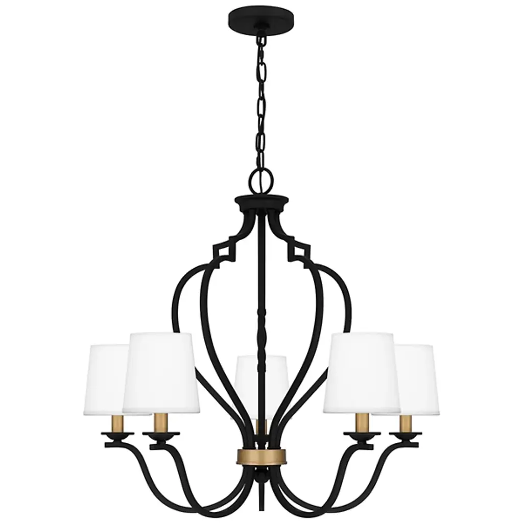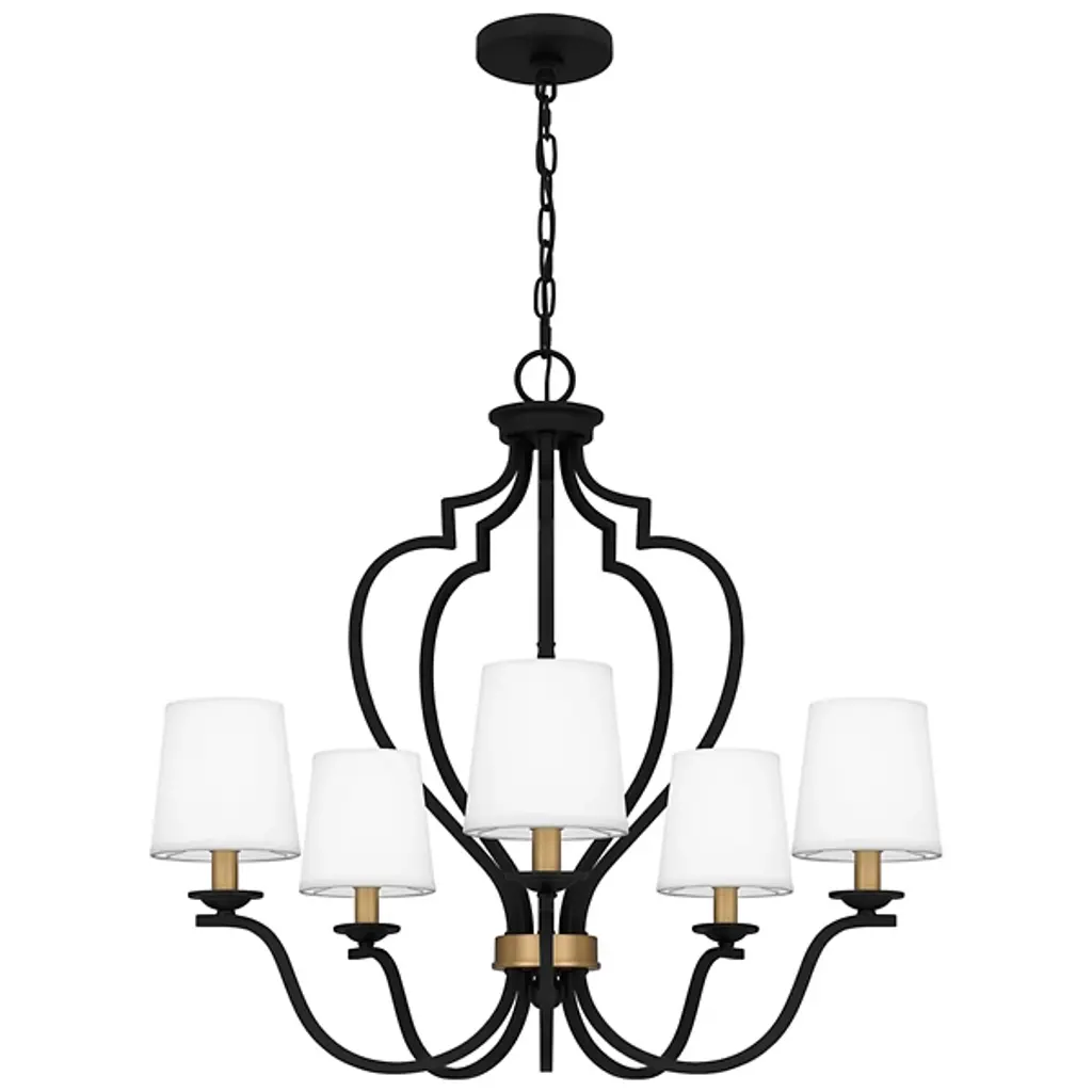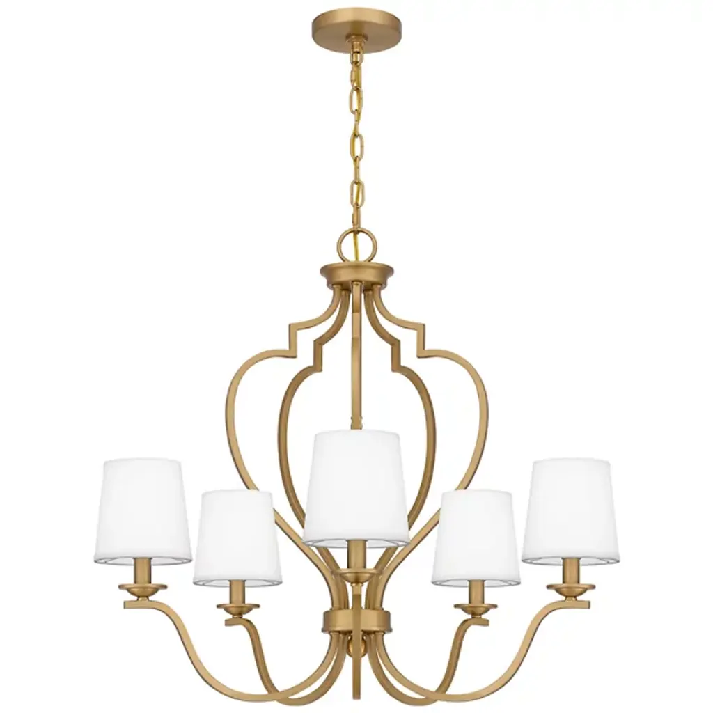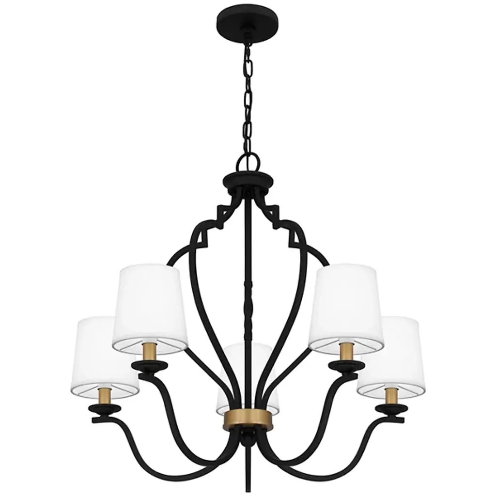 Add elegant impact to interiors with the Wilkins Chandelier from Quoizel. Descending from a circular canopy via a slim chain, it uses a swooping steel structure to support damp-rated candelabra lamping inside slightly flared shades of white linen. The smooth metal contrasts well with the slightly textured linen, transforming its interiors with enduring elegance, transmitting a mellow warmth accompanied by bold, burnished reflections from the lamping.