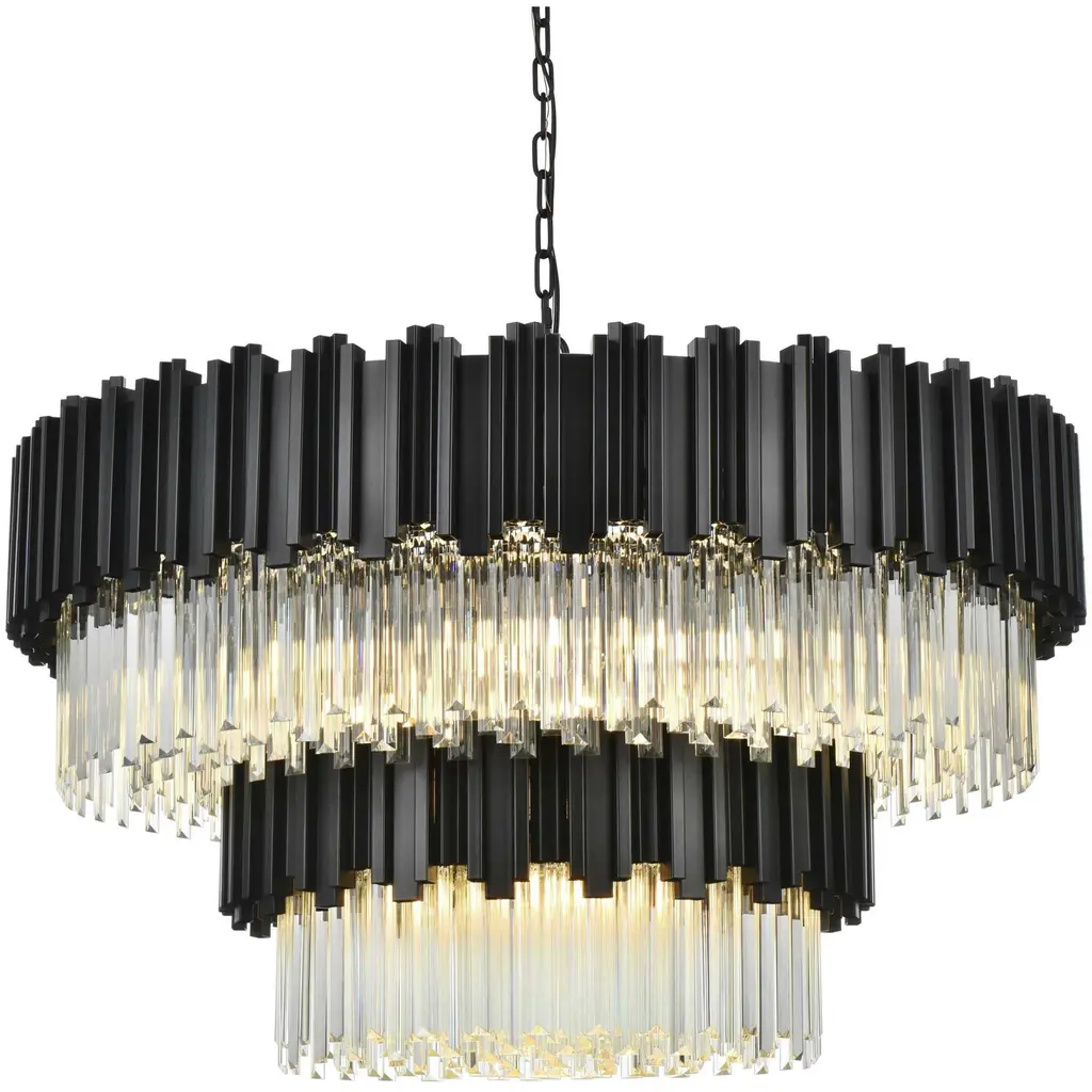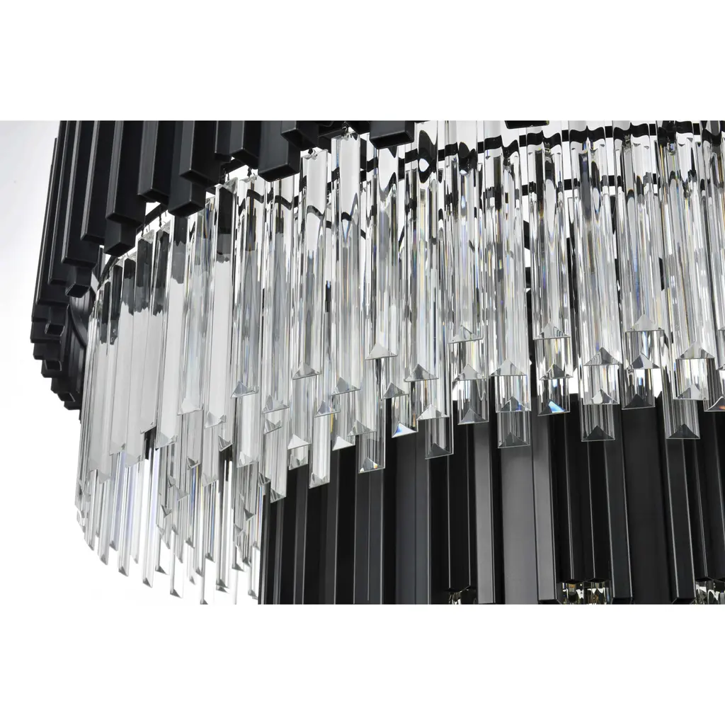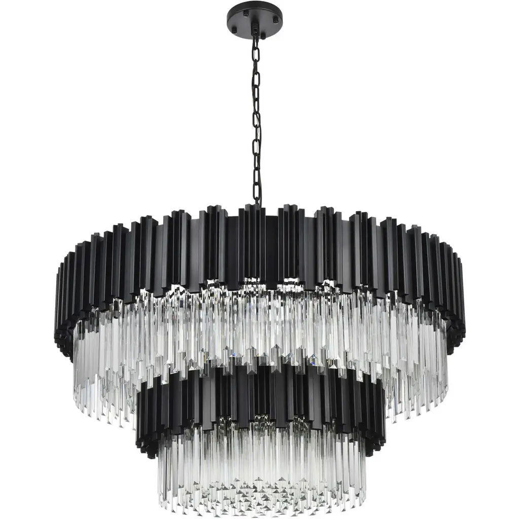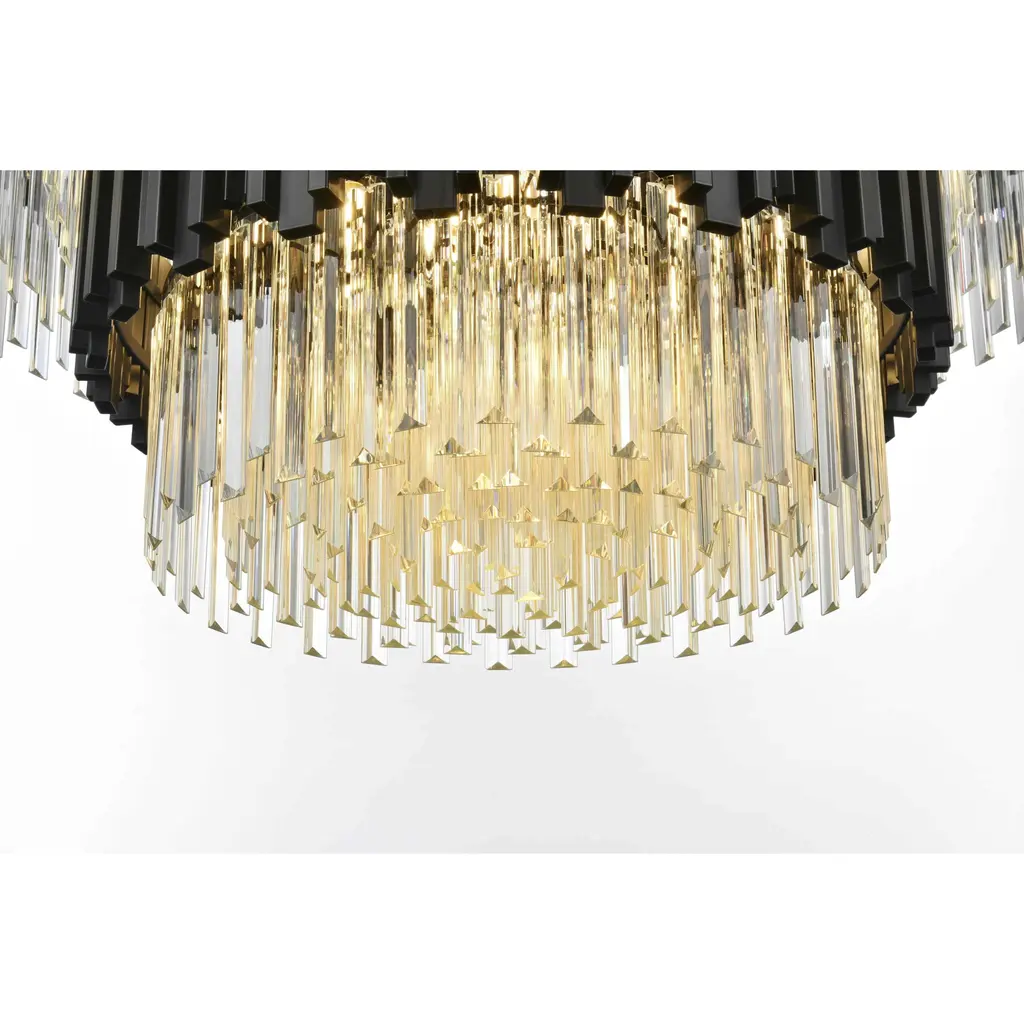 Transform your space with this stunning chandelier, a dynamic fusion of iron and staggered clear glass that exudes contemporary style and architectural artistry. The layered glass refracts light beautifully, creating a radiant display of glowing brilliance that fills the room with warmth and sophistication. The staggered arrangement of the metal and glass adds depth and dimension, making this chandelier an eye-catching centerpiece. Fully dimmable, it allows you to adjust the ambiance to suit any mood, from bright and vibrant to soft and inviting. Available in satin gold for a warm, luxurious vibe, chrome for sleek modernity, and black for bold, dramatic contrast, this fixture comes in various sizes to perfectly complement any space. Complete with a matching canopy, its an ideal choice for dining rooms, living rooms, or offices. Add a touch of refined geometry to your décor and bask in the brilliance of this radiant design.