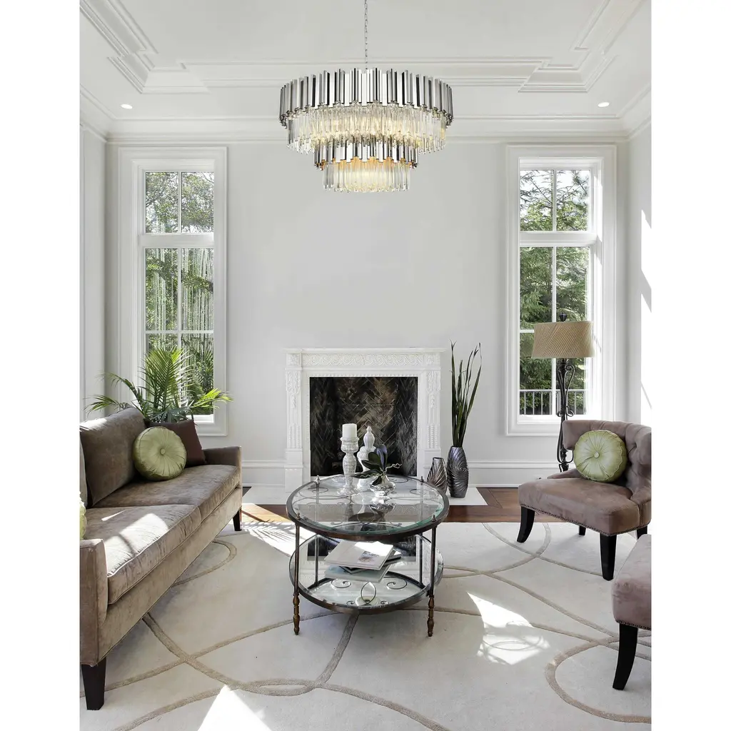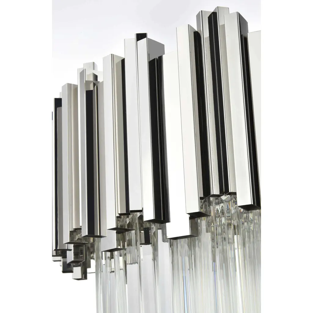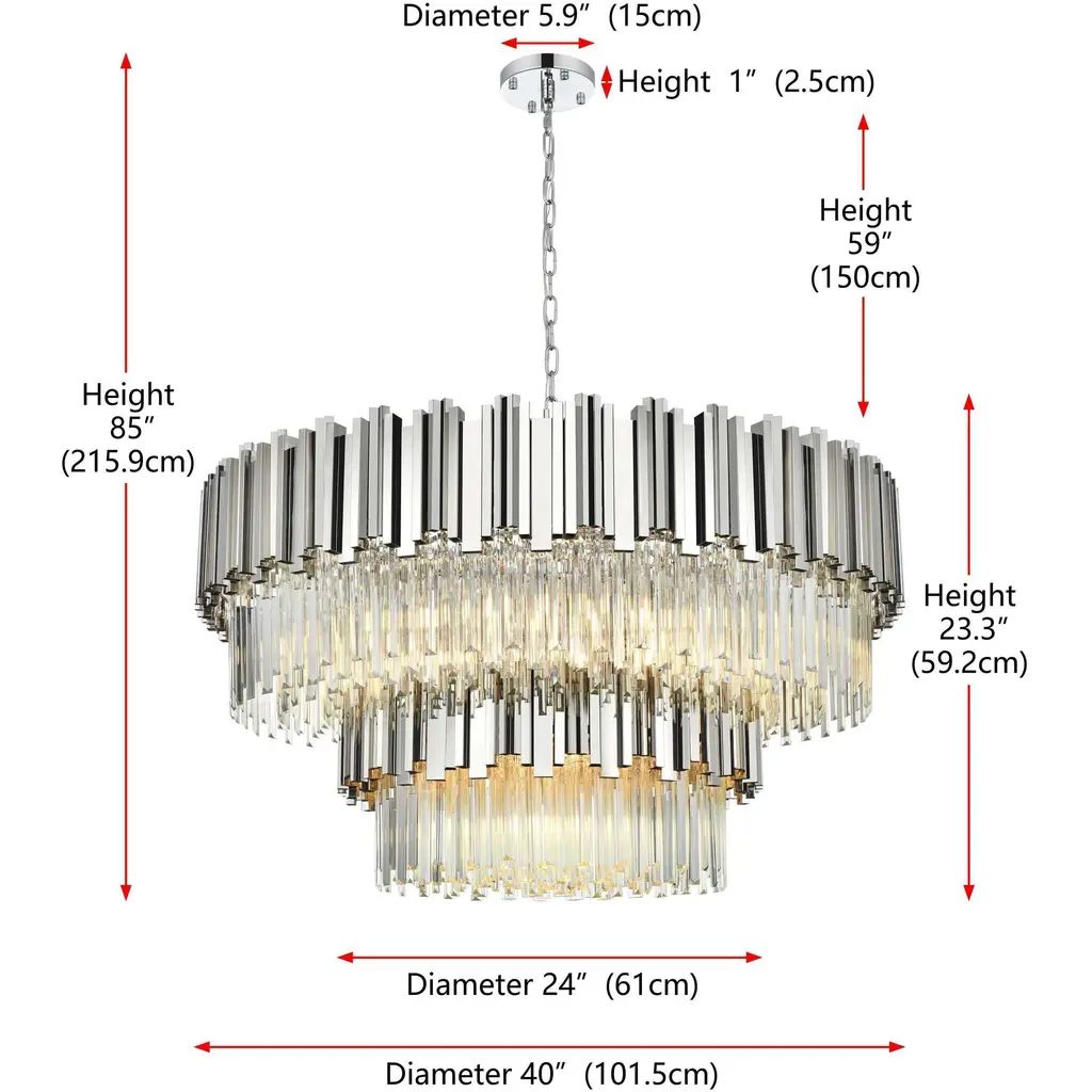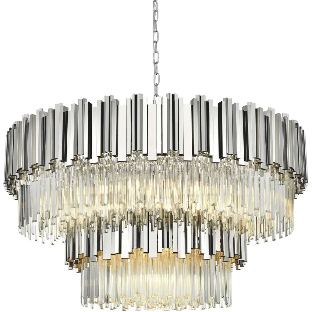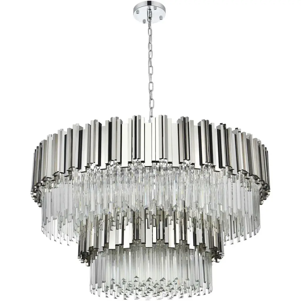 Transform your space with this stunning chandelier, a dynamic fusion of iron and staggered clear glass that exudes contemporary style and architectural artistry. The layered glass refracts light beautifully, creating a radiant display of glowing brilliance that fills the room with warmth and sophistication. The staggered arrangement of the metal and glass adds depth and dimension, making this chandelier an eye-catching centerpiece. Fully dimmable, it allows you to adjust the ambiance to suit any mood, from bright and vibrant to soft and inviting. Available in satin gold for a warm, luxurious vibe, chrome for sleek modernity, and black for bold, dramatic contrast, this fixture comes in various sizes to perfectly complement any space. Complete with a matching canopy, its an ideal choice for dining rooms, living rooms, or offices. Add a touch of refined geometry to your décor and bask in the brilliance of this radiant design.