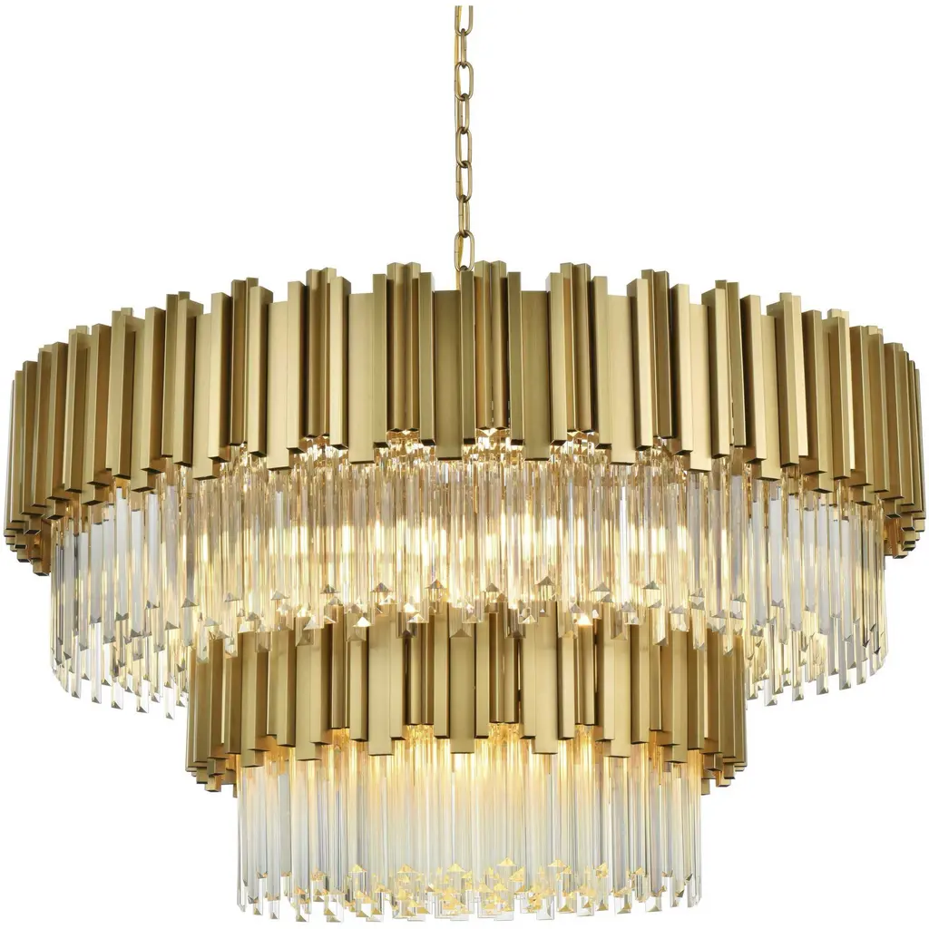 Transform your space with this stunning chandelier, a dynamic fusion of iron and staggered clear glass that exudes contemporary style and architectural artistry. The layered glass refracts light beautifully, creating a radiant display of glowing brilliance that fills the room with warmth and sophistication. The staggered arrangement of the metal and glass adds depth and dimension, making this chandelier an eye-catching centerpiece. Fully dimmable, it allows you to adjust the ambiance to suit any mood, from bright and vibrant to soft and inviting. Available in satin gold for a warm, luxurious vibe, chrome for sleek modernity, and black for bold, dramatic contrast, this fixture comes in various sizes to perfectly complement any space. Complete with a matching canopy, its an ideal choice for dining rooms, living rooms, or offices. Add a touch of refined geometry to your décor and bask in the brilliance of this radiant design.