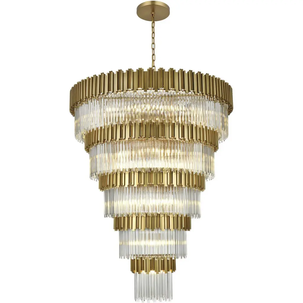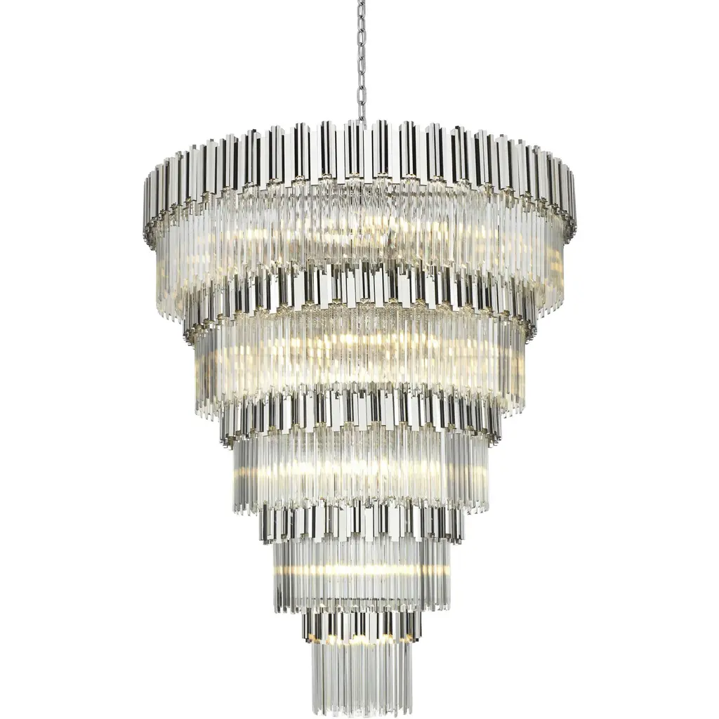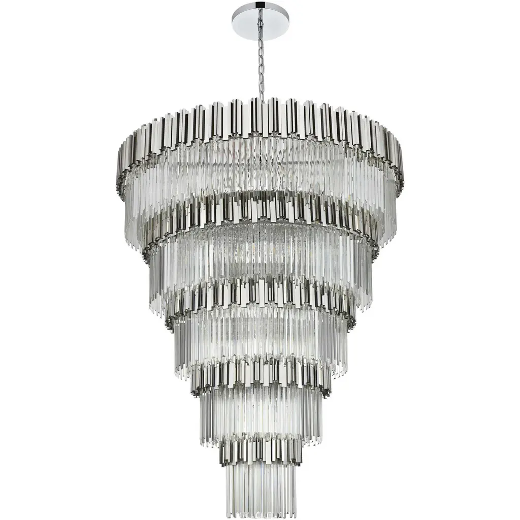 Transform your space with this stunning chandelier, a dynamic fusion of iron and staggered clear glass that exudes contemporary style and architectural artistry. The layered glass refracts light beautifully, creating a radiant display of glowing brilliance that fills the room with warmth and sophistication. The staggered arrangement of the metal and glass adds depth and dimension, making this chandelier an eye-catching centerpiece. Fully dimmable, it allows you to adjust the ambiance to suit any mood, from bright and vibrant to soft and inviting. Available in satin gold for a warm, luxurious vibe, chrome for sleek modernity, and black for bold, dramatic contrast, this fixture comes in various sizes to perfectly complement any space. Complete with a matching canopy, its an ideal choice for dining rooms, living rooms, or offices. Add a touch of refined geometry to your décor and bask in the brilliance of this radiant design.