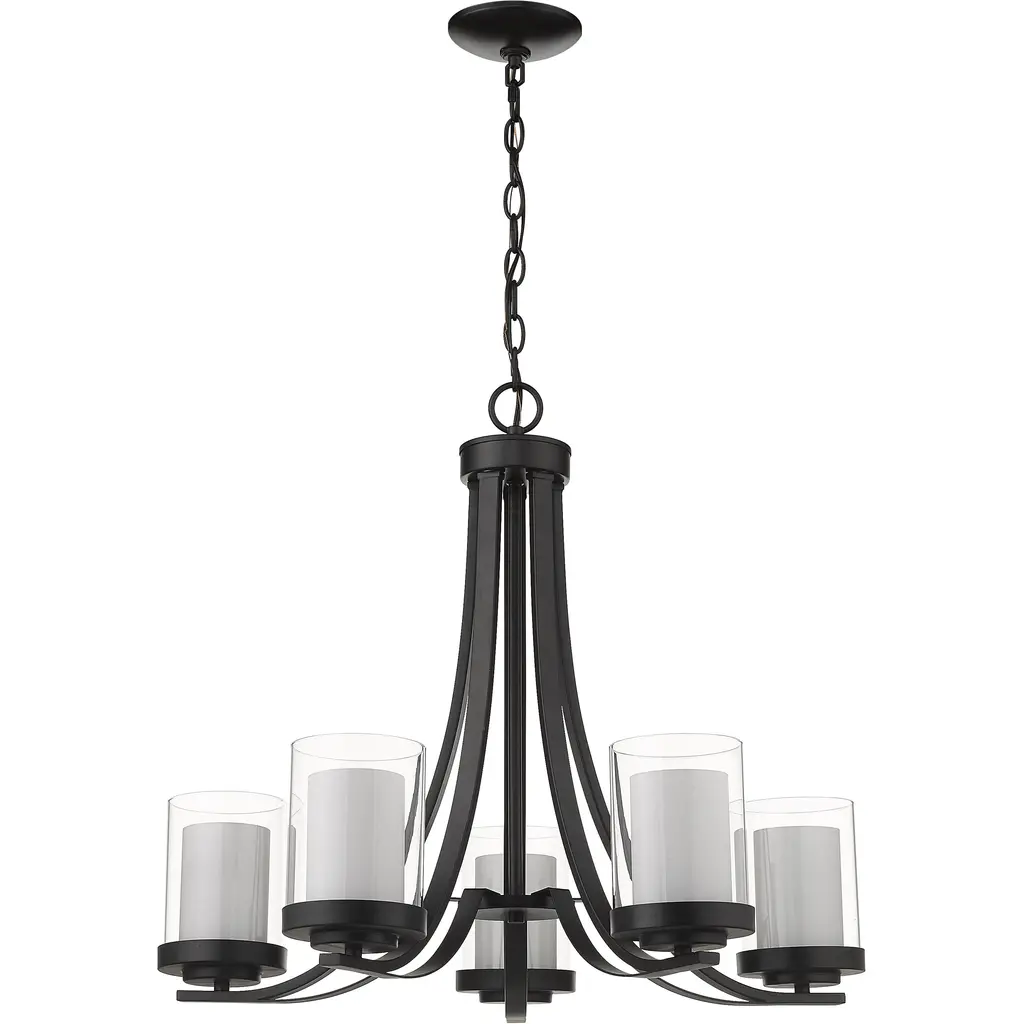 Give your dining room or great room a chic, sophisticated update. This beautiful, matte black chandelier features five glowing bulbs beneath five delicate, glass shades that are matte opal on the inside and clear on the outside. An exquisite lighting option to highlight your refined sense of style.