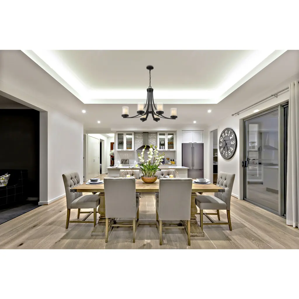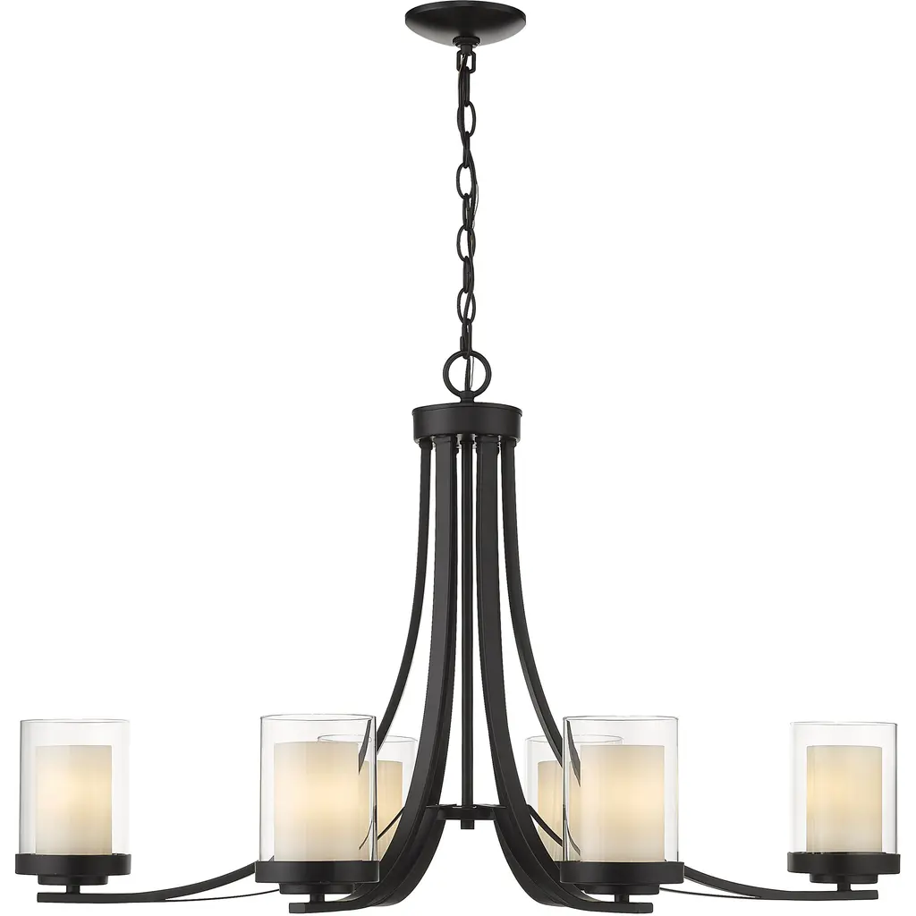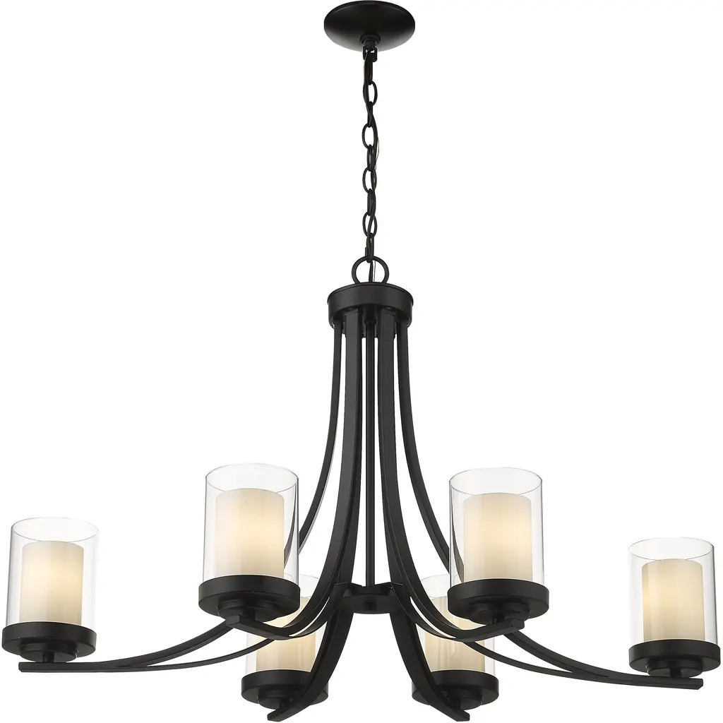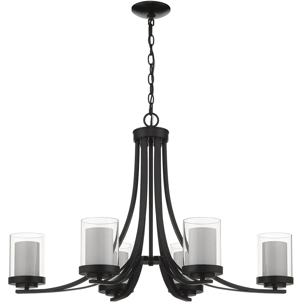 Give your dining room or great room a chic, sophisticated update. This beautiful, matte black chandelier features six glowing bulbs beneath six delicate, glass shades that are matte opal on the inside and clear on the outside. An exquisite lighting option to highlight your refined sense of style.