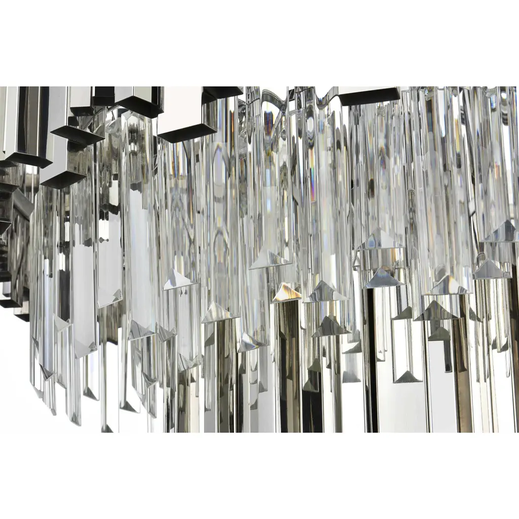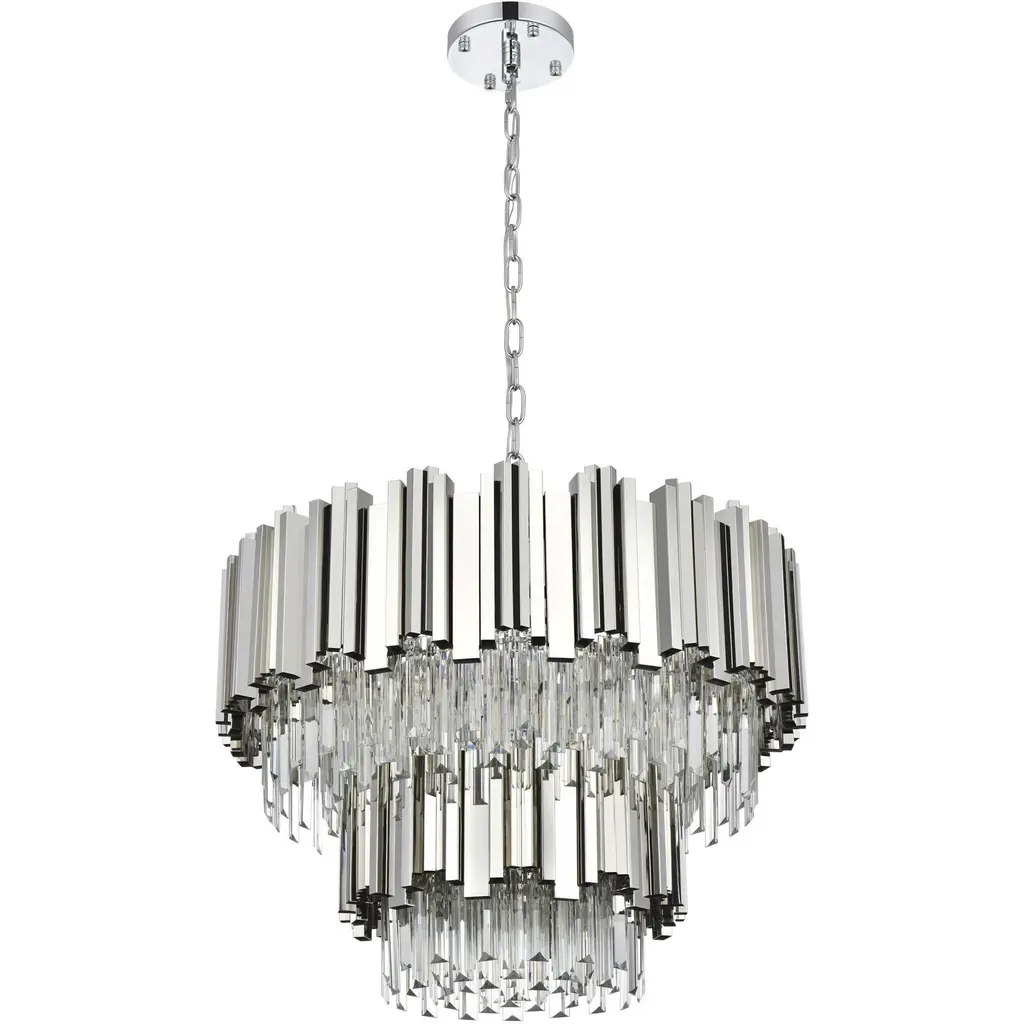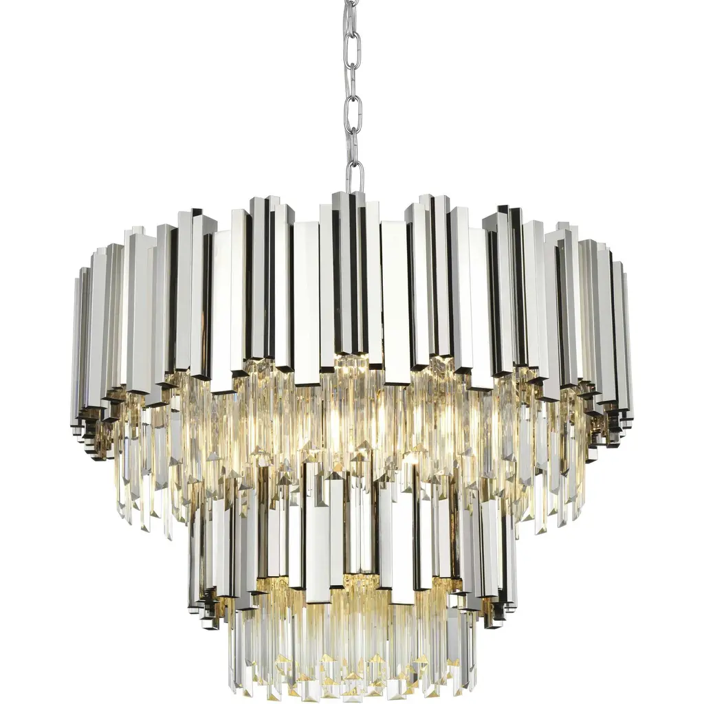 Transform your space with this stunning chandelier, a dynamic fusion of iron and staggered clear glass that exudes contemporary style and architectural artistry. The layered glass refracts light beautifully, creating a radiant display of glowing brilliance that fills the room with warmth and sophistication. The staggered arrangement of the metal and glass adds depth and dimension, making this chandelier an eye-catching centerpiece. Fully dimmable, it allows you to adjust the ambiance to suit any mood, from bright and vibrant to soft and inviting. Available in satin gold for a warm, luxurious vibe, chrome for sleek modernity, and black for bold, dramatic contrast, this fixture comes in various sizes to perfectly complement any space. Complete with a matching canopy, its an ideal choice for dining rooms, living rooms, or offices. Add a touch of refined geometry to your décor and bask in the brilliance of this radiant design.