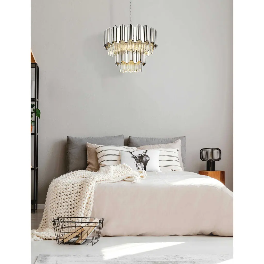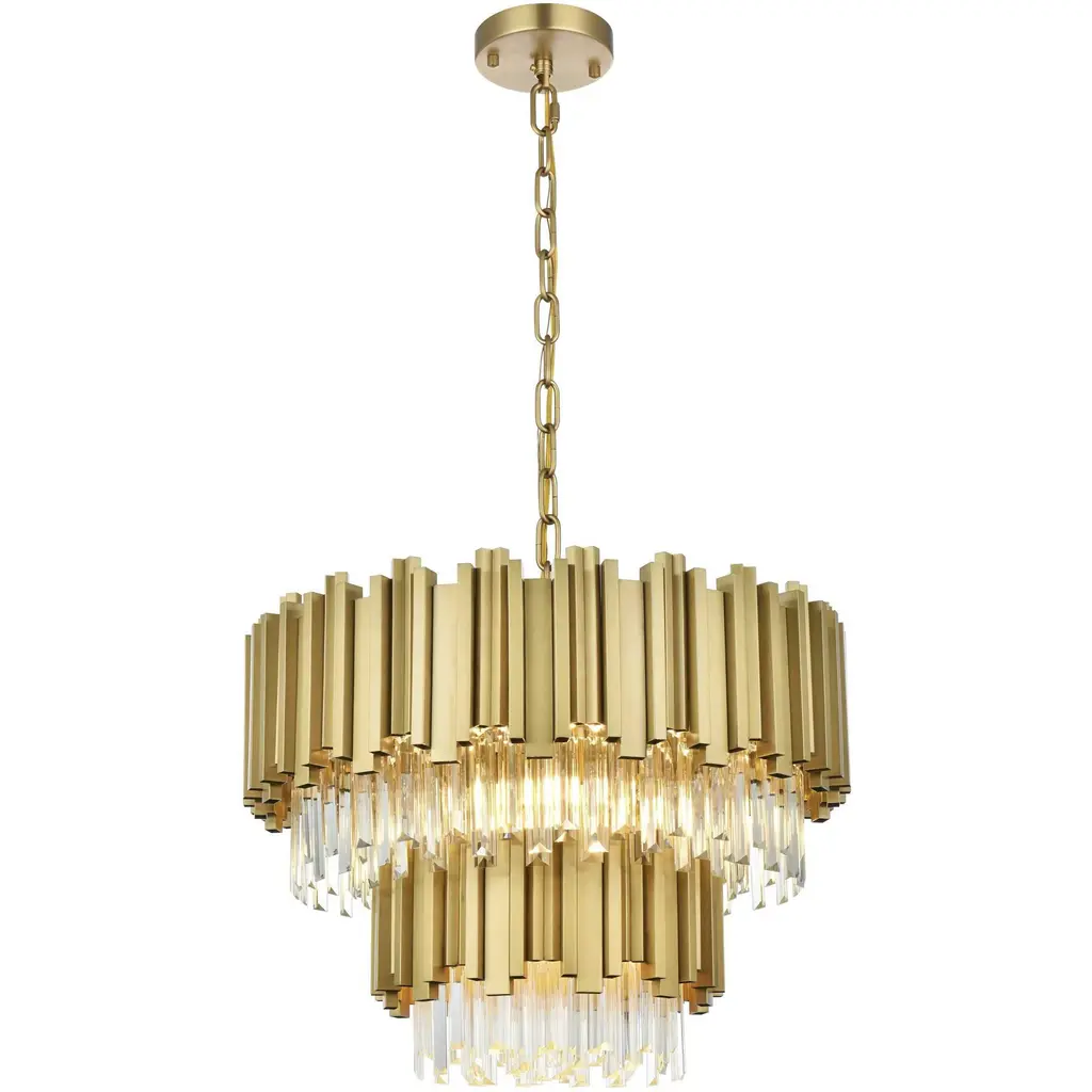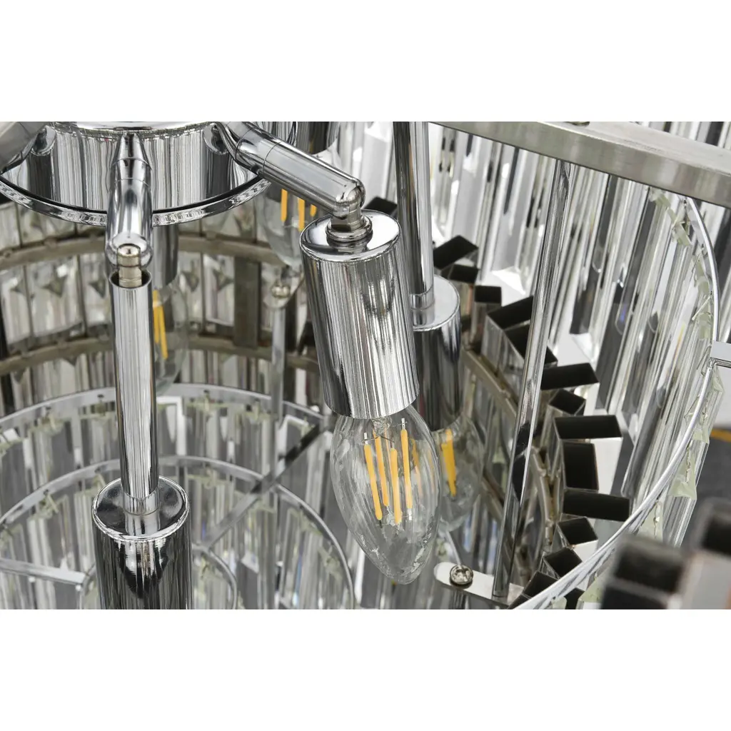 Transform your space with this stunning chandelier, a dynamic fusion of iron and staggered clear glass that exudes contemporary style and architectural artistry. The layered glass refracts light beautifully, creating a radiant display of glowing brilliance that fills the room with warmth and sophistication. The staggered arrangement of the metal and glass adds depth and dimension, making this chandelier an eye-catching centerpiece. Fully dimmable, it allows you to adjust the ambiance to suit any mood, from bright and vibrant to soft and inviting. Available in satin gold for a warm, luxurious vibe, chrome for sleek modernity, and black for bold, dramatic contrast, this fixture comes in various sizes to perfectly complement any space. Complete with a matching canopy, its an ideal choice for dining rooms, living rooms, or offices. Add a touch of refined geometry to your décor and bask in the brilliance of this radiant design.
