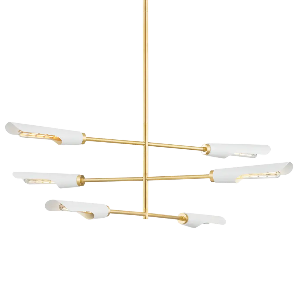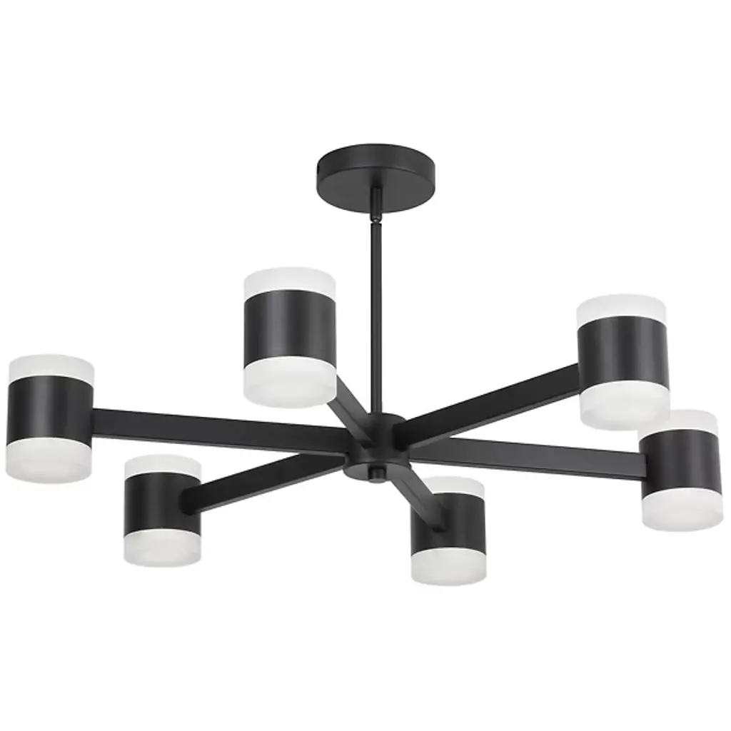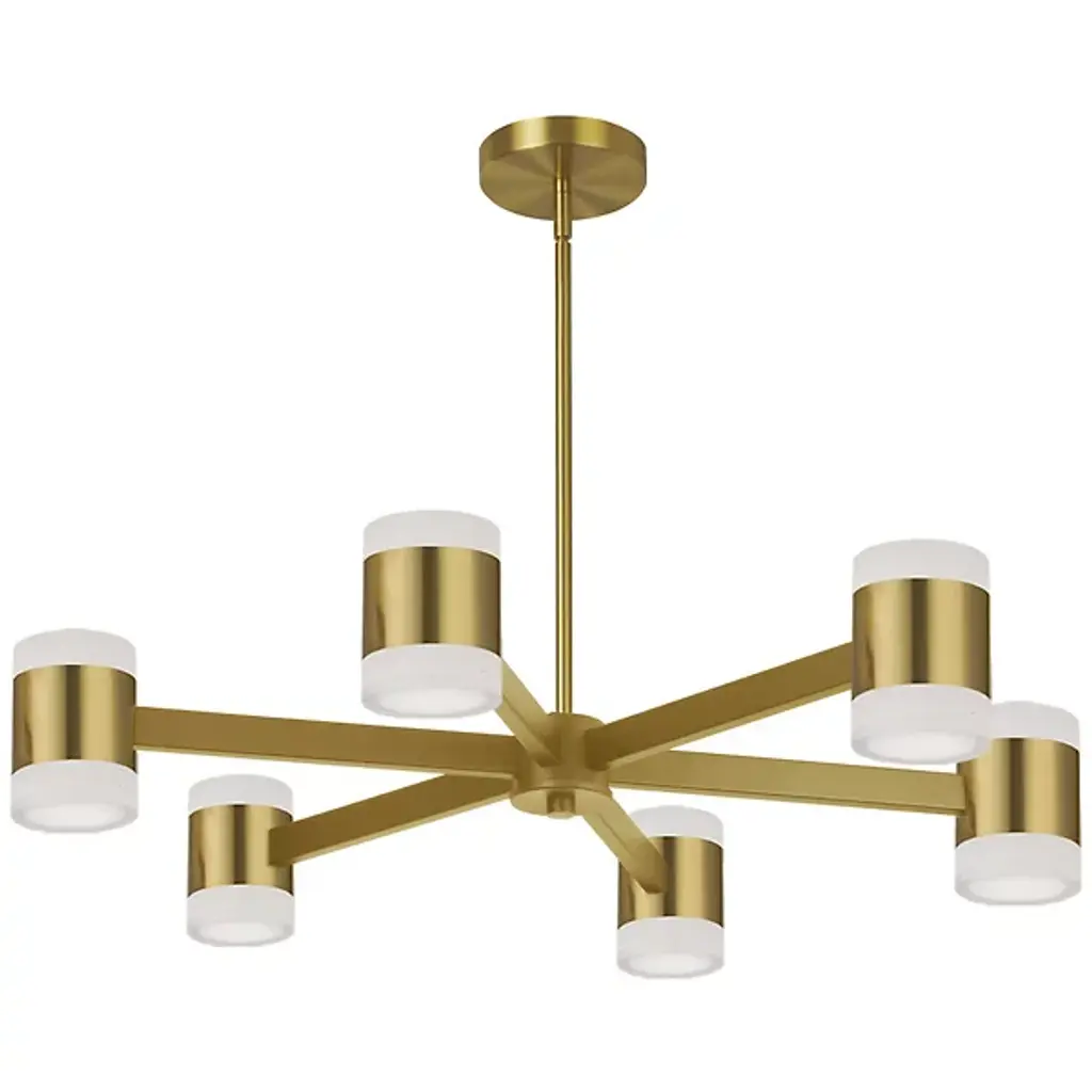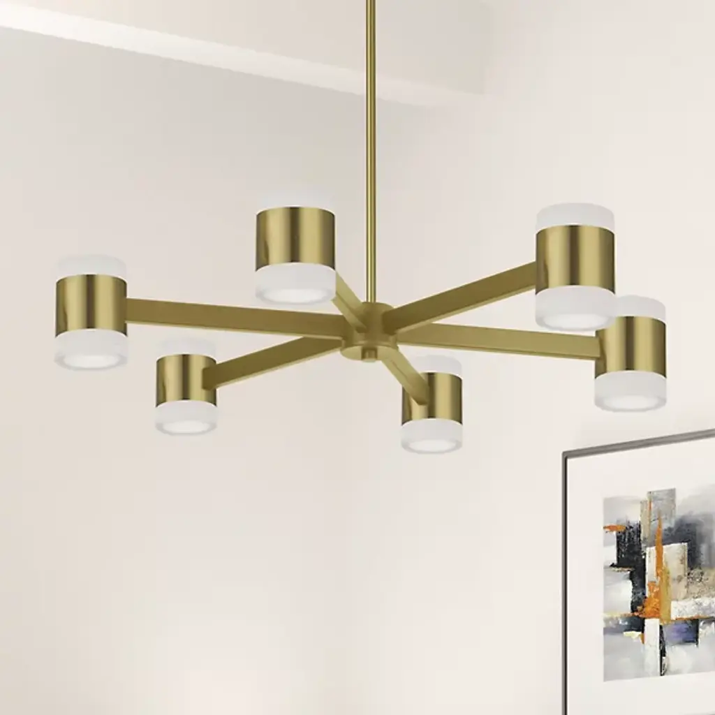 A mid-century modern-inspired design paired with 21st century lighting technology. The Wilson LED Chandelier by Dainolite has a pleasingly graphic look, with several metal arms arranged evenly around the central hub. At the ends of the arms, cylindrical lights with acrylic discs on the top and bottom diffuse the light of integrated LEDs. The resulting ambient light goes up, down and all-around the dining room or foyer in which this chandelier is installed.