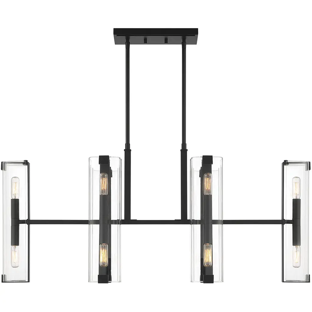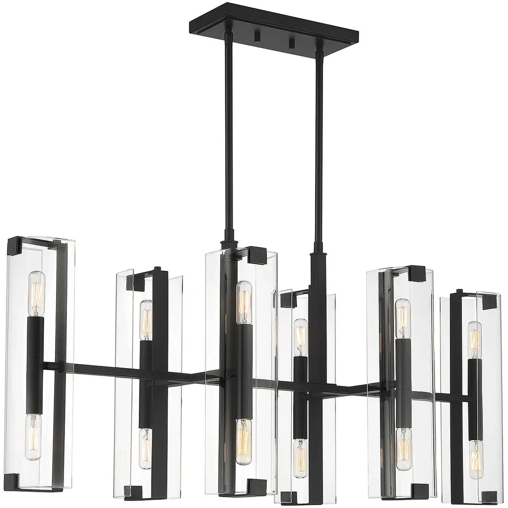 Sleek and sophisticated The Savoy House Winfield 12-light linear chandelier has an eye-catching design, yet the clean lines and transparent glass keep the mood serene. Bold straight lines of the downrod, frame and bulb sockets are highlighted by the matte black finish. Each of the six light arms holds two 60W candelabra size bulbs, one facing up and one facing down, for splendid illumination through the pristine clear glass shades. This chandelier measures 38" long and has an adjustable height ranging from 23.25" to 69.75". Overall, its a chic and stylish fixture for your dining room, living room, entryway, kitchen island, family room, bar, office or media room.