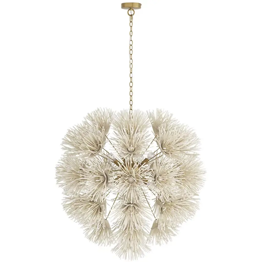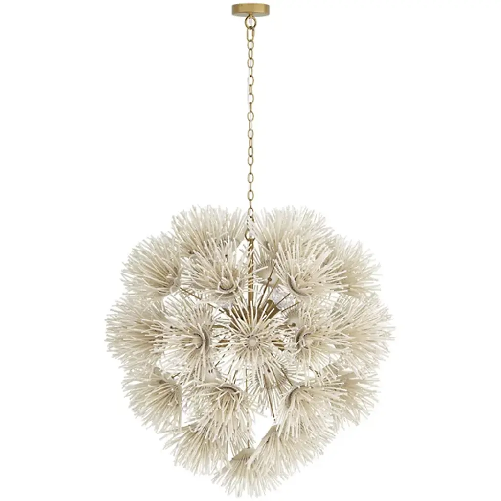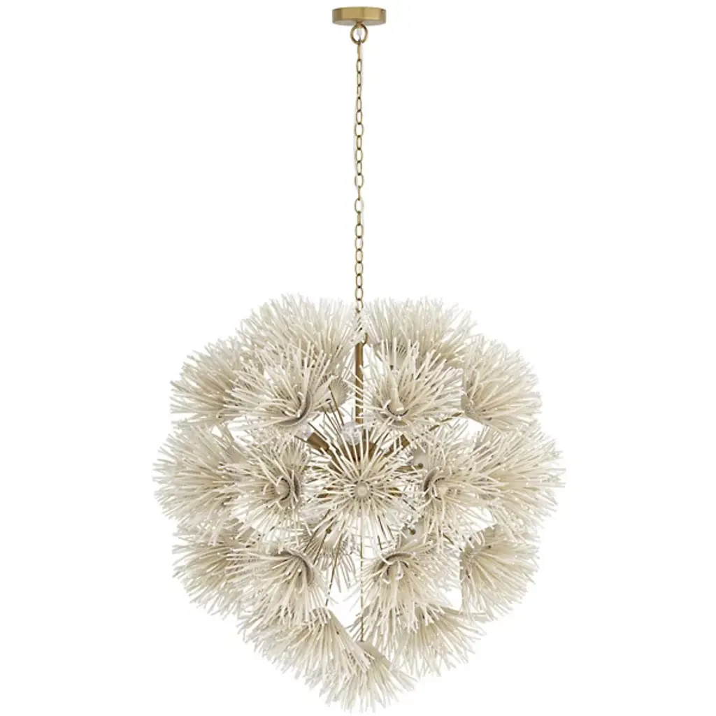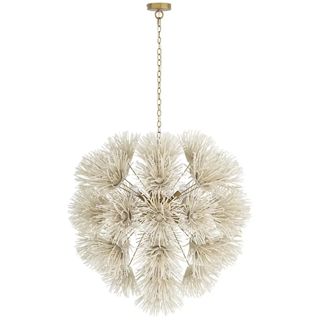 Wild and worldly, the Winona Chandelier by Arteriors is cleverly crafted with ivory coconut shells, which are hand-formed into delicate dandelion shapes. This artisanal piece forms an acorn-shaped silhouette, giving the Winona Chandelier a Bohemian quality. Your chandelier maintains its suspension in midair through attachment to a linked chain which is secured by a ceiling canopy.