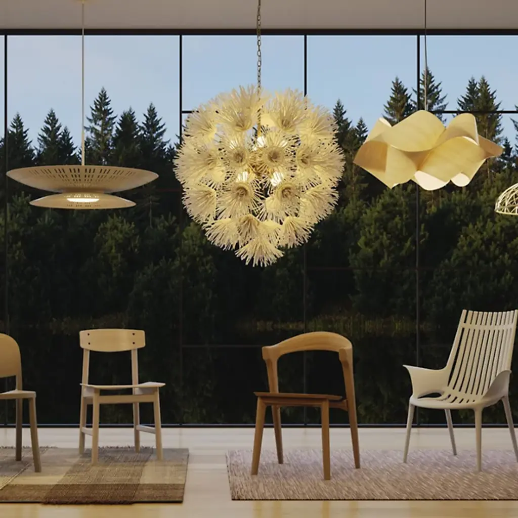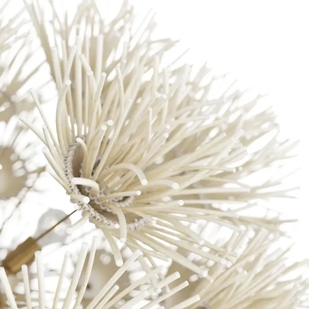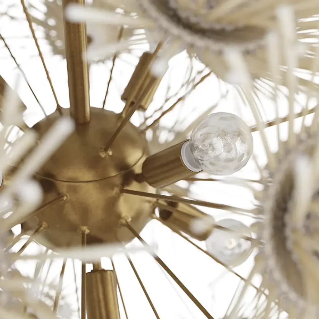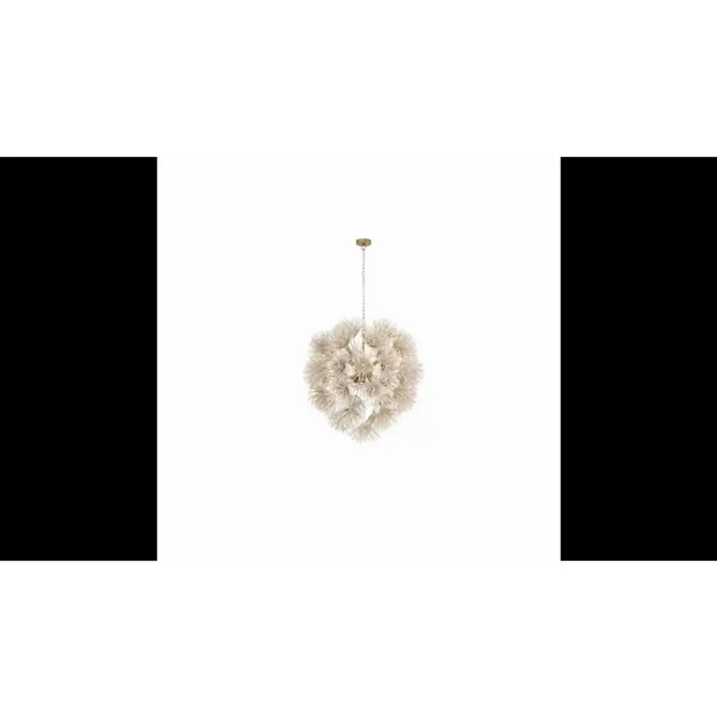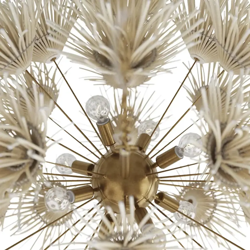 Wild and worldly, the Winona Chandelier by Arteriors is cleverly crafted with ivory coconut shells, which are hand-formed into delicate dandelion shapes. This artisanal piece forms an acorn-shaped silhouette, giving the Winona Chandelier a Bohemian quality. Your chandelier maintains its suspension in midair through attachment to a linked chain which is secured by a ceiling canopy.