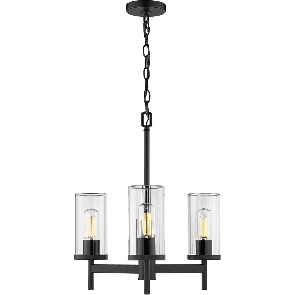Bring timeless sophistication into your home with the Golden Lighting Winslett 3-light Chandelier. Featuring a clear glass shade and a matte black frame, it creates a welcoming atmosphere.This stunning glass shade showcases a ribbed texture that refracts light beautifully, enhancing its modern design. Its captivating clear ribbed glass allows for a soft, inviting glow, perfect for enriching your space with warmth and style.With a matte black finish that absorbs light while providing a smooth touch, this chandelier complements a range of decor from minimalist to industrial. It is dry location rated, ideal for indoor spaces such as living rooms and hallways. The installation is made easy with sloped-ceiling compatibility and an adjustable height ranging from 24.75" to 93.75".Dimensions: Overall dimensions are 19.5"W x 21"H x 19.5"D. Requires three E26 medium base bulbs (not included), with a maximum wattage of 60 per bulb.Elevate your interiors with the quality craftsmanship of the Golden Lighting Winslett Collection, where every detail is crafted for perfection.