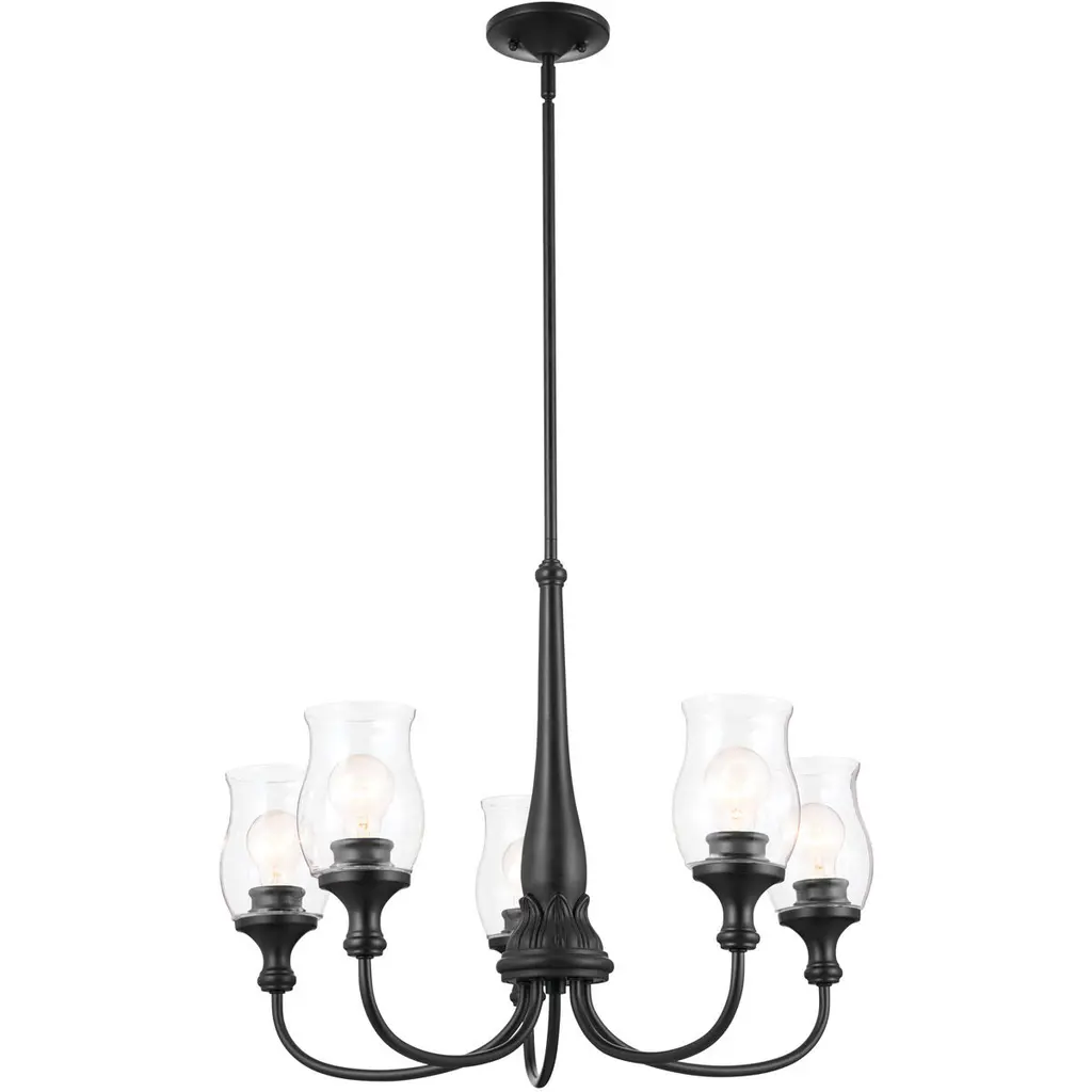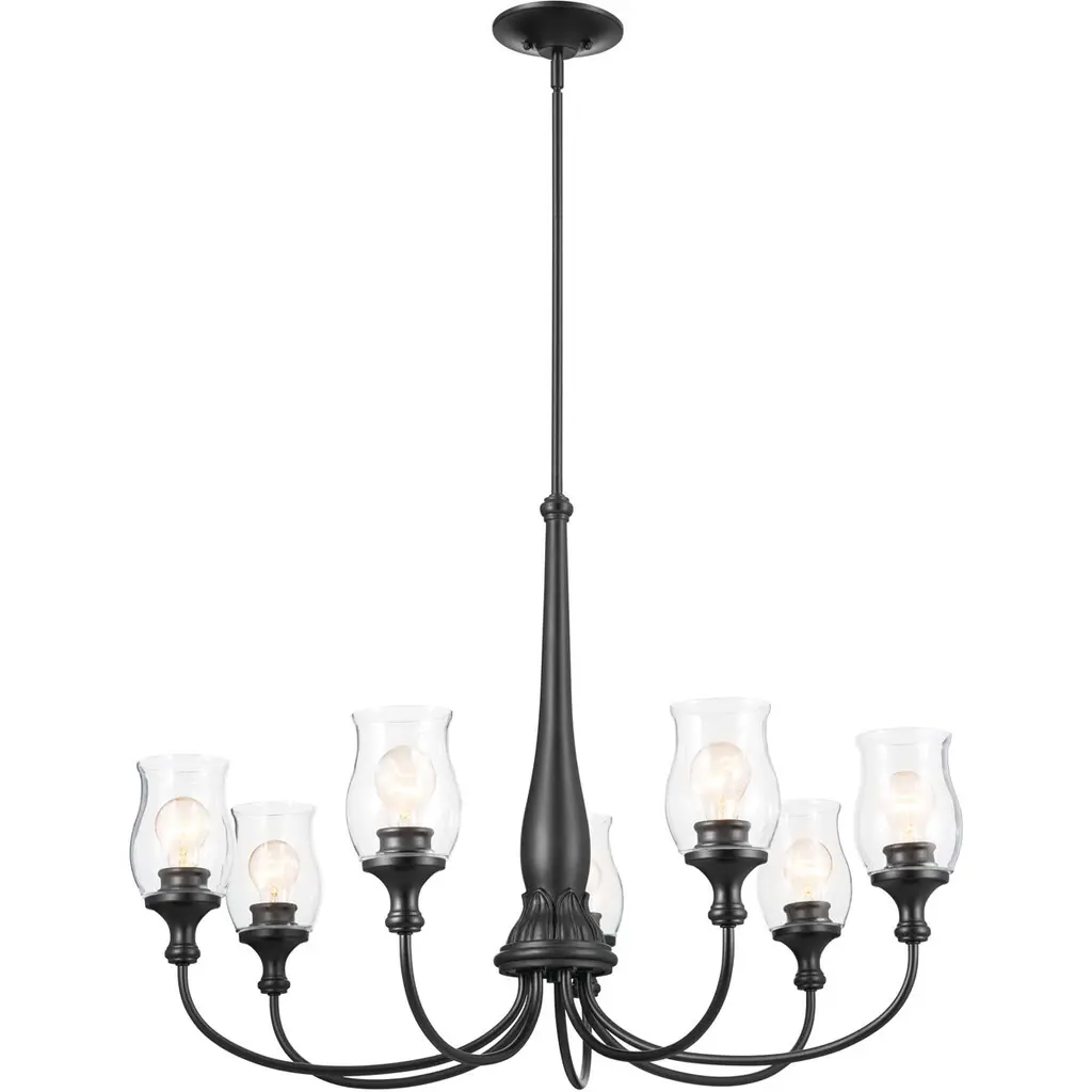 Immerse yourself in a home atmosphere primed for relaxation and inspired thinking with the beautiful craftsmanship of this chandelier. Savor this fresh take on a classic light choice as your gaze traces graceful arms and clean crisp lines coated in a beautiful black finish. Lightly seeded glass shades rest in shiny pedestal light bases that adds an unexpected, but welcomed dash of modern personality to this clean, traditional design.