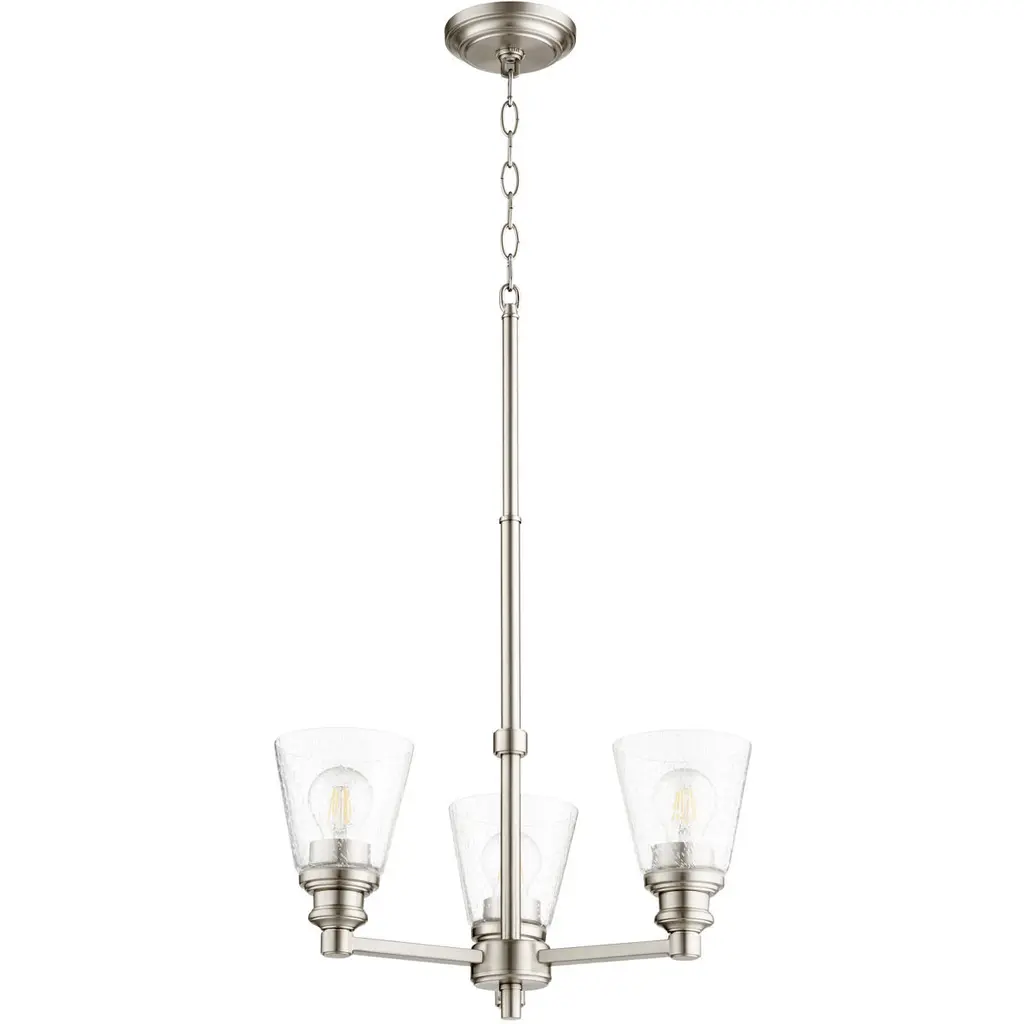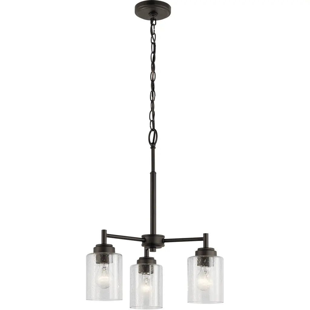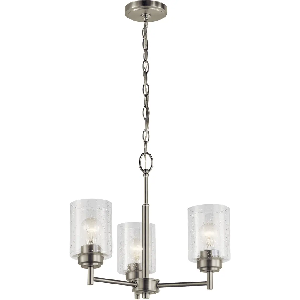 The modern Winslow 3-light mini chandelier in a Brushed Nickel finish with Clear Seeded glass shade pair beautifully with the linear arms, bringing light and dimension to a space.