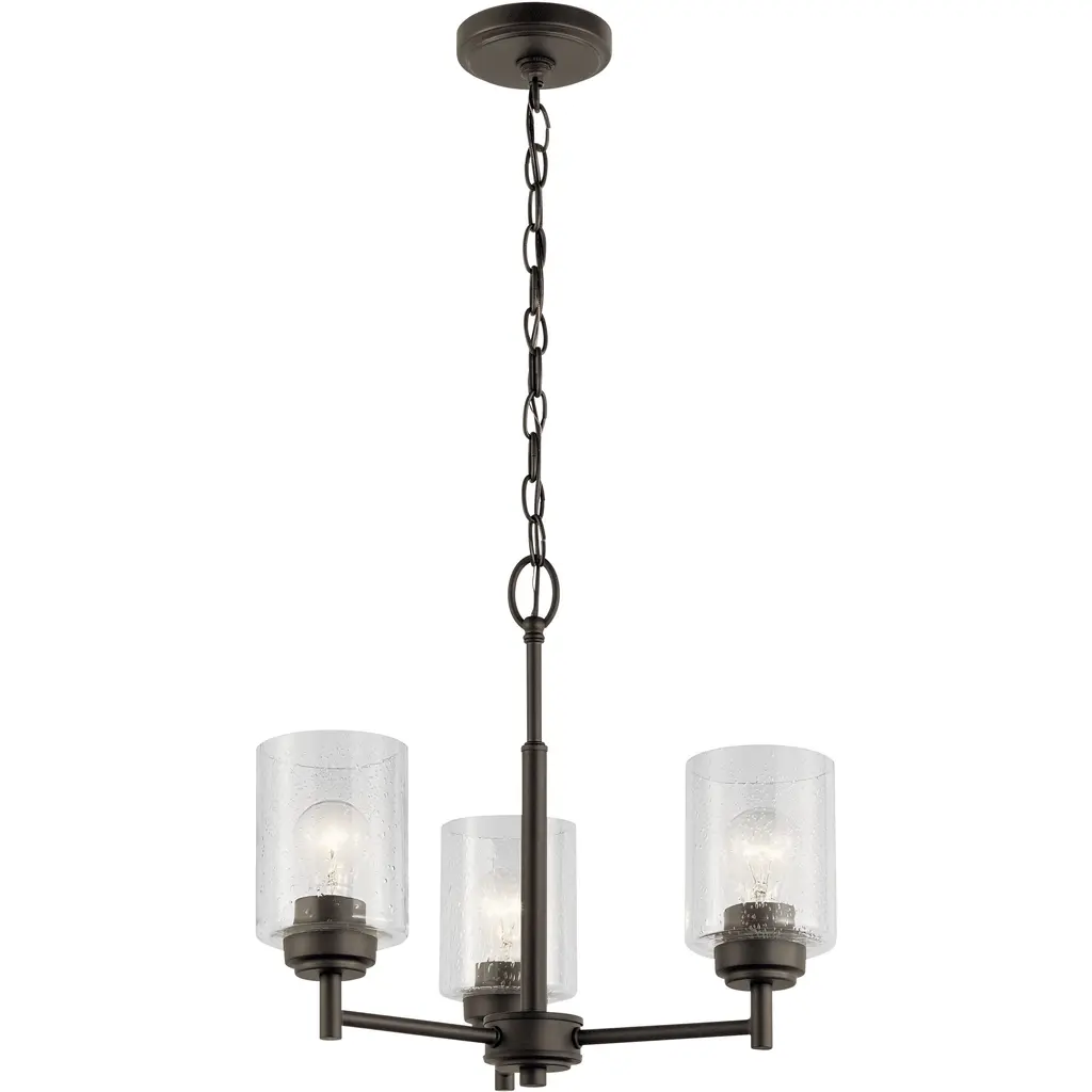 The modern Winslow 3-light mini chandelier in an Olde Bronze finish with Clear Seeded glass shade pair beautifully with the linear arms, bringing light and dimension to a space.
