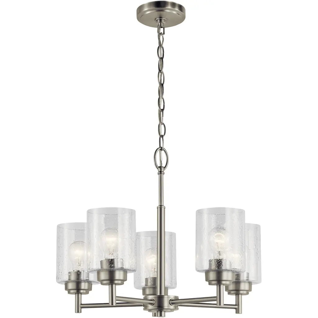 The modern Winslow 5-light chandelier in a Brushed Nickel finish with Clear Seeded glass shade pair beautifully with the linear arms, bringing light and dimension to a space.