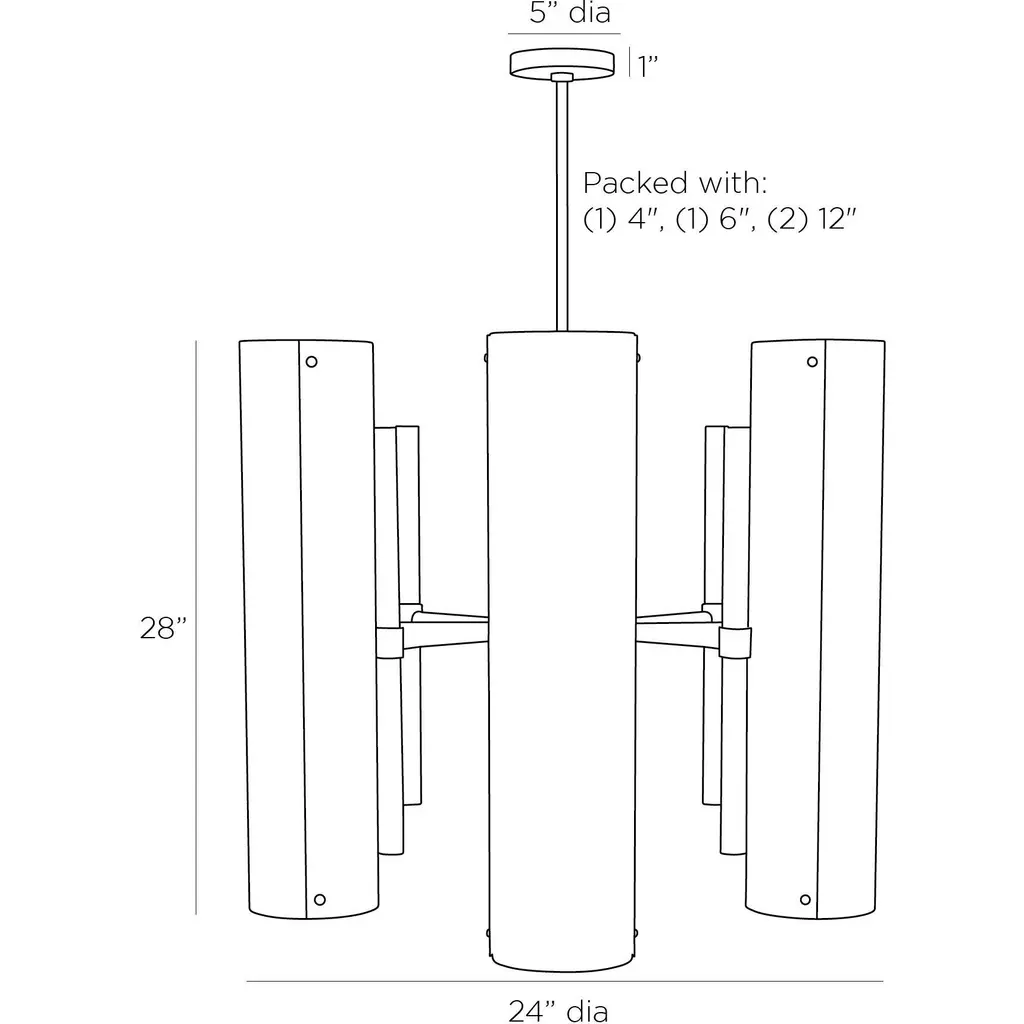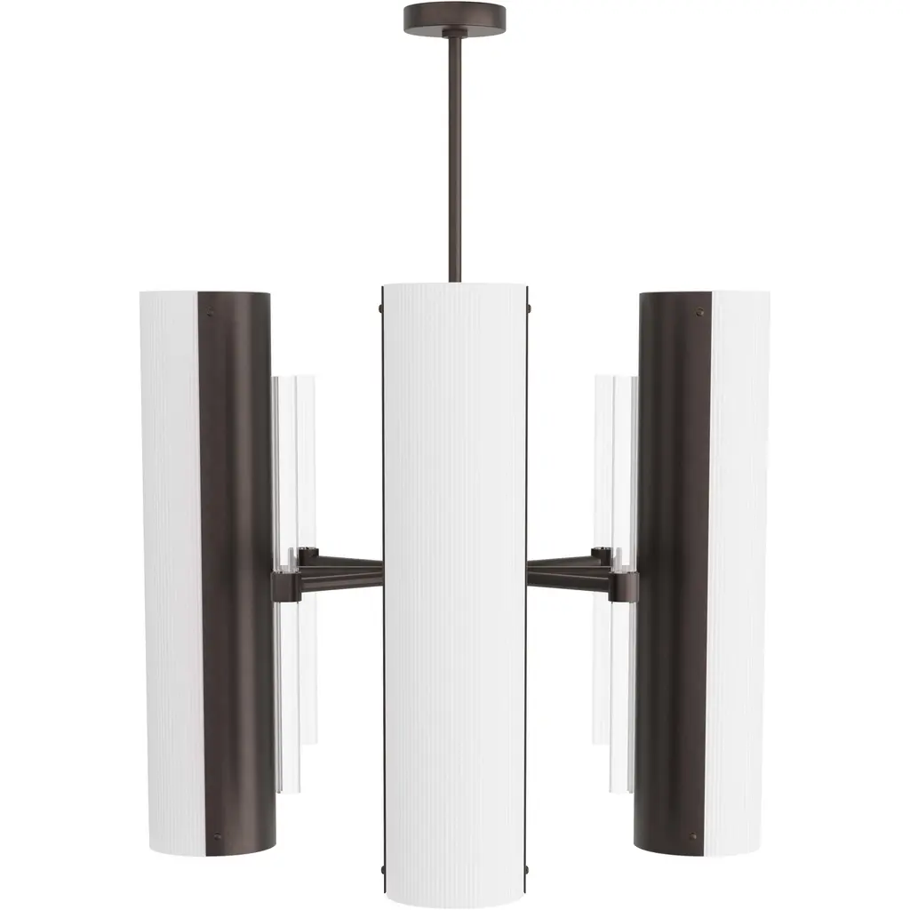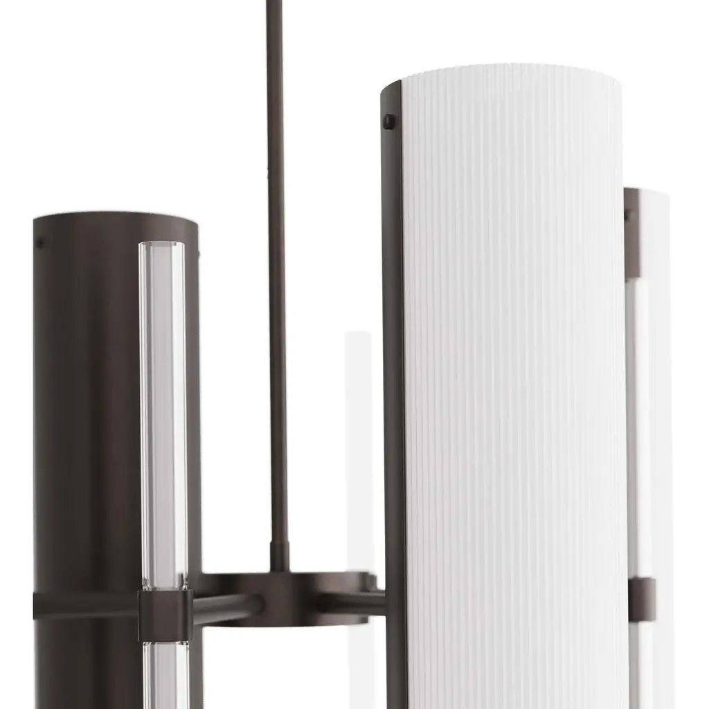 Our winslow chandelier exudes penthouse sophistication, designed in a framework of english bronze steel. A linear arrangement of ribbed, white acrylic and english bronze cylinder shades that extend off four arms, divided by suspended clear crystal tubes. The chic chandelier is suspended from a pipe that is connected to a disc canopy. Damp-rated, although limited covered outdoor conditions may affect finish.