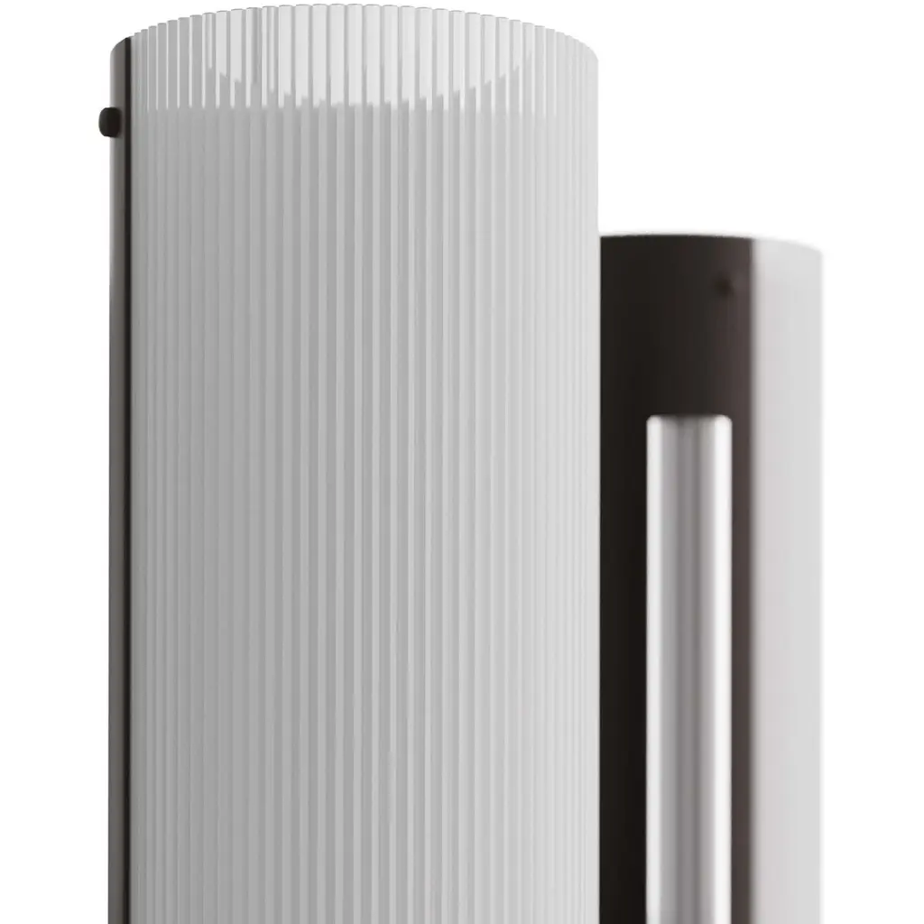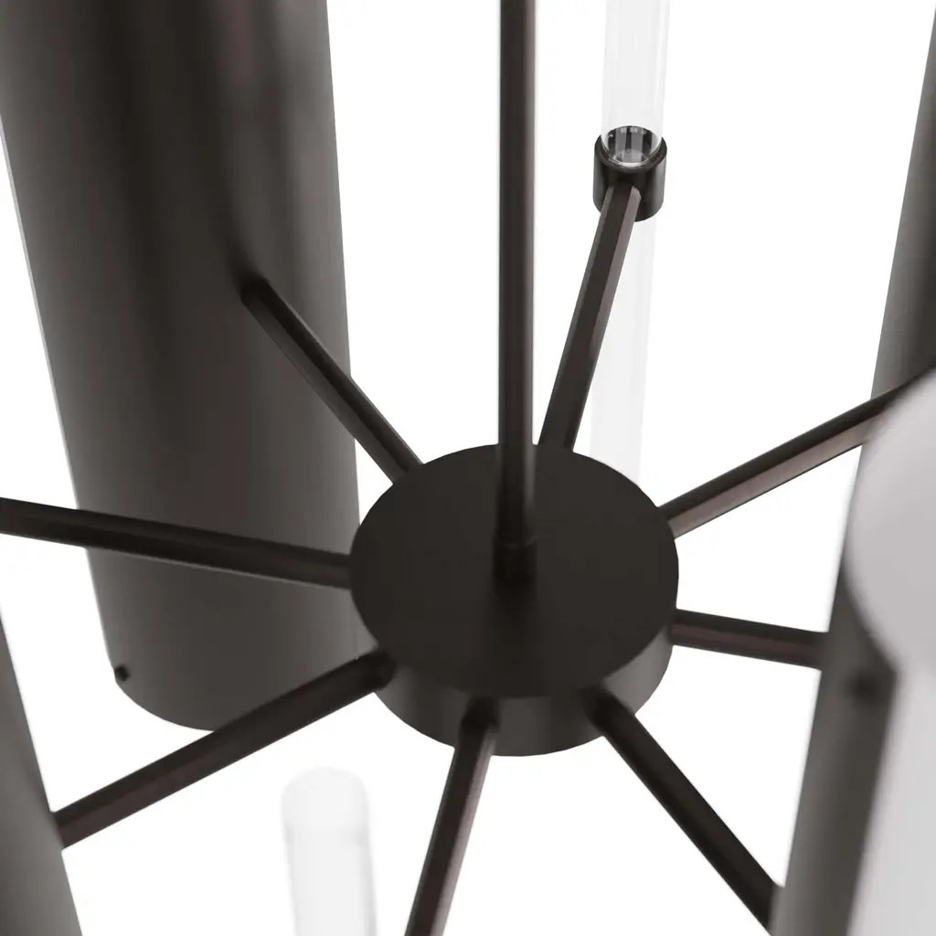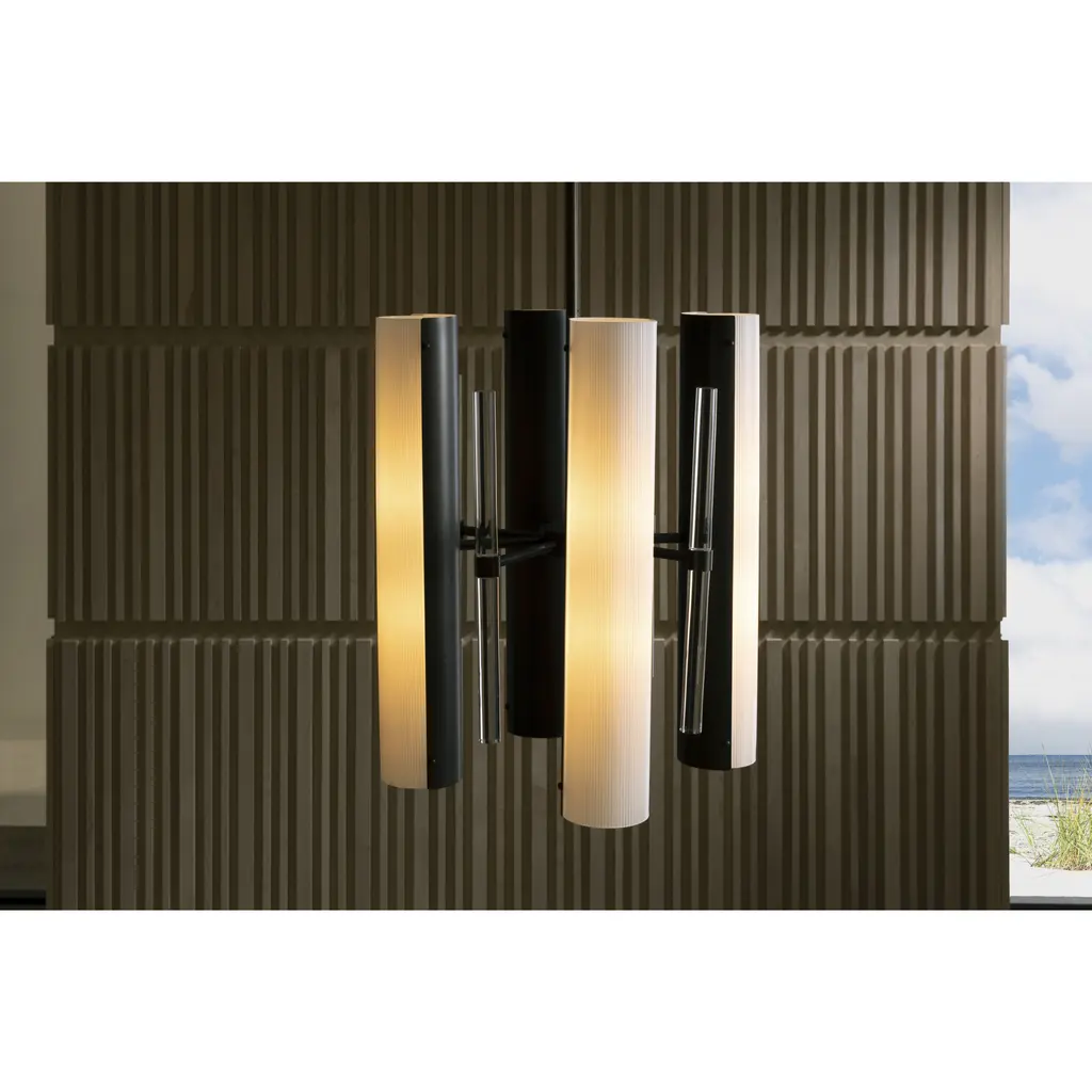Our winslow chandelier exudes penthouse sophistication, designed in a framework of english bronze steel. A linear arrangement of ribbed, white acrylic and english bronze cylinder shades that extend off four arms, divided by suspended clear crystal tubes. The chic chandelier is suspended from a pipe that is connected to a disc canopy. Damp-rated, although limited covered outdoor conditions may affect finish.