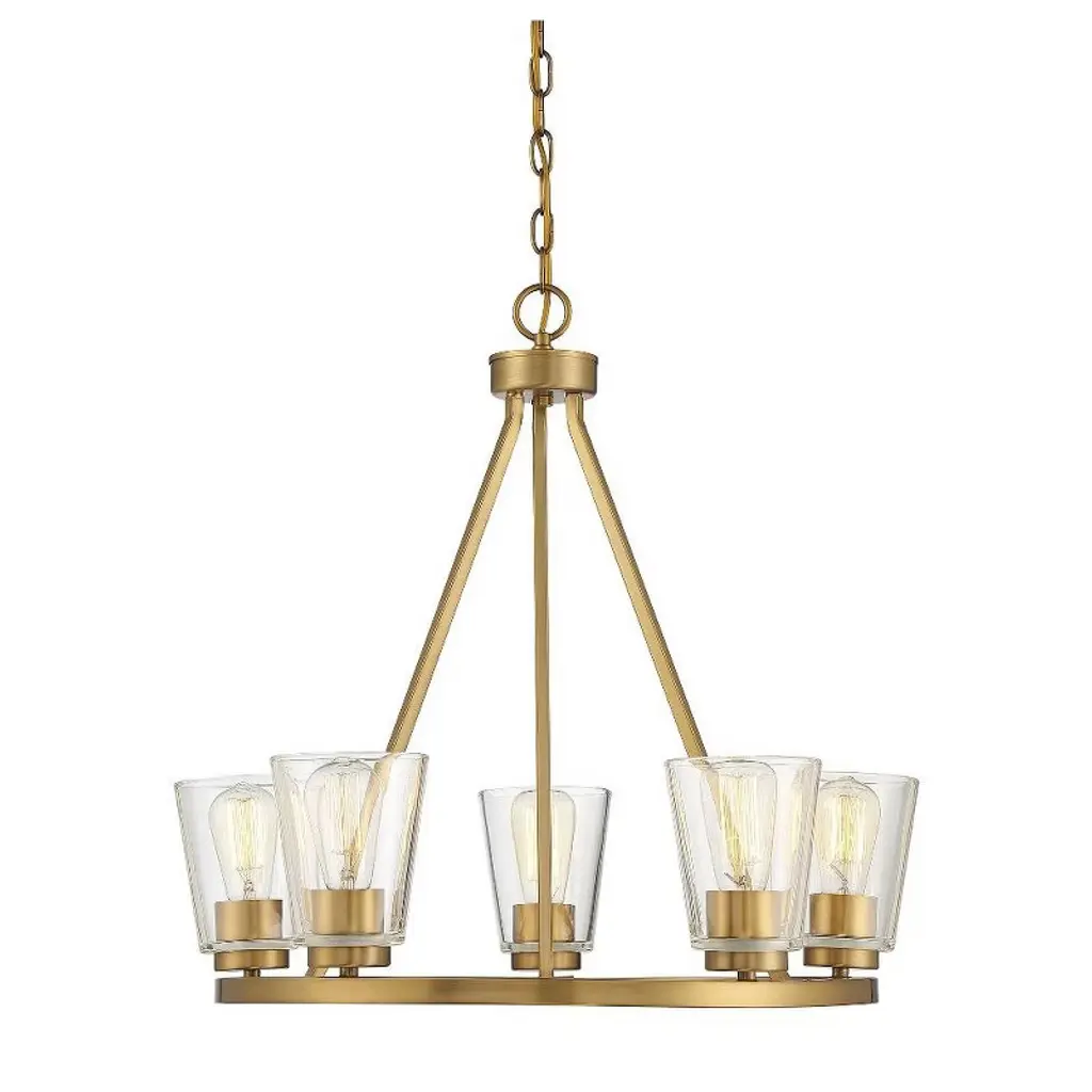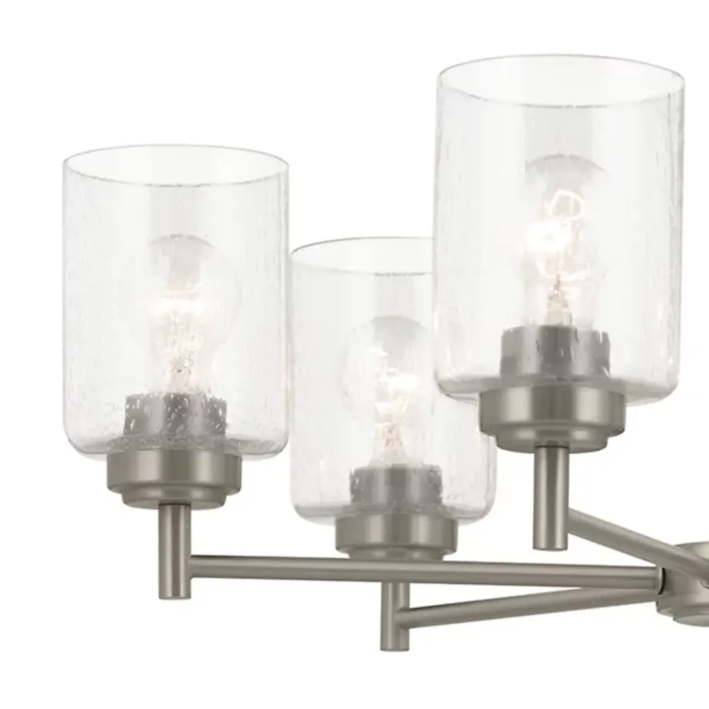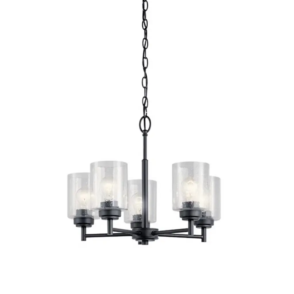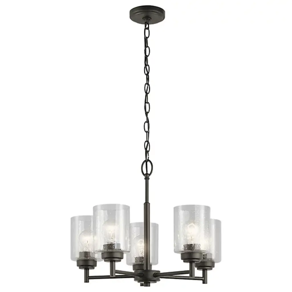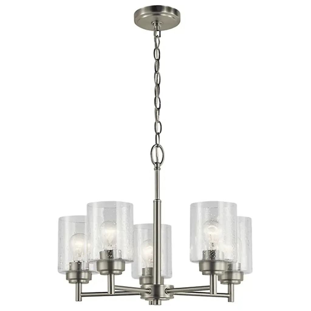 The Winslow 5 Light Chandelier by Kichelr is a marvelous fixture that provides a beautiful embodiment of a contemporary style. Its 5-light feature makes for a great piece to put in your home and serve excellent lighting along with its warm finishes and Clear Seeded glass shades. Its sophisticated exterior offers a warm welcoming in any modern-day home.