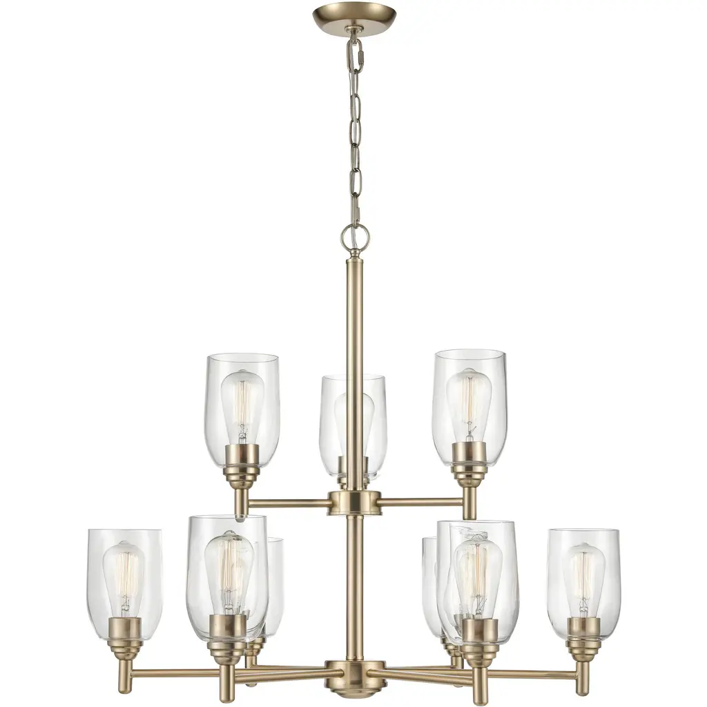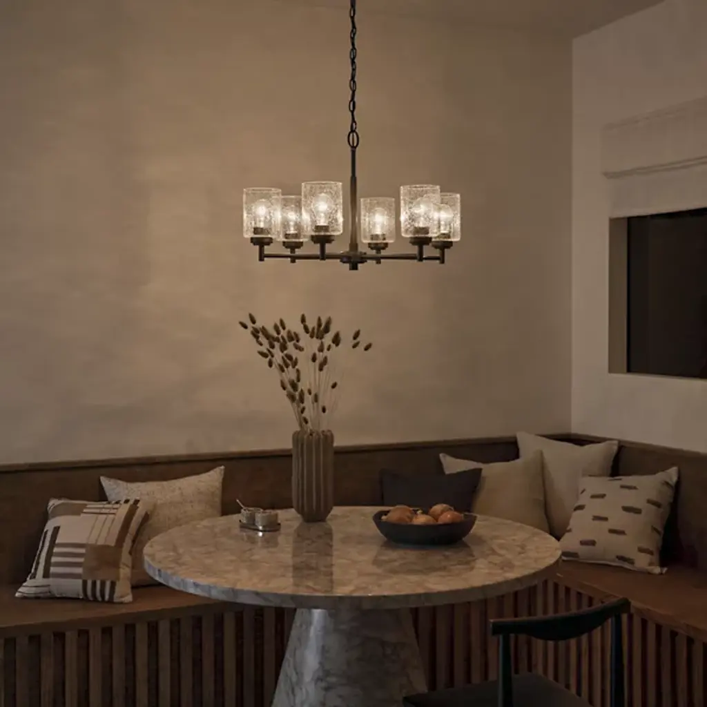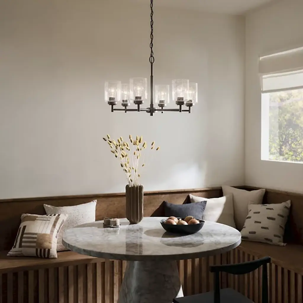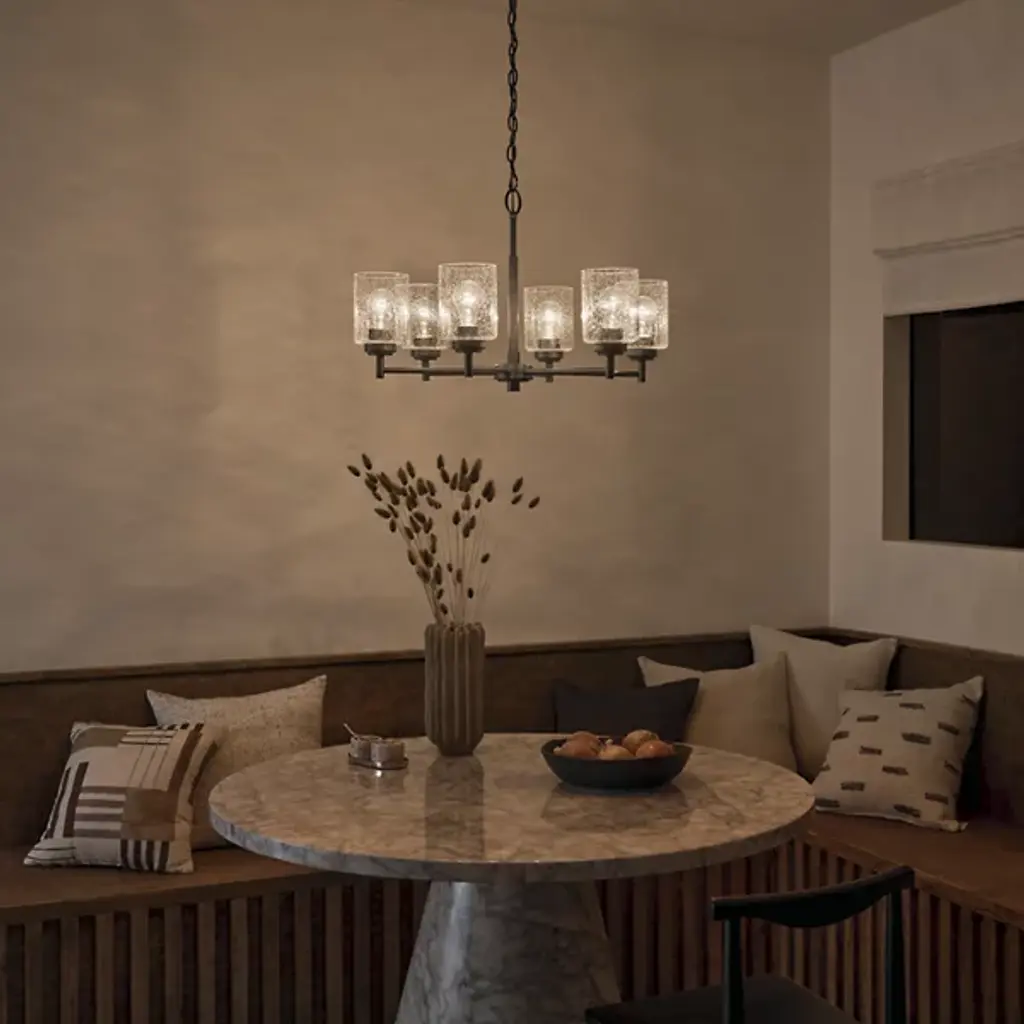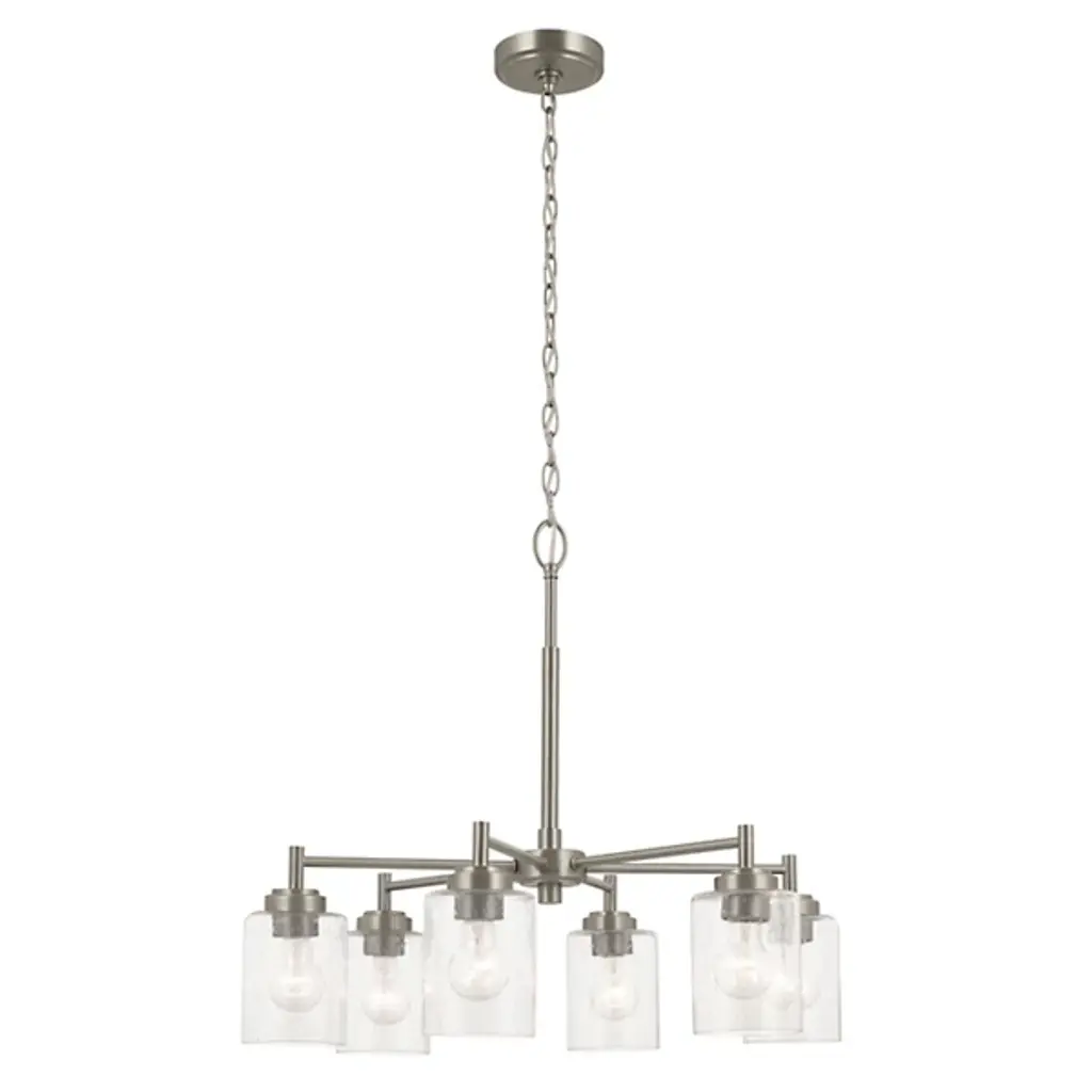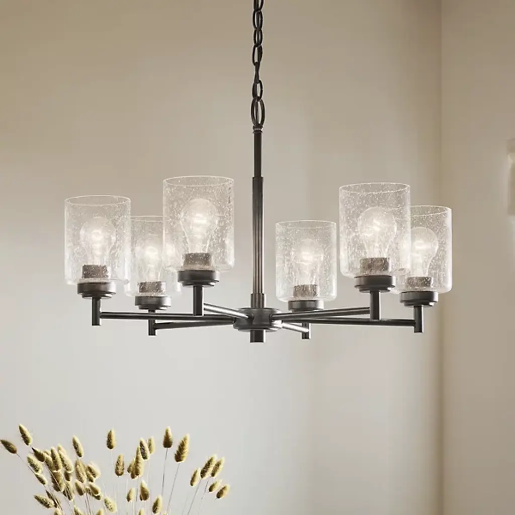 The Winslow 5 Light Chandelier by Kichelr is a marvelous fixture that provides a beautiful embodiment of a contemporary style. Its 5-light feature makes for a great piece to put in your home and serve excellent lighting along with its warm finishes and Clear Seeded glass shades. Its sophisticated exterior offers a warm welcoming in any modern-day home.