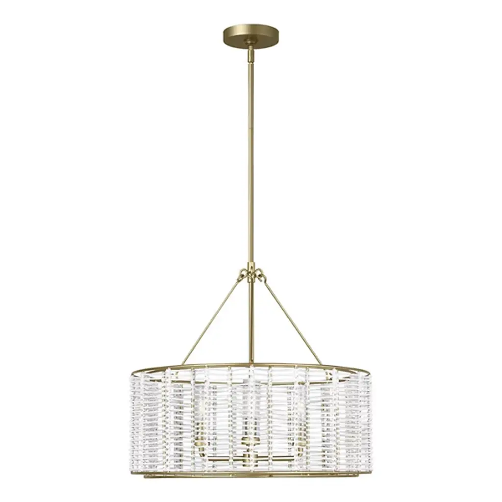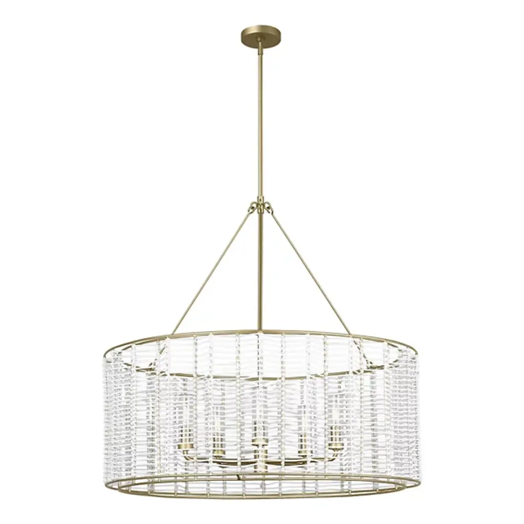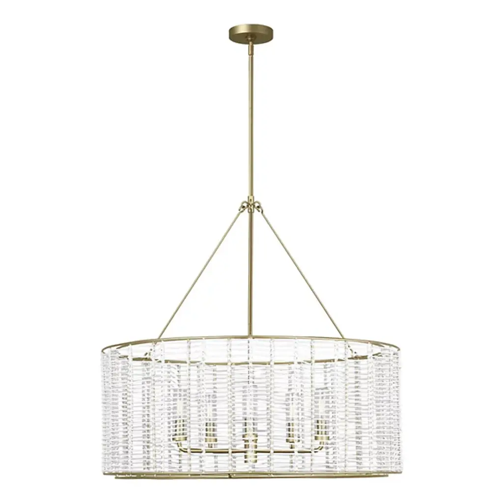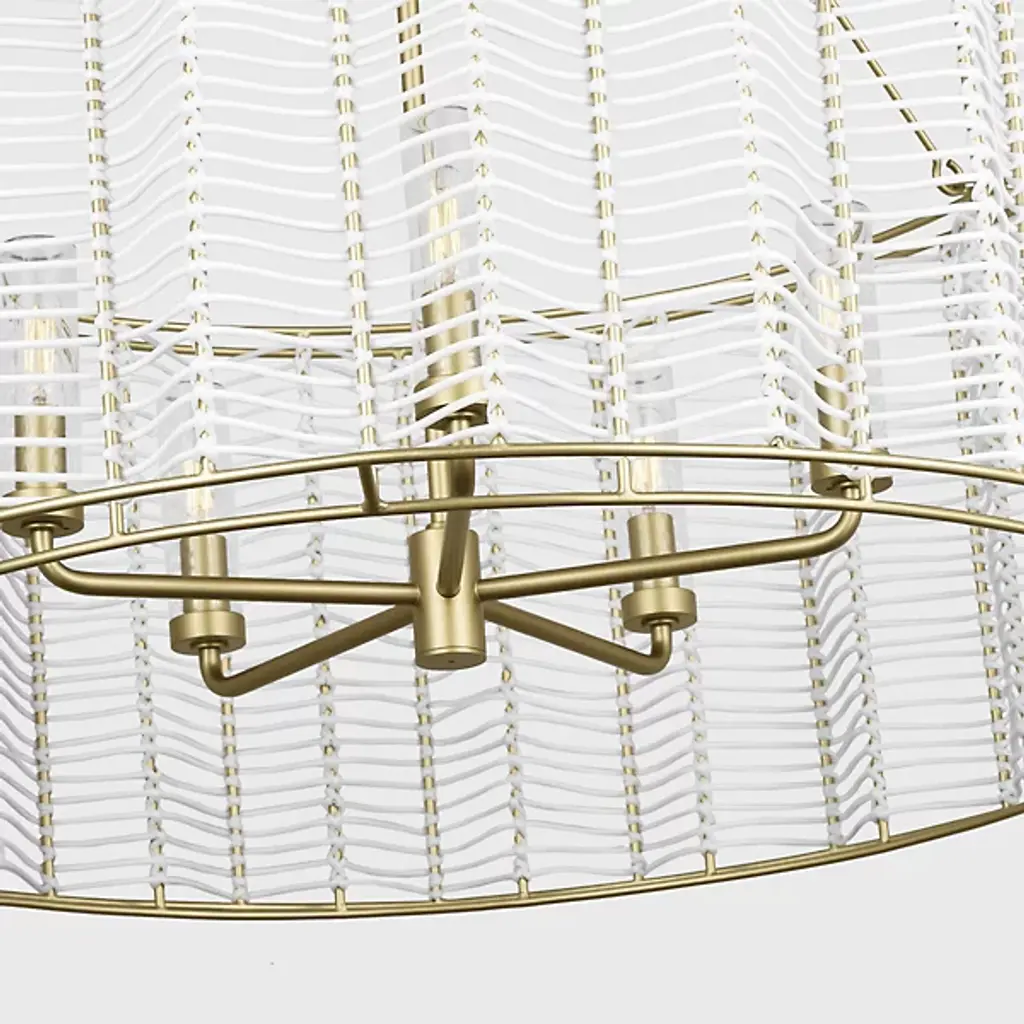 The Winslow Chandelier from Visual Comfort Studio reflects Thom Filicia's innovative approach to traditional patterns. It updates the classic chevron motif into a dynamic three-dimensional form through intricately woven steel strands that surround an interior candelabra. This fixture’s light filters naturally through its open weave pattern and its round form provides excellent distribution of illumination. The suspension’s thoughtful construction balances decorative impact with practical function, making it appropriate for dining areas, entryways, and living rooms where distinctive lighting adds character.