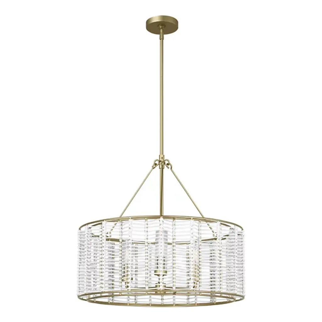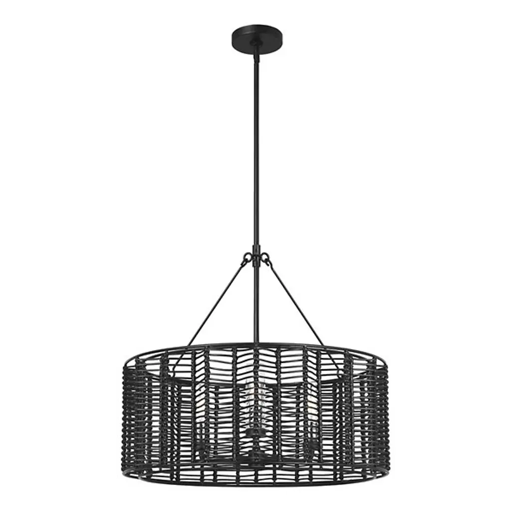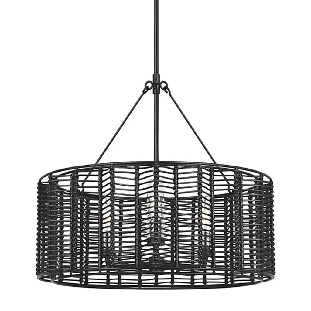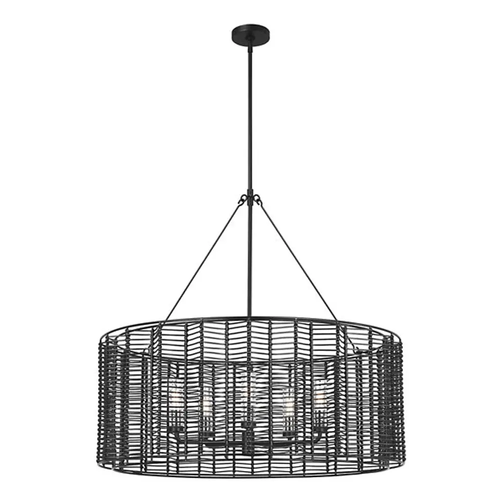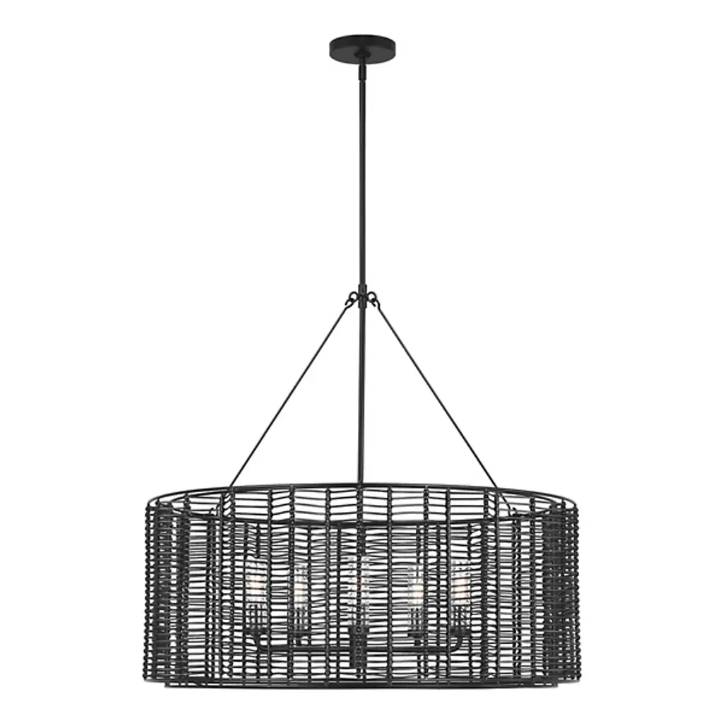 The Winslow Chandelier from Visual Comfort Studio reflects Thom Filicia's innovative approach to traditional patterns. It updates the classic chevron motif into a dynamic three-dimensional form through intricately woven steel strands that surround an interior candelabra. This fixture’s light filters naturally through its open weave pattern and its round form provides excellent distribution of illumination. The suspension’s thoughtful construction balances decorative impact with practical function, making it appropriate for dining areas, entryways, and living rooms where distinctive lighting adds character.
