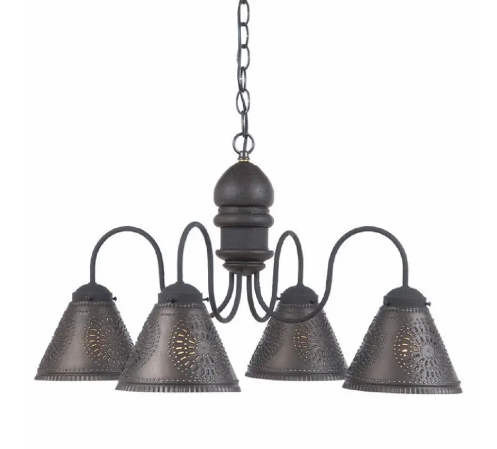 Colonial wood & punched tin chandelier4 arms with punched tin light shadesFour (4) textured black metal down sweeping arms stem from the spun wood center.Each arm leads to a candelabra socket adorned with punch tin shades adding to the rustic, Americana warmth and charm.Available in your choice of 4 distressed textured finishes:Black, plantation red, pearwood and vintage whiteShades are finished in kettle blackA beautiful primitive country design that is sure enhance your dining room or breakfast area with a downcast light for the table and decorative light escaping through the pierced shades.A great piece for your home!Ul listedDirect wired with four candelabra sockets, 60 watts max per arm.Bulbs are not included7 feet of wire, 3 feet of chain, and a matching ceiling plate included.Measures 15h x 26"wMade in USA