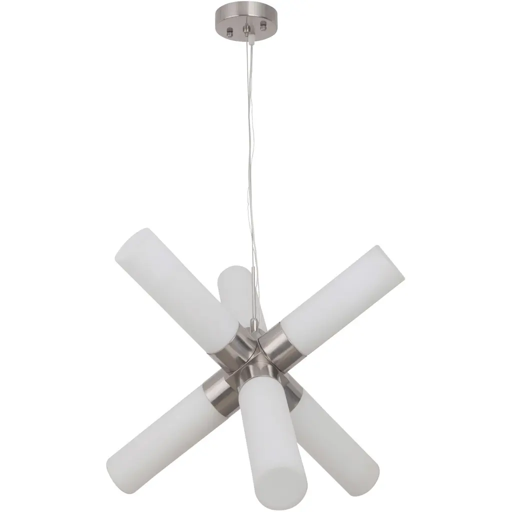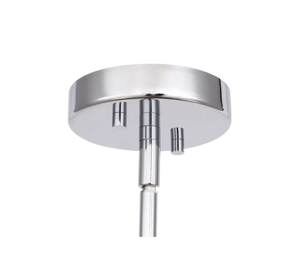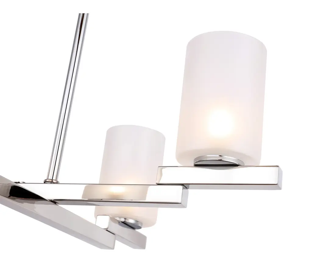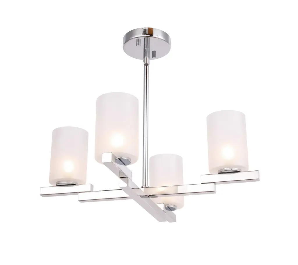 The Jewel collection is a clean contemporary design featuring hexagonal crystal glass that may bring delights to the lives of many. There are multiple fixtures available from mini-pendants to chandeliers to baths.This 4-light chandelier is made of layered square metal tubing with the glass sitting on top like precious gems.Fixture Dimensions: 20.13"D x 35"H (72" Max.)Includes stems 1 x 4" + 1 x 6" + 2 x 12", additional stems available for purchaseChoose from different glass optionsHinged joint for sloped installation