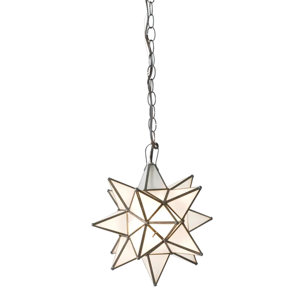 This hand-crafted Moravian star pendant illuminates your home with whimsical sparkle. Antique brass finish and clear glass panes have classic appeal, and petite scaling makes it just the right touch for an intimate dining room, boudoir, or powder room. For added drama, group with our various size offerings to create and ethereal star scape.