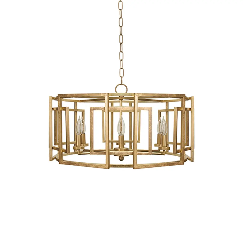 With its layered, concentric square framework and six arm light cluster, the Worlds Away Mckenzie chandelier delivers a rush of warmth and ambiance to your keeping room. 26.5"Dia x 11"H Color: Gold Leaf Wattage: 40W, 6 candelabra bulbs required Chain: 6' matching chain and canopy included Free shipping in the U.S.