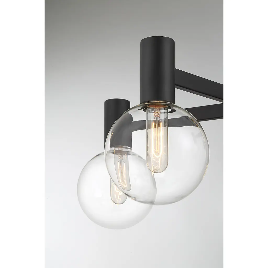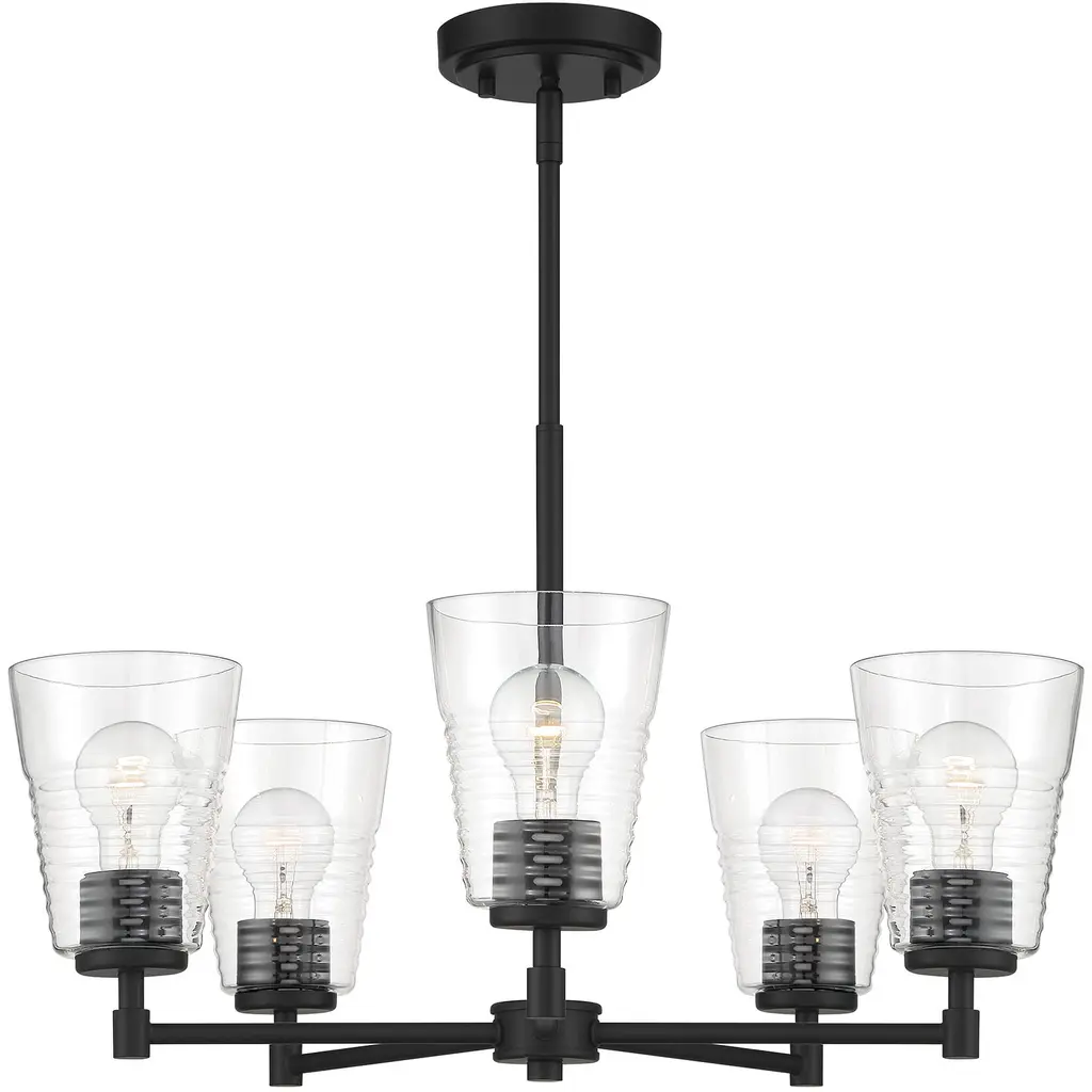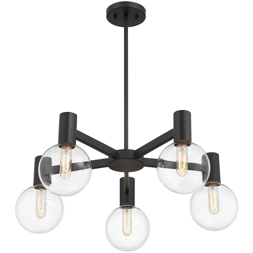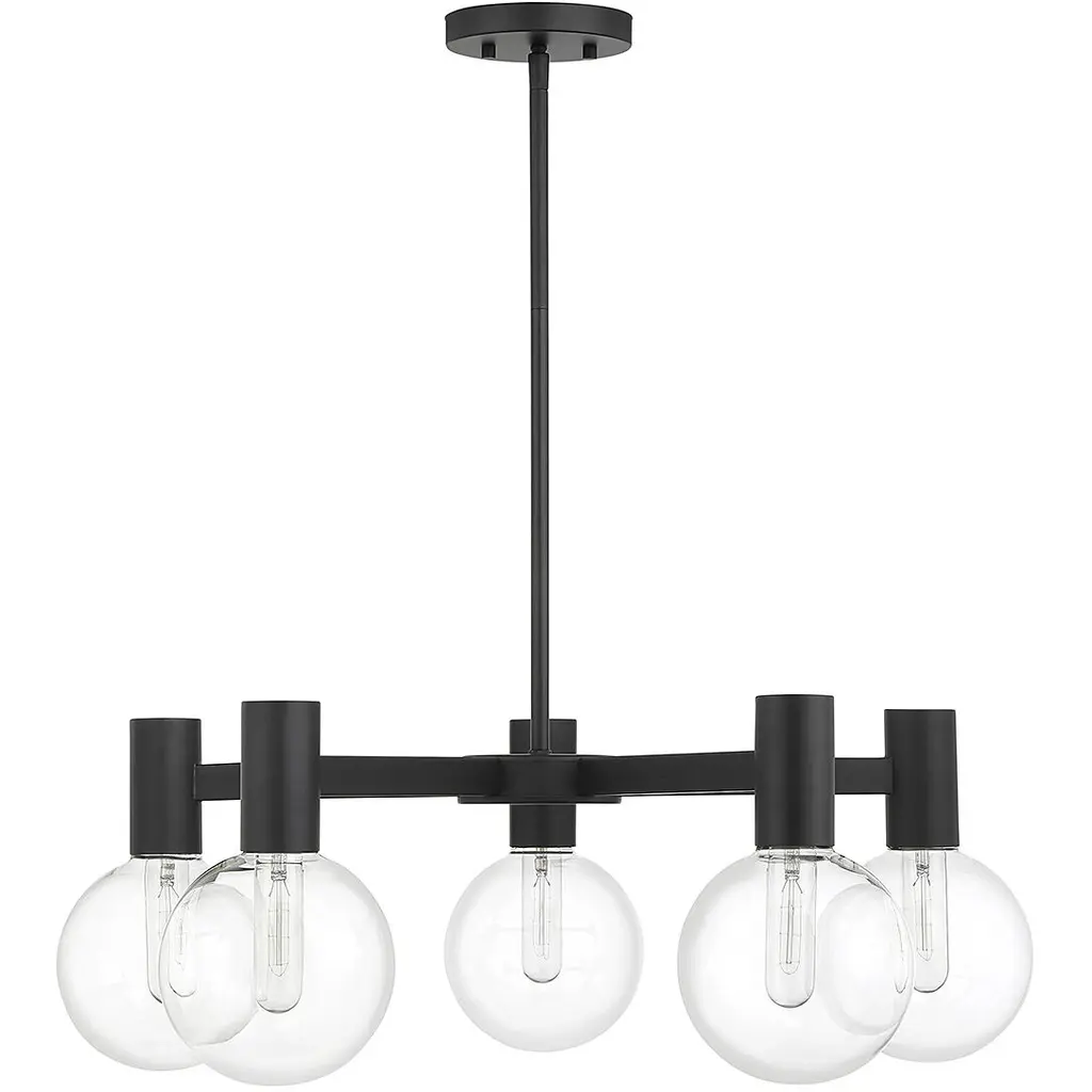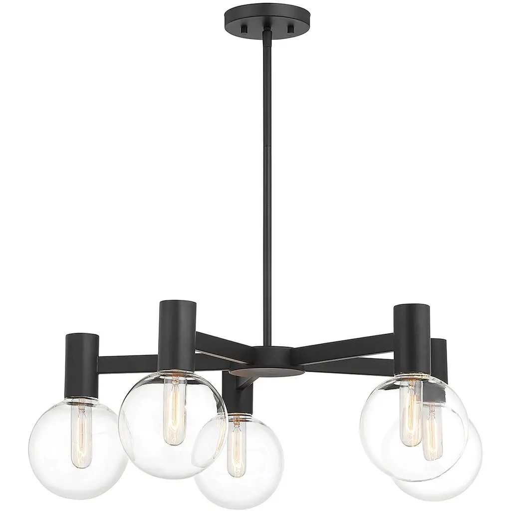 This Savoy House Wright 5-light chandelier showcases streamlined style that makes it ideal for any space. Round clear glass shades add an extra dimension and extra protection for the light bulbs within. Matte black finish. Wright is 28" in width and has an adjustable height ranging from 10.5" to 64". Comes with four 12" downrods and one 6" downrod. Uses 5 standard size bulbs of up to 60 watts per bulb (bulbs not included). We recommend using tubular shaped bulbs.