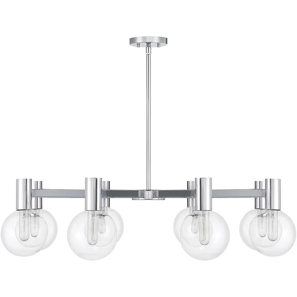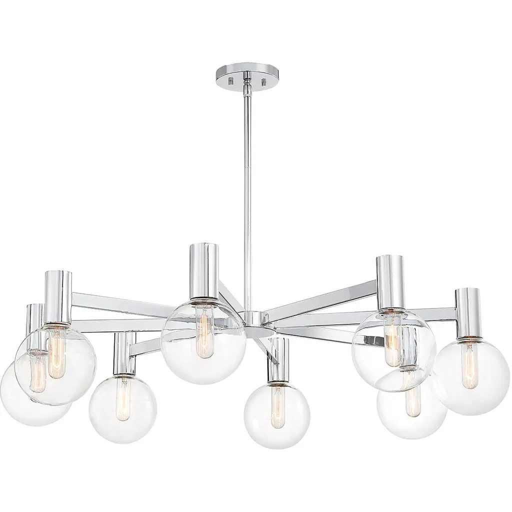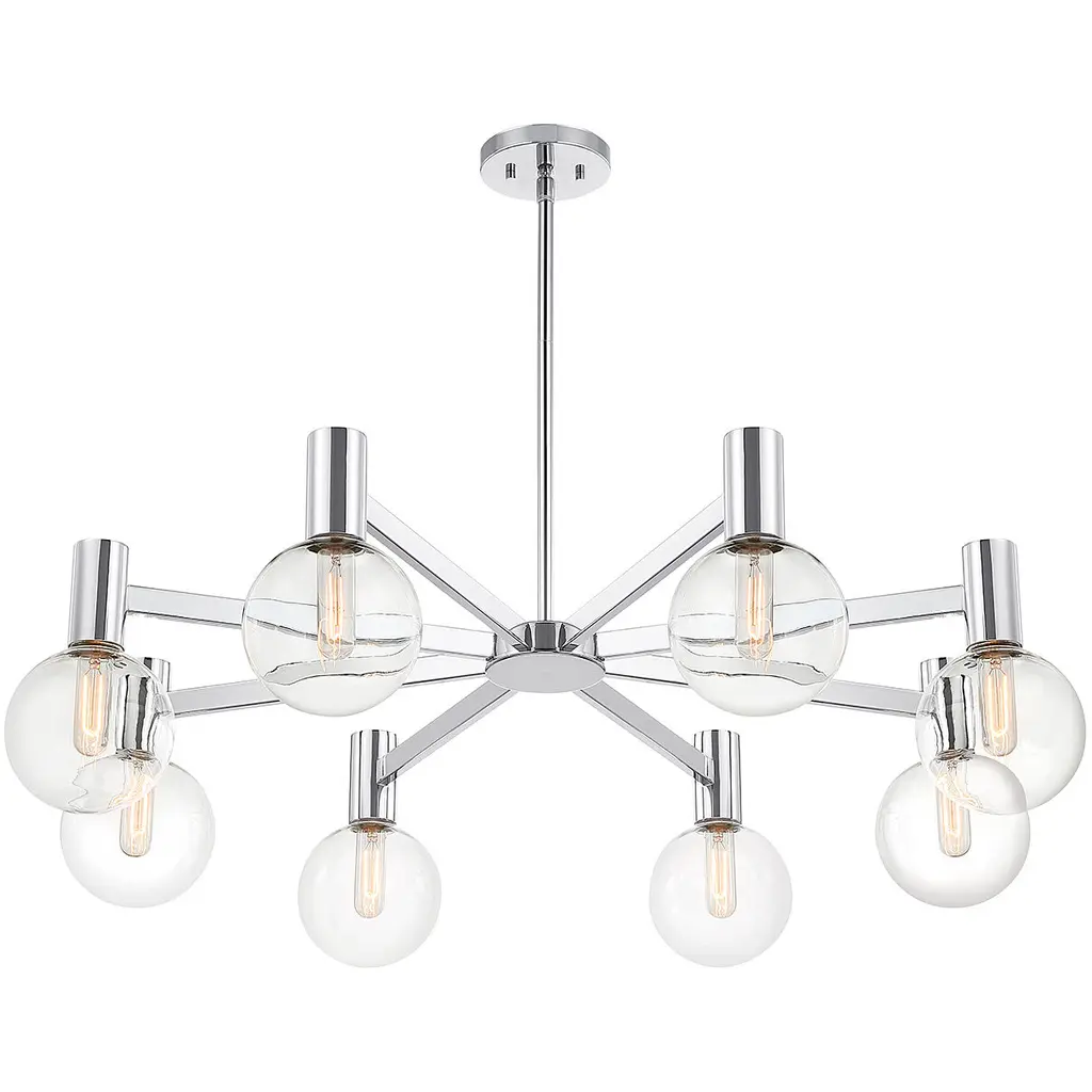 This Savoy House Wright 8-light chandelier showcases large-scale streamlined style that makes it ideal for bigger rooms. Round clear glass shades add an extra dimension and extra protection for the light bulbs within. Chrome finish. Wright is 40" in width and has an adjustable height ranging from 10.5" to 64". Comes with four 12" downrods and one 6" downrod. Uses 8 standard size bulbs of up to 60 watts per bulb (bulbs not included). We recommend using tubular shaped bulbs.