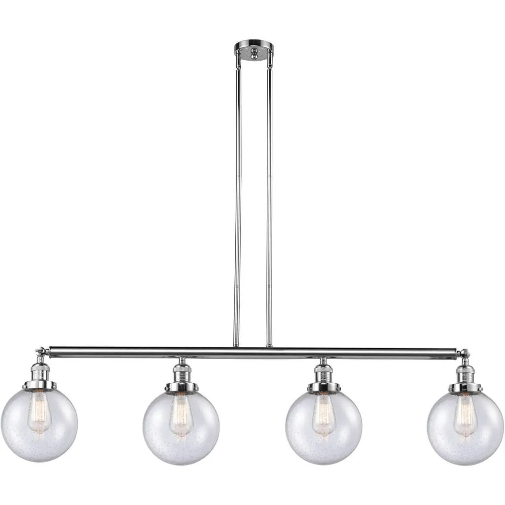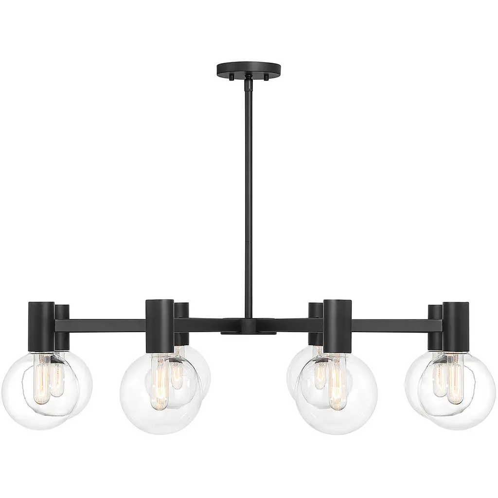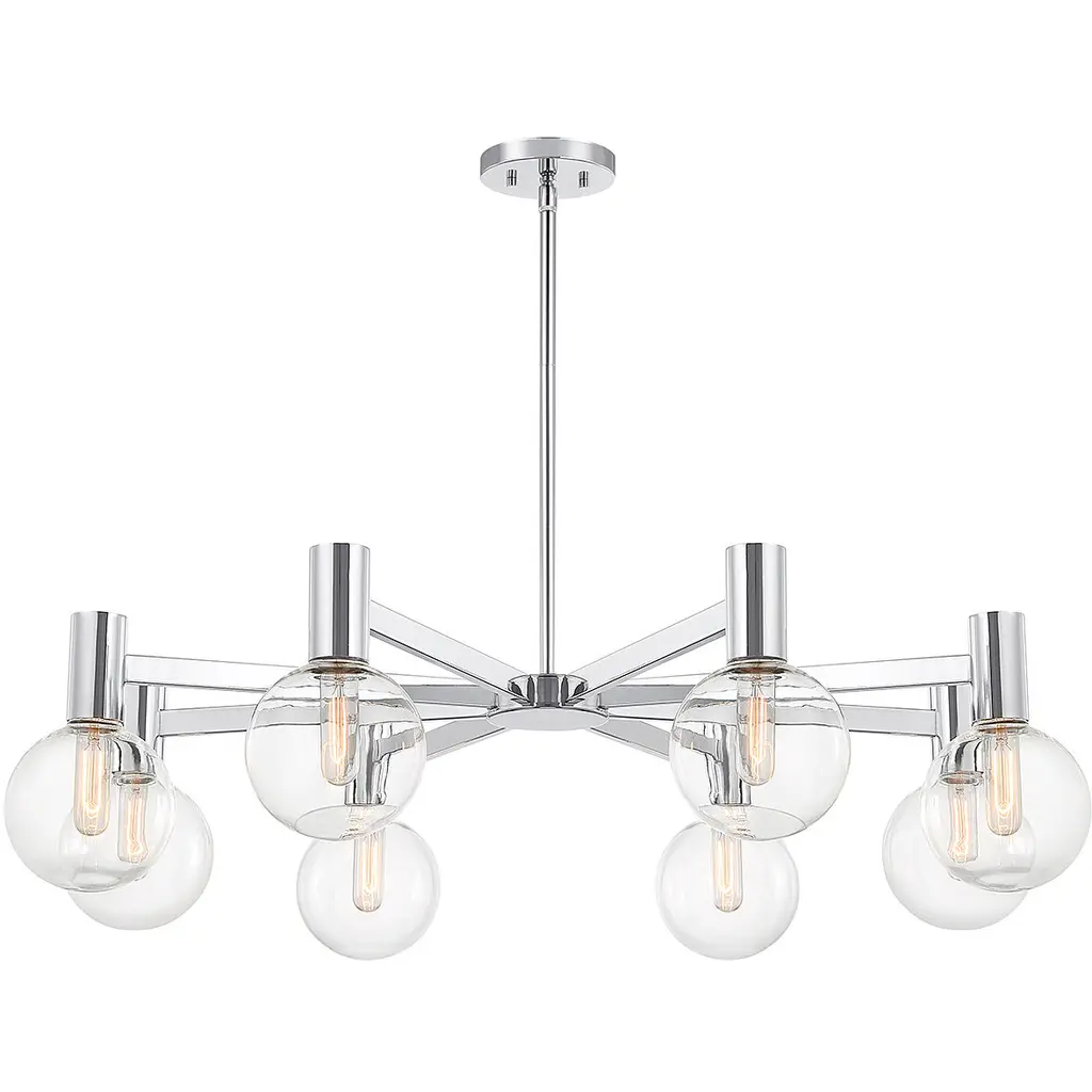 This Savoy House Wright 8-light chandelier showcases large-scale streamlined style that makes it ideal for bigger rooms. Round clear glass shades add an extra dimension and extra protection for the light bulbs within. Chrome finish. Wright is 40" in width and has an adjustable height ranging from 10.5" to 64". Comes with four 12" downrods and one 6" downrod. Uses 8 standard size bulbs of up to 60 watts per bulb (bulbs not included). We recommend using tubular shaped bulbs.