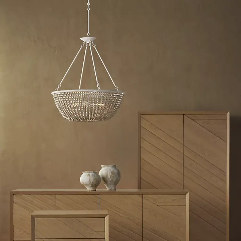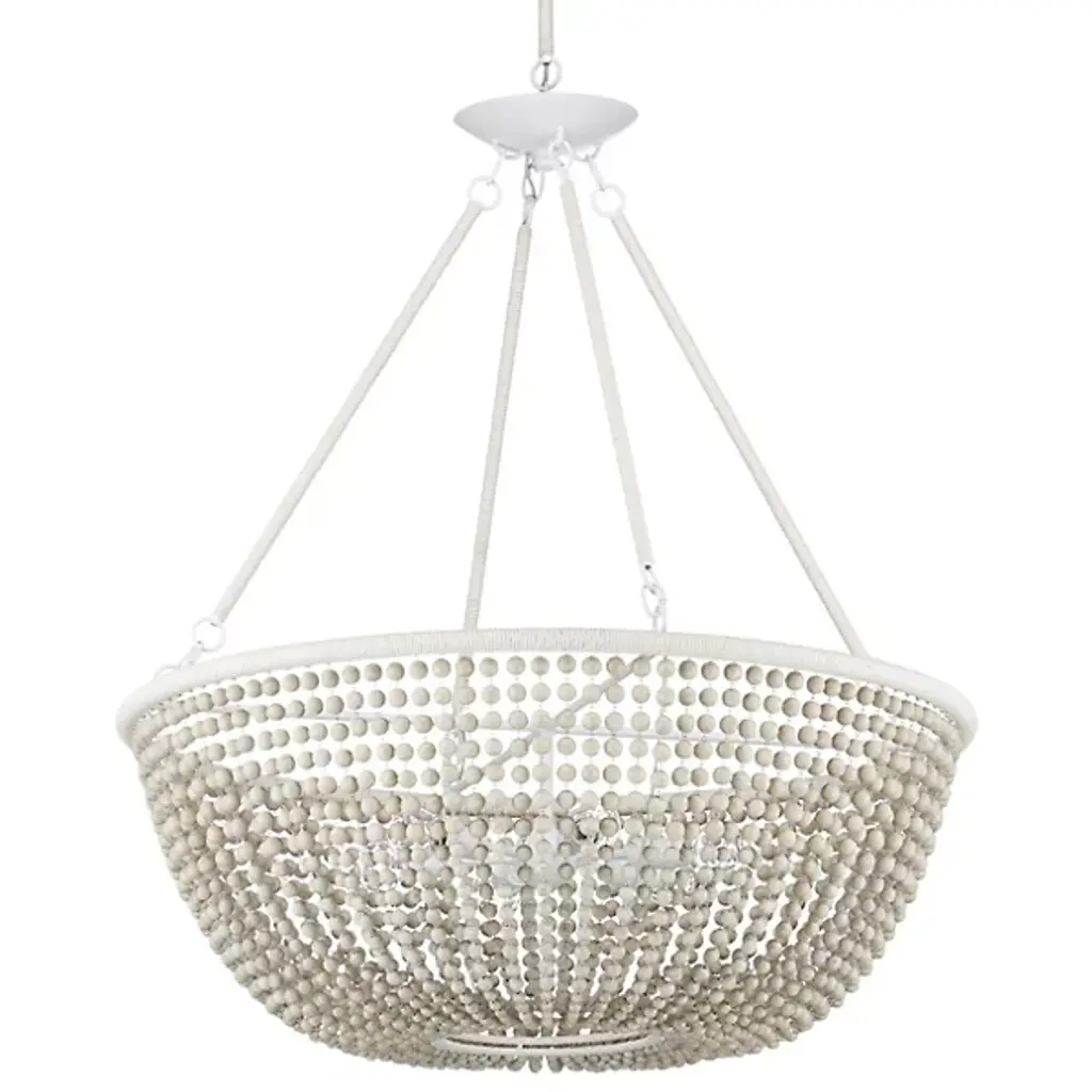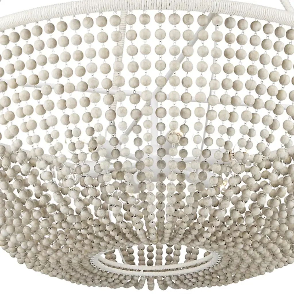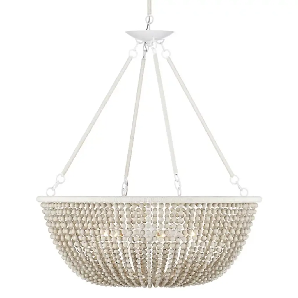 The Wychwood Chandelier from Currey & Company pairs handpainted wooden beads with kraft paper twine to create an artisanal masterpiece. The carefully crafted swags drape between rings while multiple materials work in harmony - from wrought iron to natural wood beads. This versatile fixture can be installed as either a chandelier or semi-flush mount using the included hardware. The design celebrates handcraftsmanship through its intricate details and thoughtful material combinations. Its adjustable hanging options ensure perfect placement in any setting.
